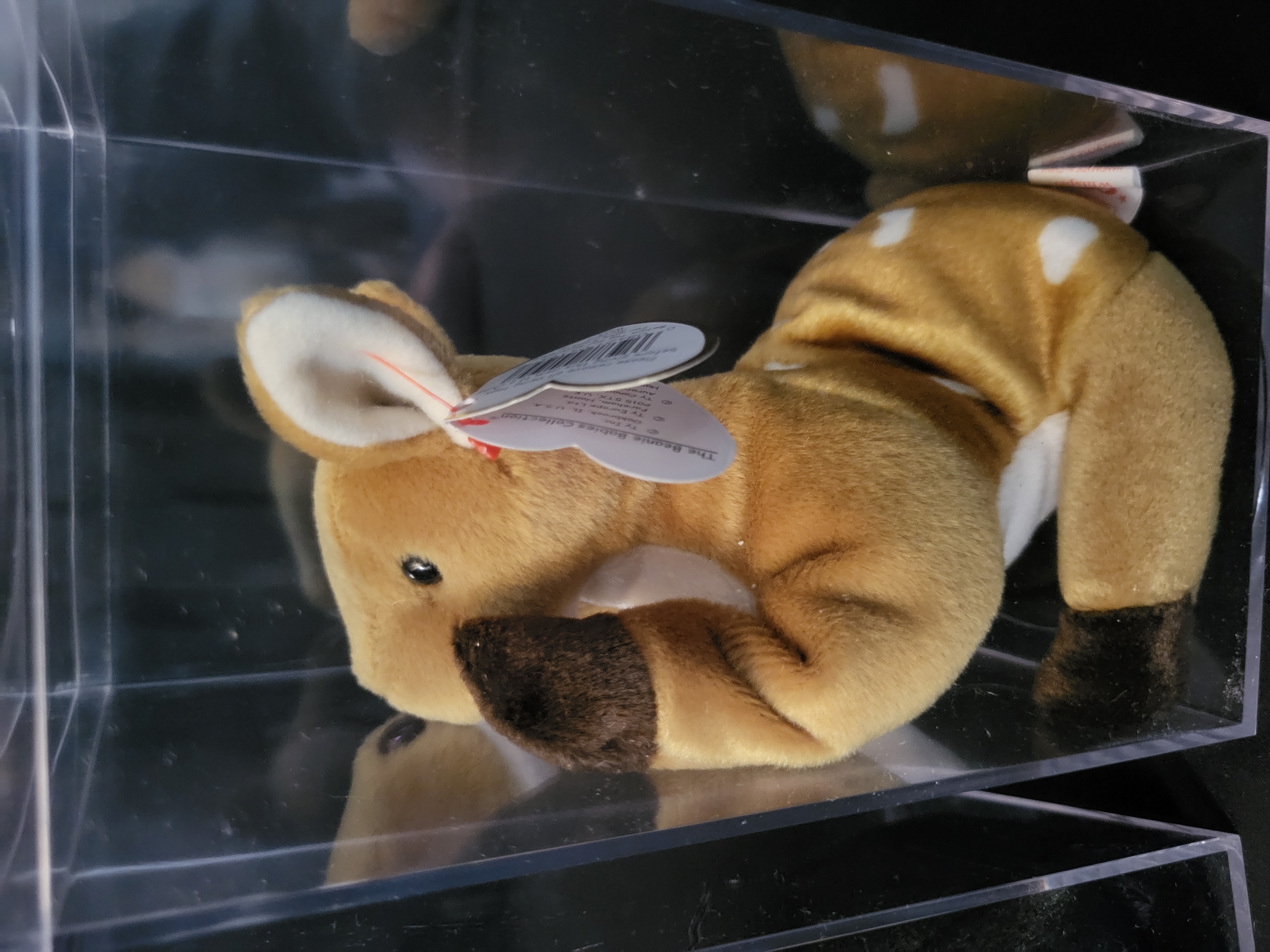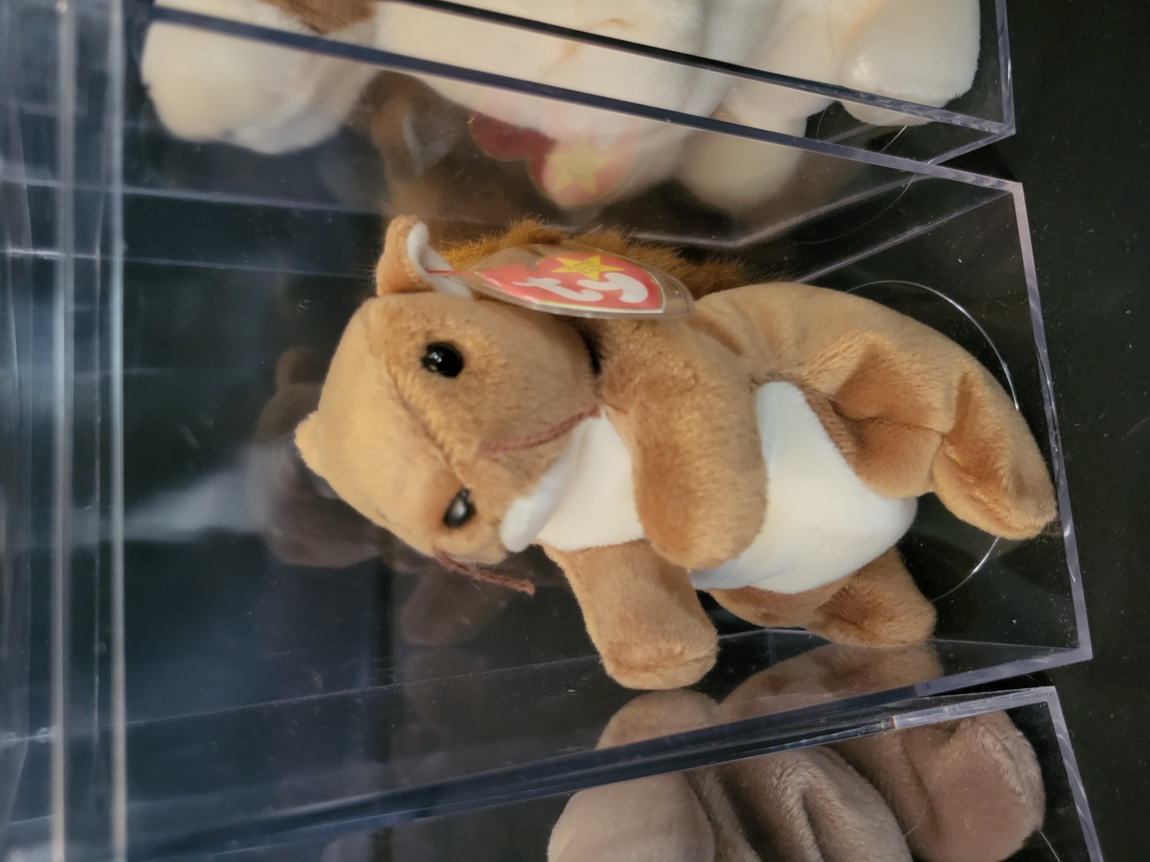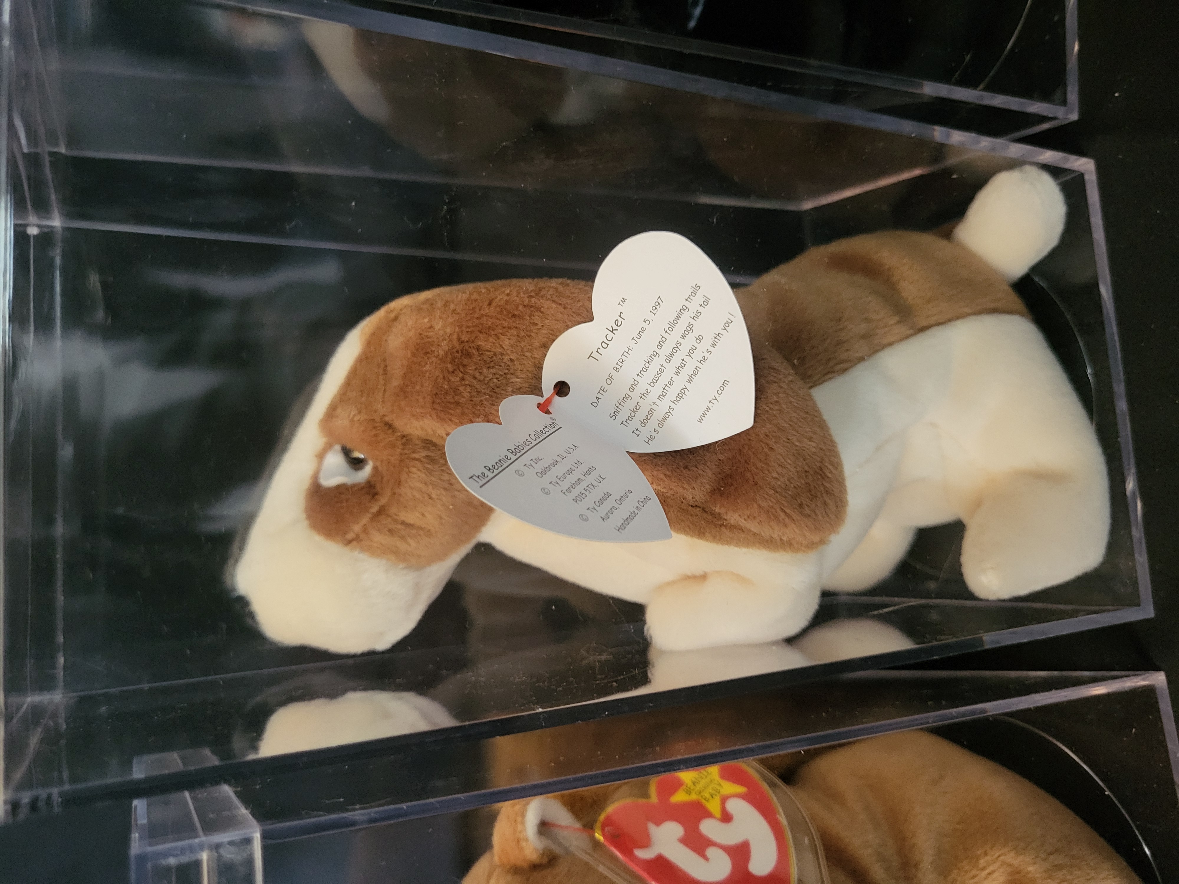 BID PER WHAT YOU SEE IN THE PHOTO, NOT THE AI GENERATED TITLES AND DESCRIPTIONS! A collection of Ty Beanie Babies plush animal characters. The group includes Tracker the basset hound, Ringo the raccoon, Nuts the squirrel, Luke the dog, and Whisper the deer. Each character is constructed from plush fabric with internal bead filling. Every item retains its original heart-shaped paper hang tag featuring the series title The Beanie Babies Collection along with specific character names and birth dates ranging from the mid-to-late 1990s. Tracker is specifically identified with a birth date of June 5, 1997. Each plush is presented within an individual clear acrylic display case.
