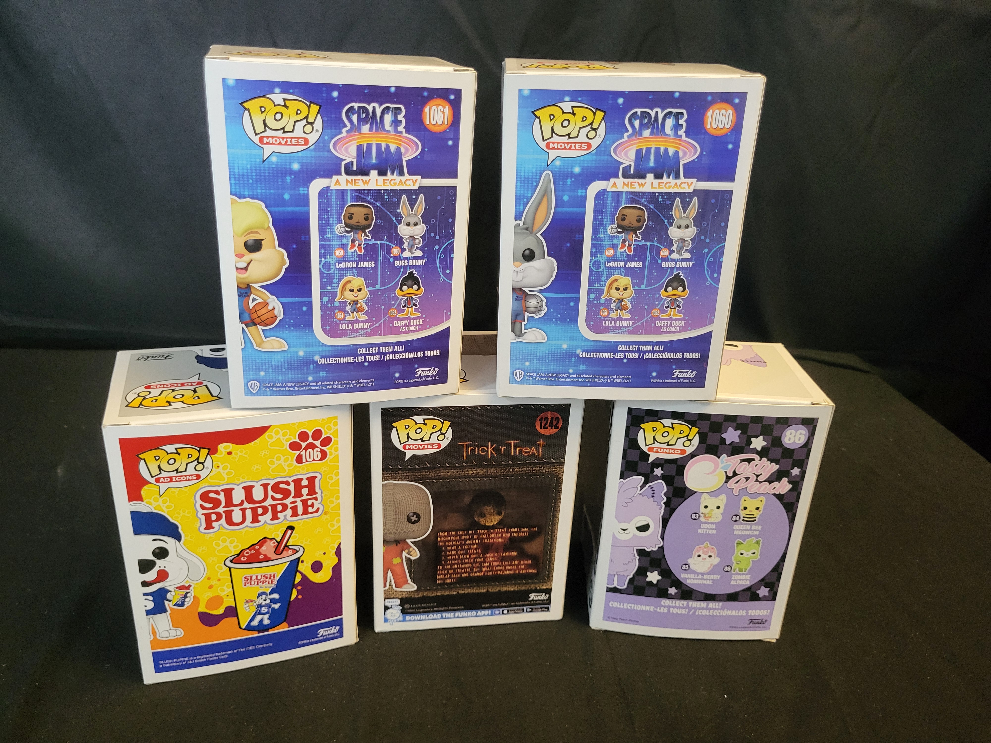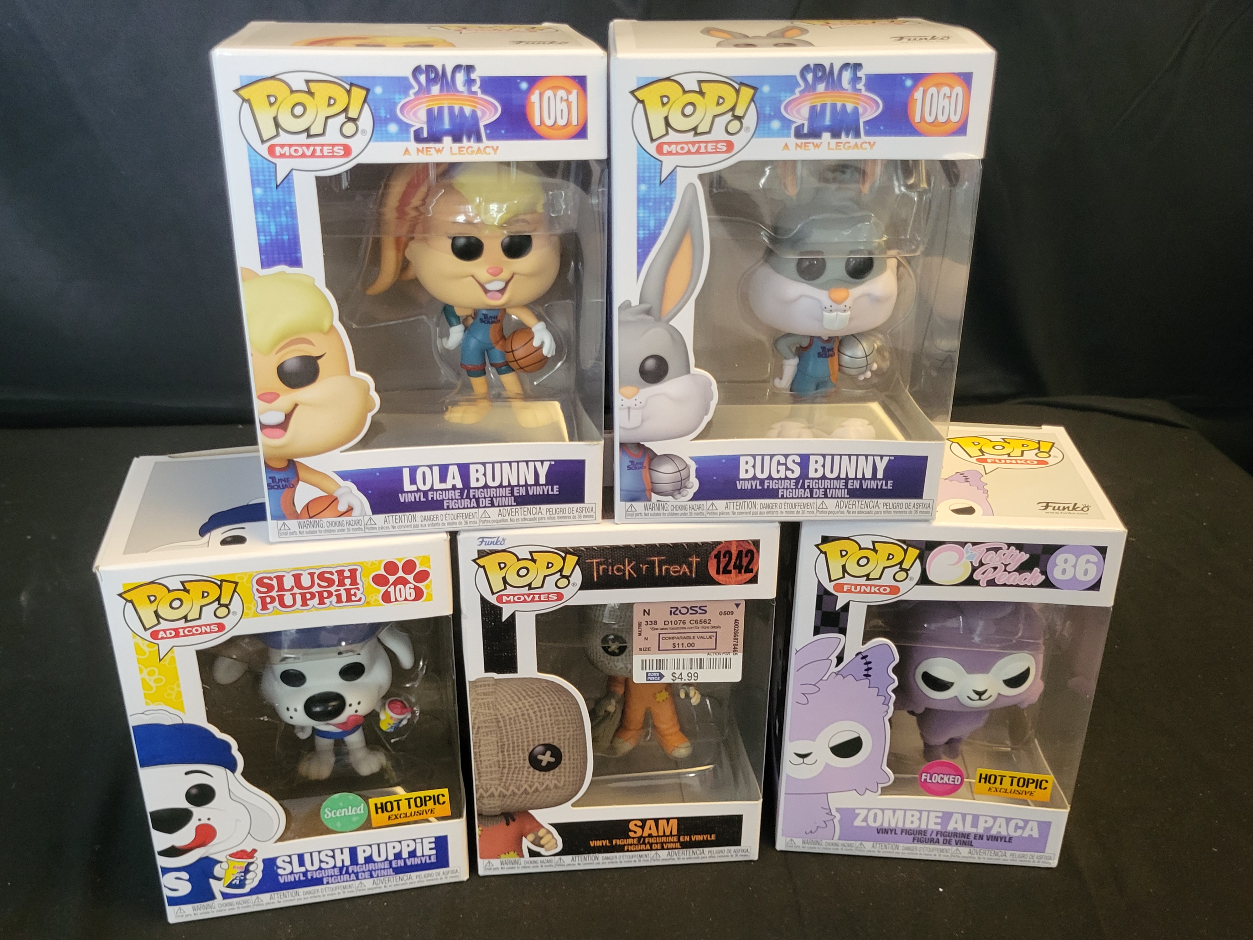 BID PER WHAT YOU SEE IN THE PHOTO, NOT THE AI GENERATED TITLES AND DESCRIPTIONS! A collection of Funko Pop! vinyl figures in original manufacturer window boxes. The assortment features characters from various entertainment and commercial properties, including Lola Bunny (#1061) and Bugs Bunny (#1060) from the film Space Jam: A New Legacy. Also included are a scented Slush Puppie (#106) from the Ad Icons series, Sam (#1242) from the movie Trick r Treat, and a flocked Zombie Alpaca (#86) from the Tasty Peach series. The figures are constructed of molded vinyl and the packaging includes multilingual text in English, French, and Spanish. Several boxes display promotional and retailer-specific stickers, including Hot Topic Exclusive, Flocked, and Scented designations. One box retains a secondary retailer price label on the front window.
