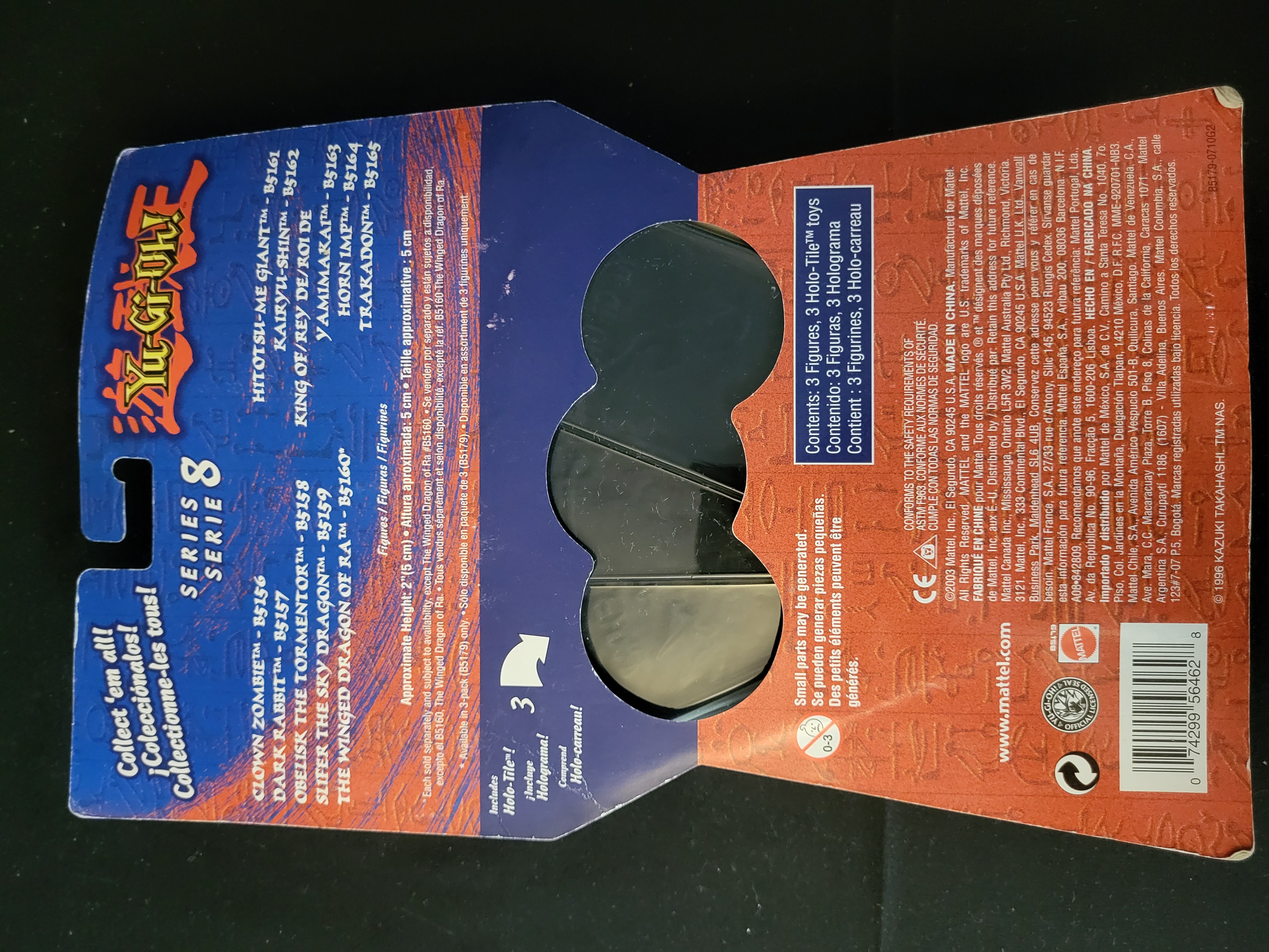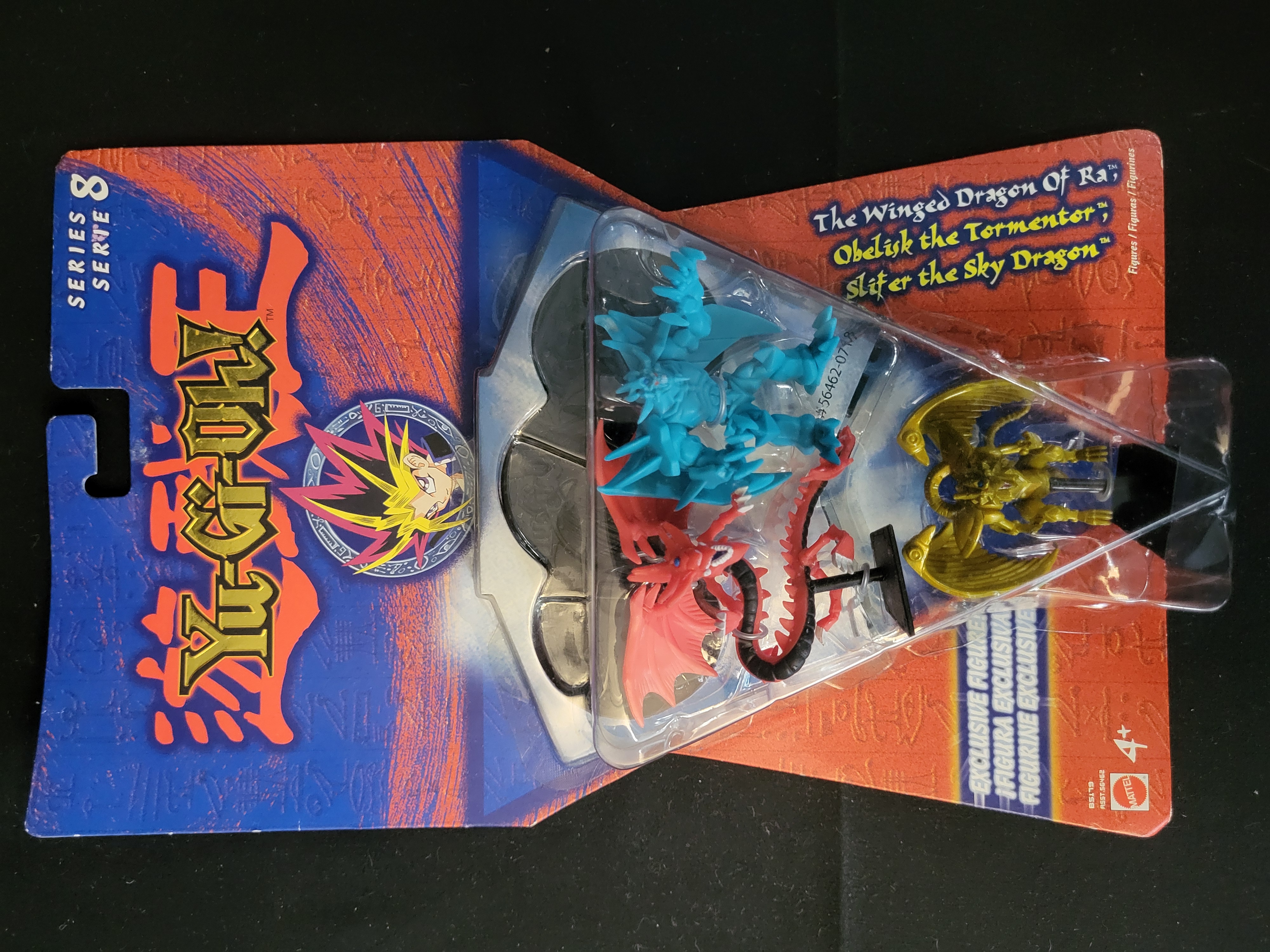 BID PER WHAT YOU SEE IN THE PHOTO, NOT THE AI GENERATED TITLES AND DESCRIPTIONS! Mattel Yu-Gi-Oh! Series 8 action figure 3-pack. This set of three plastic figurines, manufactured in 2003, features the characters The Winged Dragon of Ra, Obelisk the Tormentor, and Slifer the Sky Dragon. The figures are molded in gold, blue, and red plastic and are each mounted on a black display stand. The collection is presented in its original, unopened retail packaging, consisting of a color-printed cardstock backer with Egyptian-themed graphics and a clear, triangular plastic blister pack. The reverse side specifies the inclusion of three Holo-Tile accessories and provides product information in English, Spanish, and French.