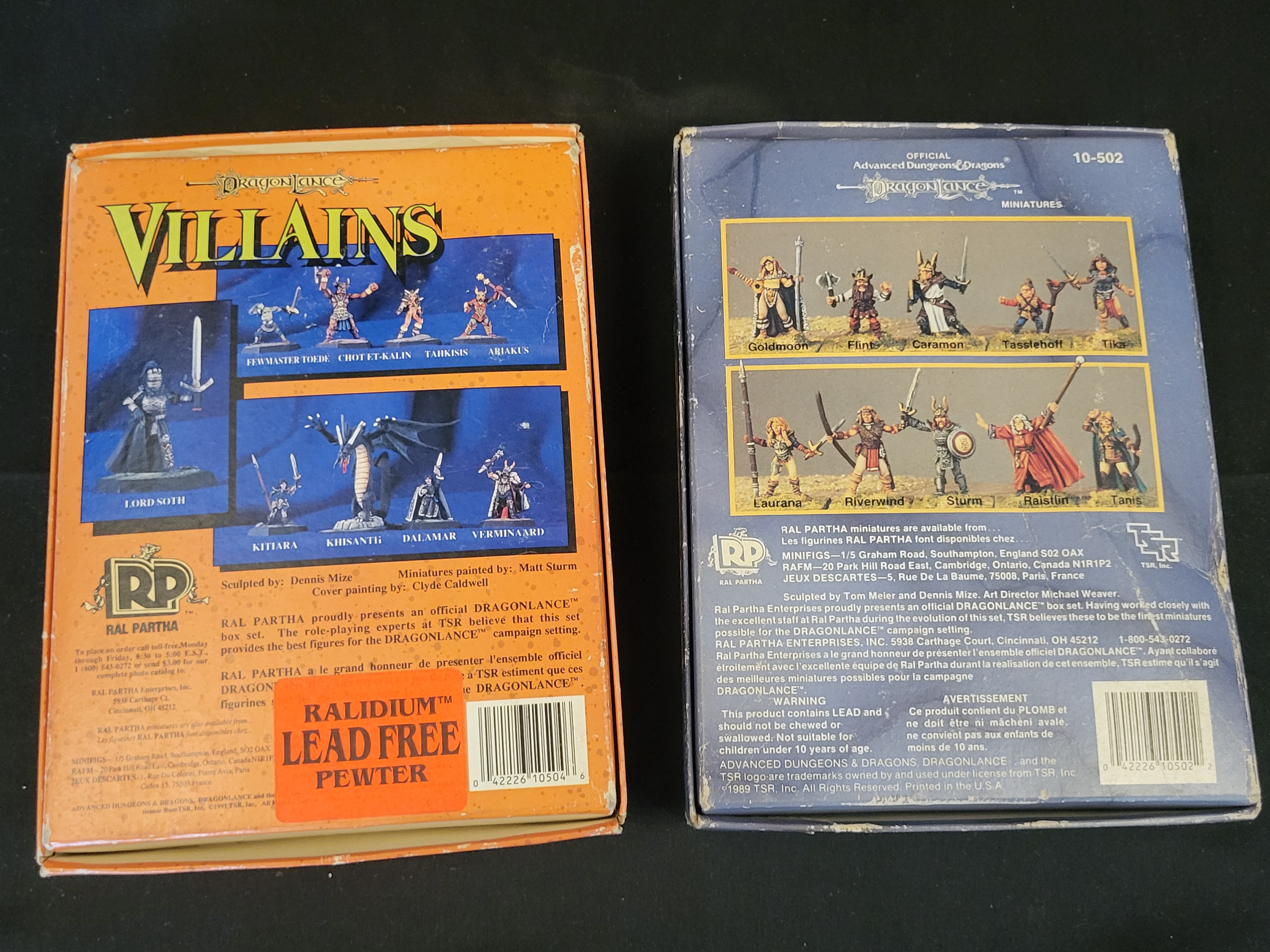 BID PER WHAT YOU SEE IN THE PHOTO, NOT THE AI GENERATED TITLES AND DESCRIPTIONS! A pair of boxed sets of Ral Partha 25mm scale metal miniatures for the Advanced Dungeons & Dragons Dragonlance campaign setting, comprising the Heroes (item 10-502) and Villains (item 10-504) collections. Produced circa 1989-1991 under license from TSR, Inc., these sets feature characters sculpted by Tom Meier and Dennis Mize. The Heroes set includes figures such as Raistlin, Tanis, Goldmoon, and Flint. The Villains set includes Lord Soth, Kitiara, and others. The miniatures are unpainted and housed within their original foam-lined boxes. Each set is accompanied by period promotional inserts for official AD&D paints. The Villains box features a RALIDIUM Lead Free Pewter sticker on the reverse.