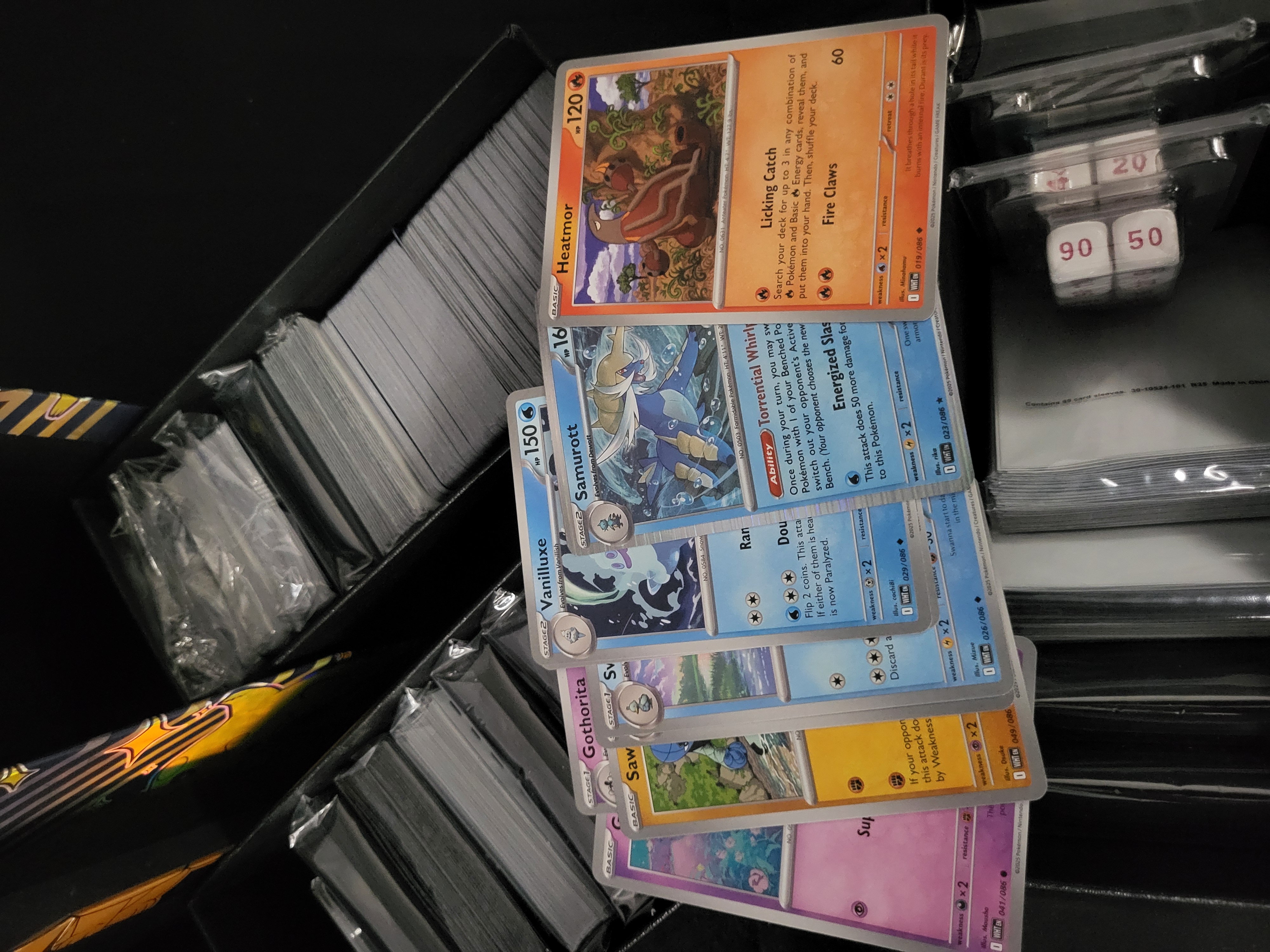 BID PER WHAT YOU SEE IN THE PHOTO, NOT THE AI GENERATED TITLES AND DESCRIPTIONS! A collection of Pokémon Trading Card Game (TCG) cards and gaming accessories. The lot features several black cardboard storage boxes, including one prominently marked Shining Fates with a stylized Pikachu illustration. Contained within the boxes are multiple stacks of cards, many of which are housed in clear plastic protective sleeves. Visible cards include examples such as Heatmor, Samurott, Vanilluxe, and Gothorita, bearing copyright markings from 2021. The lot also includes various packs of white and red damage counter dice.