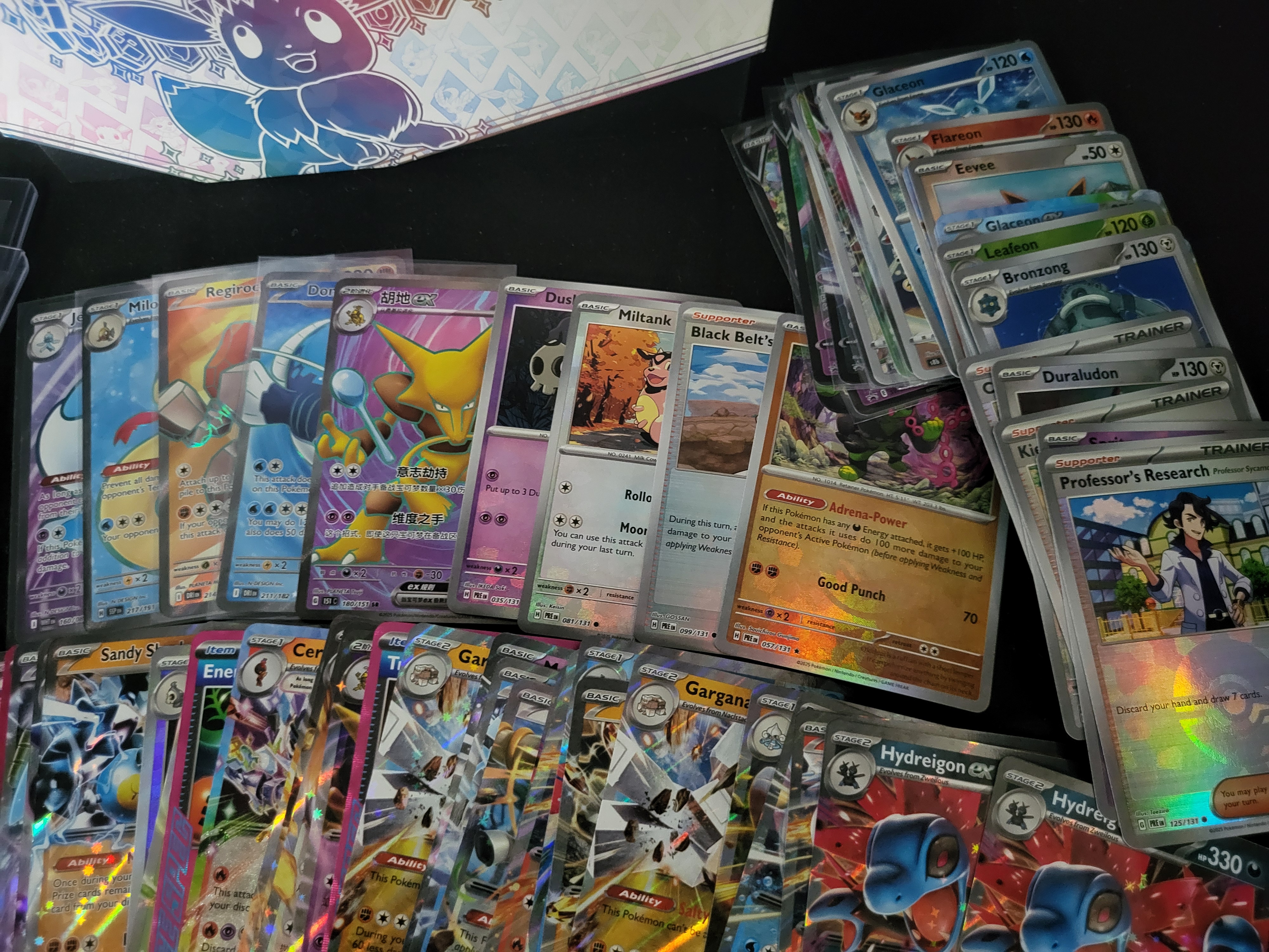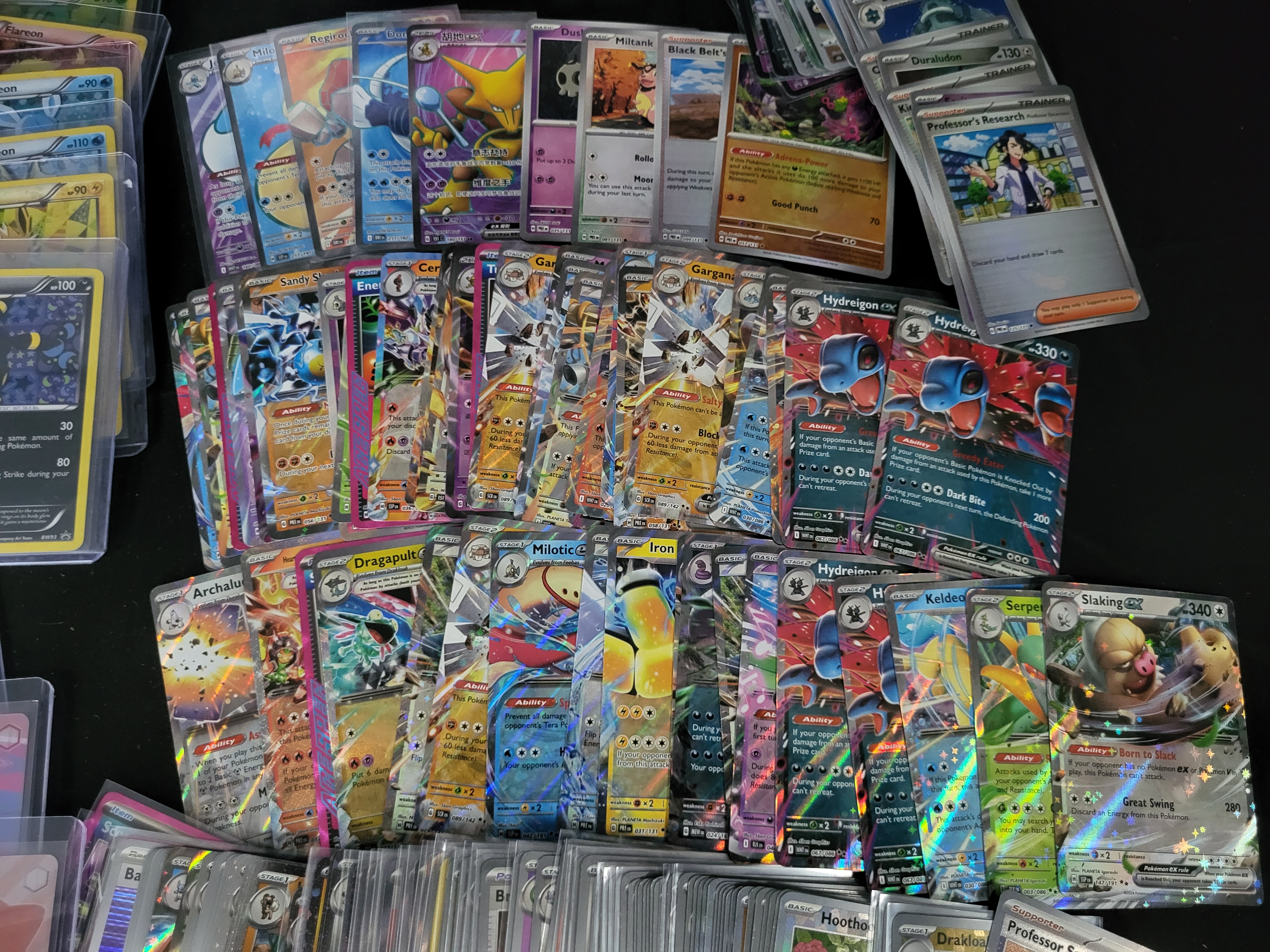 BID PER WHAT YOU SEE IN THE PHOTO, NOT THE AI GENERATED TITLES AND DESCRIPTIONS! This collection consists of an assortment of Pokemon Trading Card Game cards, featuring various sets such as Scarlet & Violet and Prismatic Evolutions. The lot contains a variety of holographic, full-art, and ex cards, including Hydreigon ex, Slaking ex, and a Japanese-language Alakazam ex. The cards are accompanied by trainer cards, including Professor Sada’s Vitality and Professor’s Research, as well as energy cards. Also included are several non-Pokemon anime-style trading cards. Many cards are stored in protective sleeves and semi-rigid top loaders. The collection is presented with a Scarlet & Violet – Prismatic Evolutions Pokemon Center Elite Trainer Box.