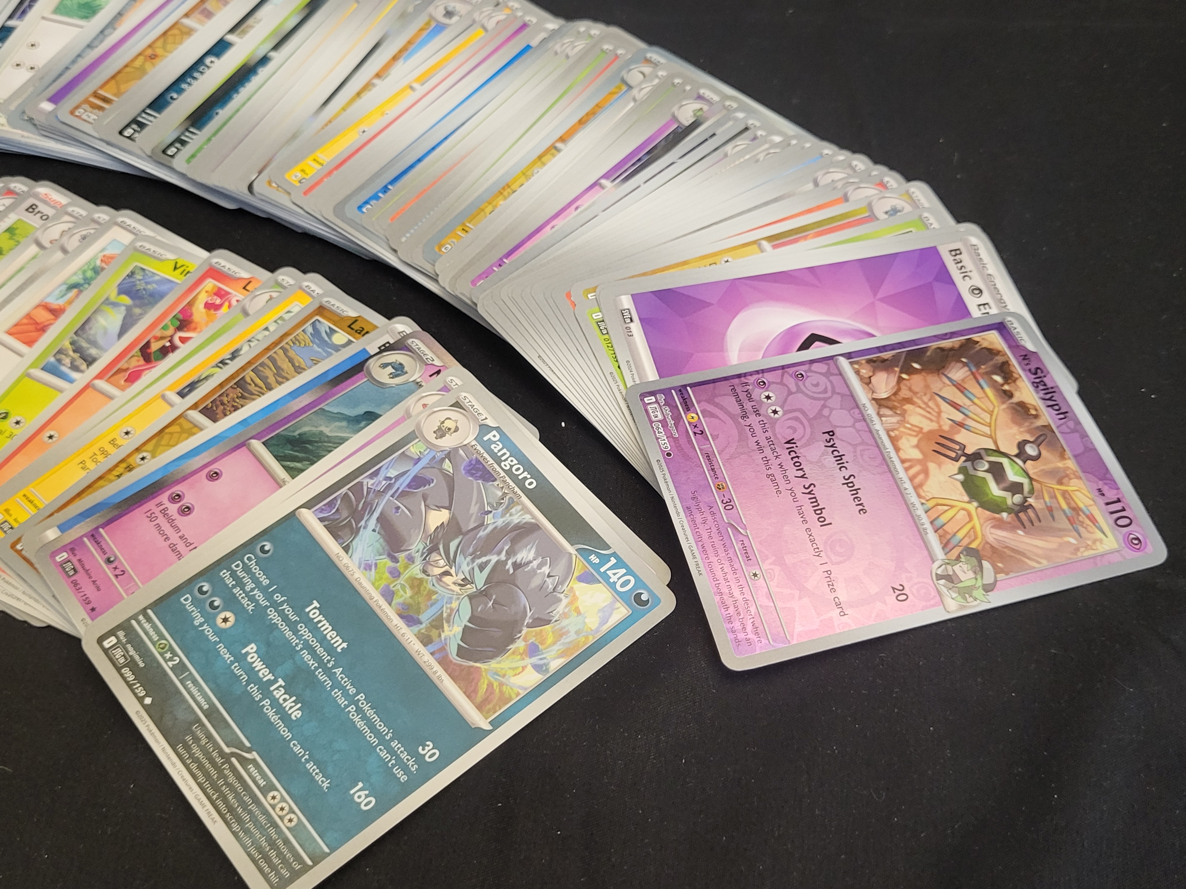 BID PER WHAT YOU SEE IN THE PHOTO, NOT THE AI GENERATED TITLES AND DESCRIPTIONS! A collection of modern Pokemon Trading Card Game (TCG) cards, primarily dating to circa 2023. The cards are printed on standard cardstock and feature the silver-bordered design characteristic of recent expansions. The assortment includes a variety of Pokemon, Trainer, and Energy cards across different evolution stages. Notable cards identified within the group include Pangoro (099/159), Sigilyph (064/159), N’s Darmanitan (027/159), and N’s Sigilyph (064/159). Copyright markings for Nintendo, Creatures, and GAME FREAK are visible on the card faces. The collection includes Basic Pokemon, Stage 1, and Stage 2 evolutions, as well as special character-themed cards.