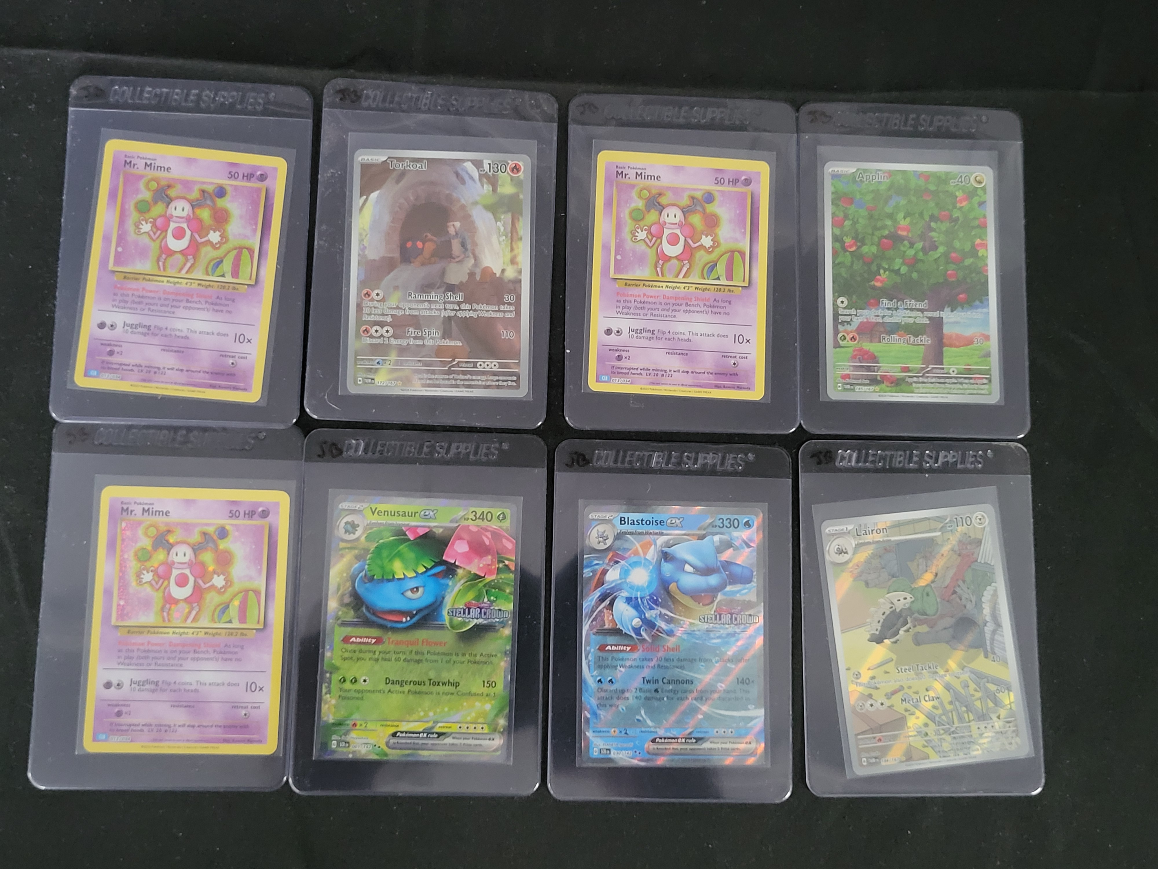BID PER WHAT YOU SEE IN THE PHOTO, NOT THE AI GENERATED TITLES AND DESCRIPTIONS! A collection of modern Pokemon trading cards from various recent expansions. The group includes three Mr. Mime cards (013/034) from the Pokemon Trading Card Game Classic collection, featuring holographic finishes. Also included are three Illustration Rare cards from the Scarlet and Violet Twilight Masquerade expansion: Torkoal (172/167), Applin (185/167), and Lairon (184/167). The lot is completed by two cards from the Scarlet and Violet Stellar Crown expansion: Venusaur ex (001/142) and Blastoise ex (030/142), both featuring the expansion logo on the card art. Each card is individually housed in a semi-rigid plastic holder.