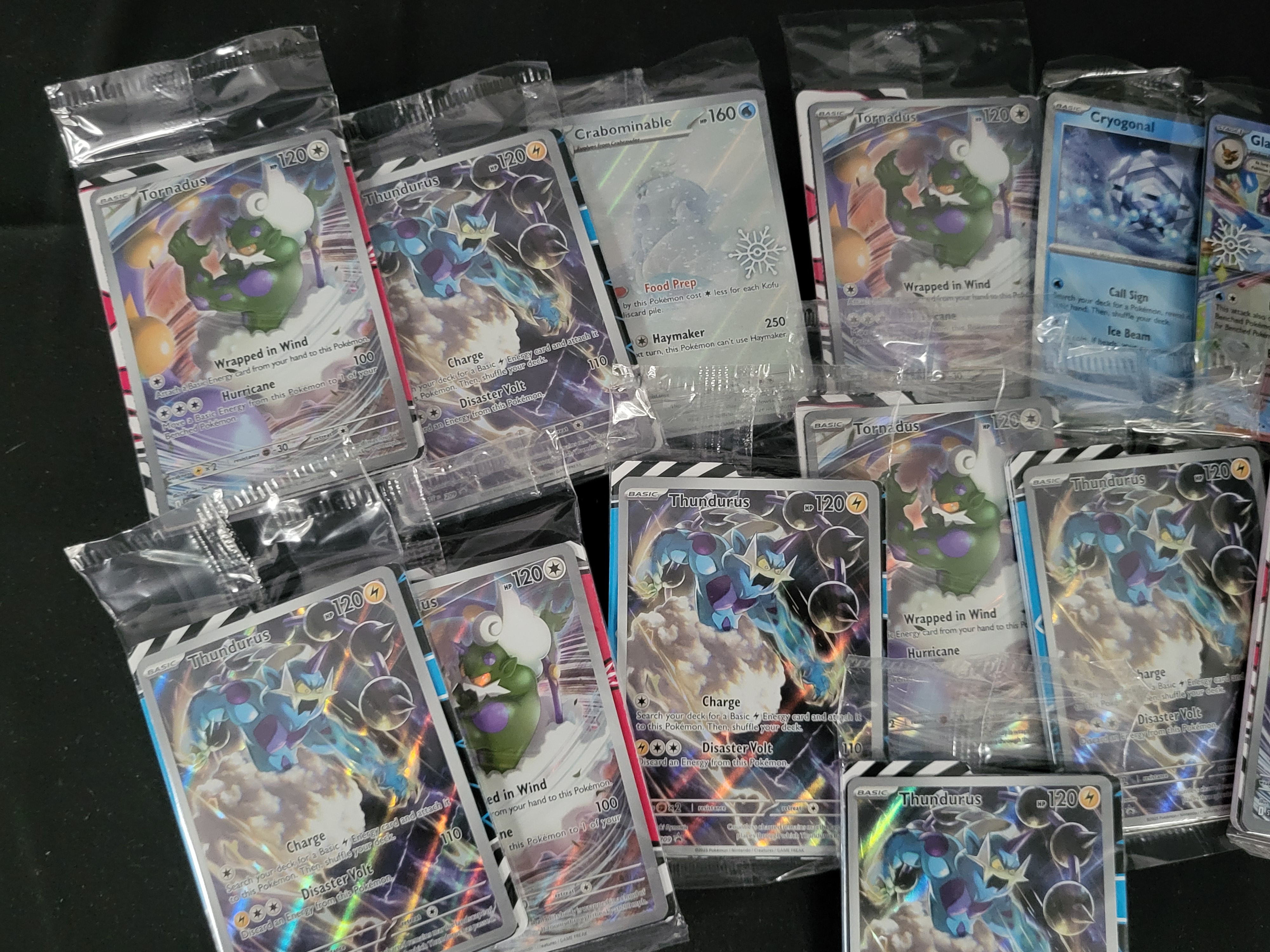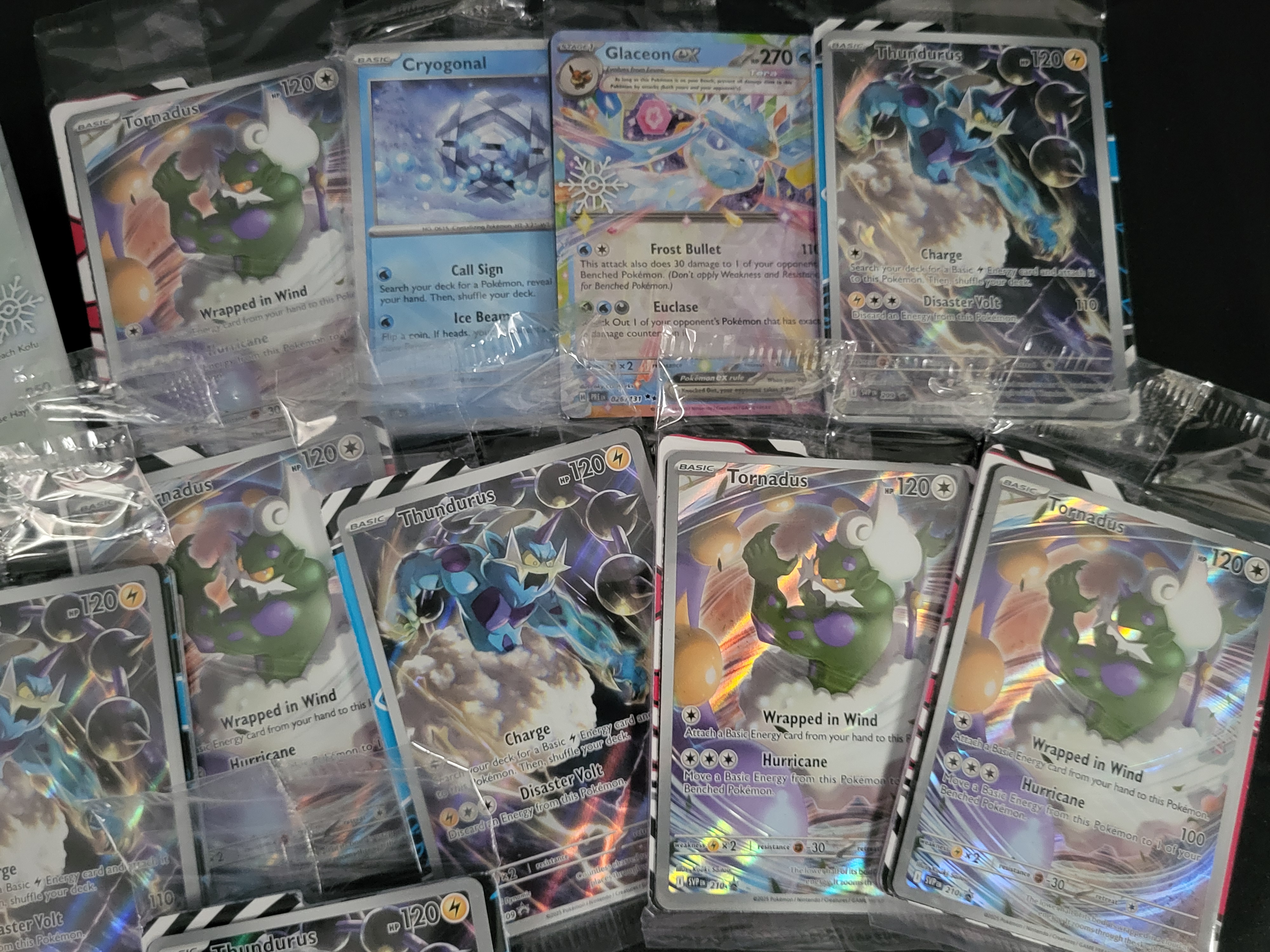 BID PER WHAT YOU SEE IN THE PHOTO, NOT THE AI GENERATED TITLES AND DESCRIPTIONS! A collection of modern Pokemon trading cards, primarily consisting of Scarlet and Violet Black Star Promo cards. The assortment includes multiple copies of Tornadus (SVP 210) and Thundurus (SVP 209), alongside other cards such as Crabominable, Cryogonal, and a Glaceon ex Tera card. The cards are printed on cardstock with full-color character illustrations and holographic foil finishes. Each card is individually housed in its original, sealed clear plastic promotional packaging.