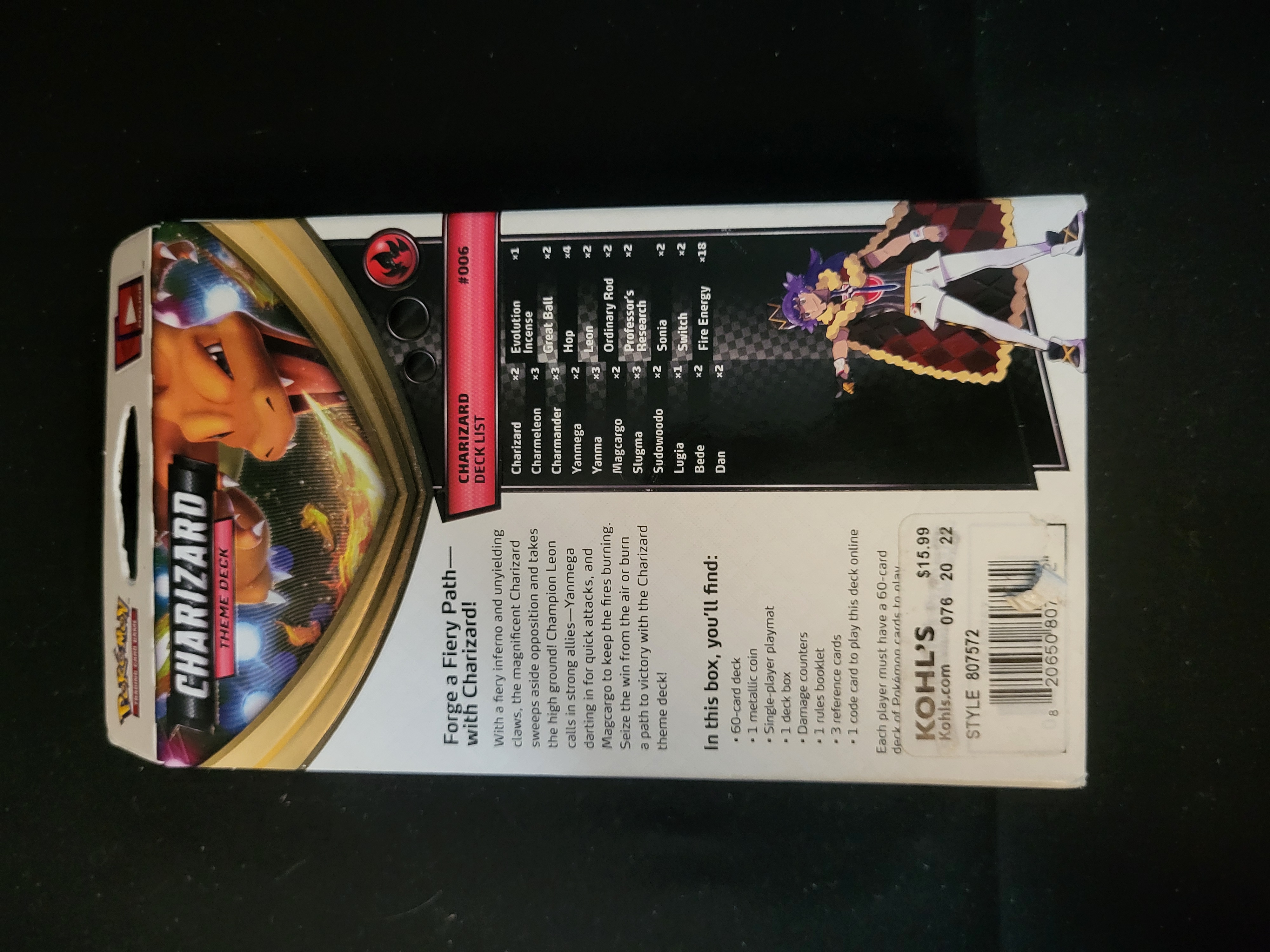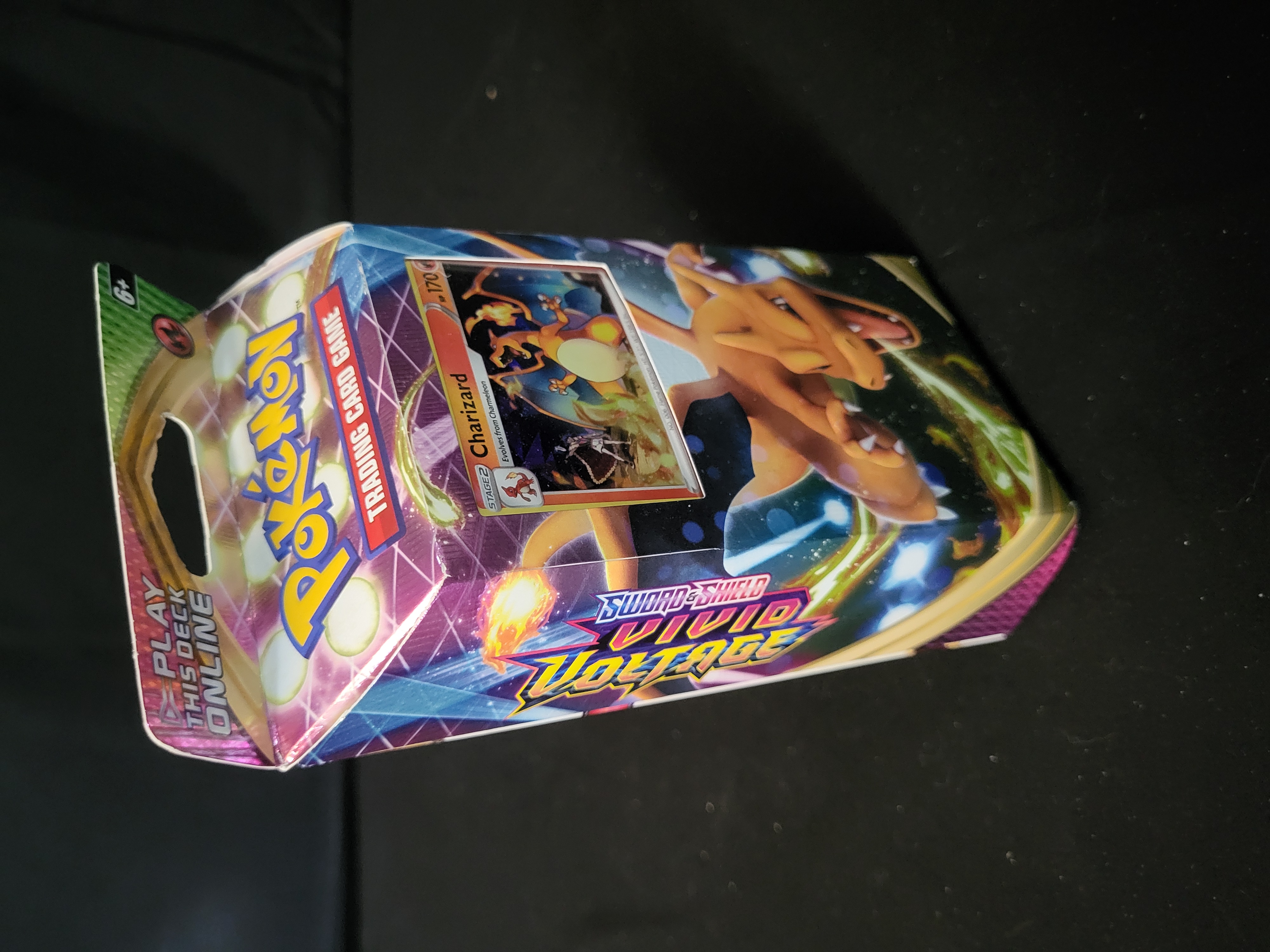 BID PER WHAT YOU SEE IN THE PHOTO, NOT THE AI GENERATED TITLES AND DESCRIPTIONS! Pokemon Trading Card Game Sword and Shield Vivid Voltage Charizard theme deck. This item consists of a 60-card deck and accessories housed in an illustrated cardboard box with a plastic die-cut window. The window displays a Stage 2 Charizard holographic card. The reverse of the packaging provides a comprehensive deck list including cards such as Lugia, Yanmega, and Magcargo. Stated contents include a 60-card deck, metallic coin, single-player playmat, deck box, damage counters, rules booklet, reference cards, and an online code card. A retail sticker from Kohls is present on the back.