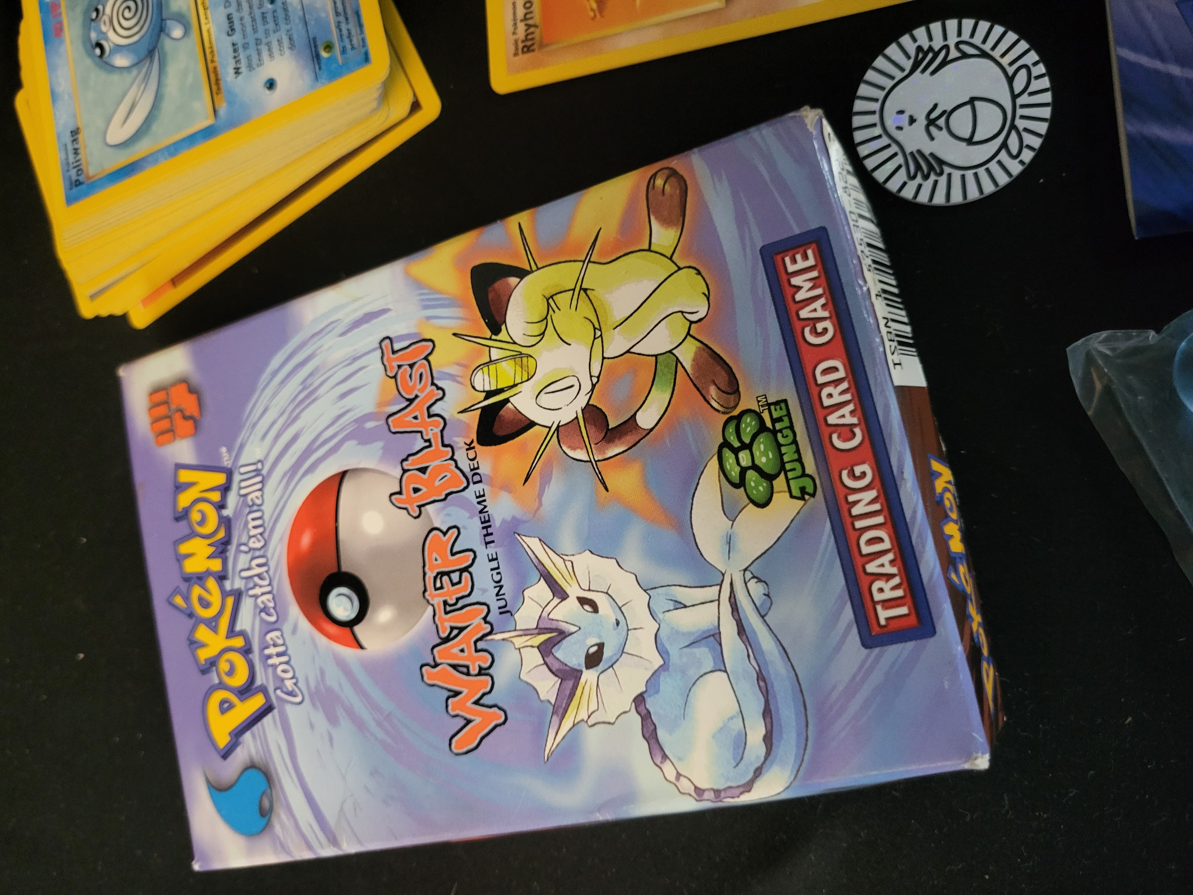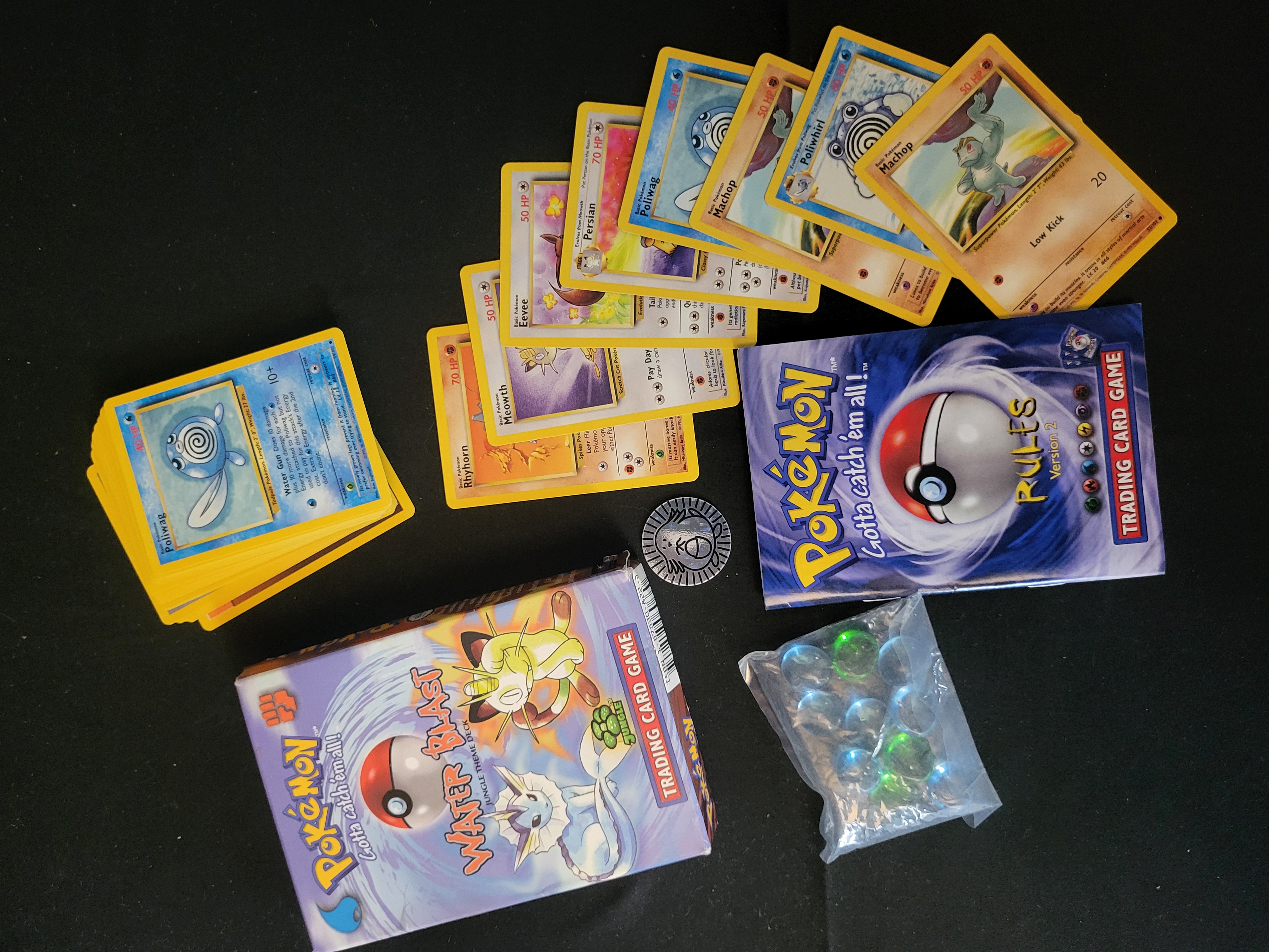 BID PER WHAT YOU SEE IN THE PHOTO, NOT THE AI GENERATED TITLES AND DESCRIPTIONS! A collection of vintage Pokémon Trading Card Game (TCG) items centered around the Water Blast Jungle Theme Deck produced by Wizards of the Coast. The group consists of an opened cardboard theme deck box, multiple stacks of trading cards, a Rules Version 2 instructional booklet, a silver-toned Chansey coin, and a plastic bag containing several translucent damage counters. Visible cards include specimens from the 1999 Base Set and Jungle expansion, such as Machop, Poliwhirl, Poliwag, Persian, Eevee, Meowth, and Rhyhorn. The items bear copyright markings for 1995, 1996, 1998 Nintendo, Creatures, GAMEFREAK and 1999 Wizards. The cards are constructed of standard printed cardstock with the classic blue Pokémon reverse design.