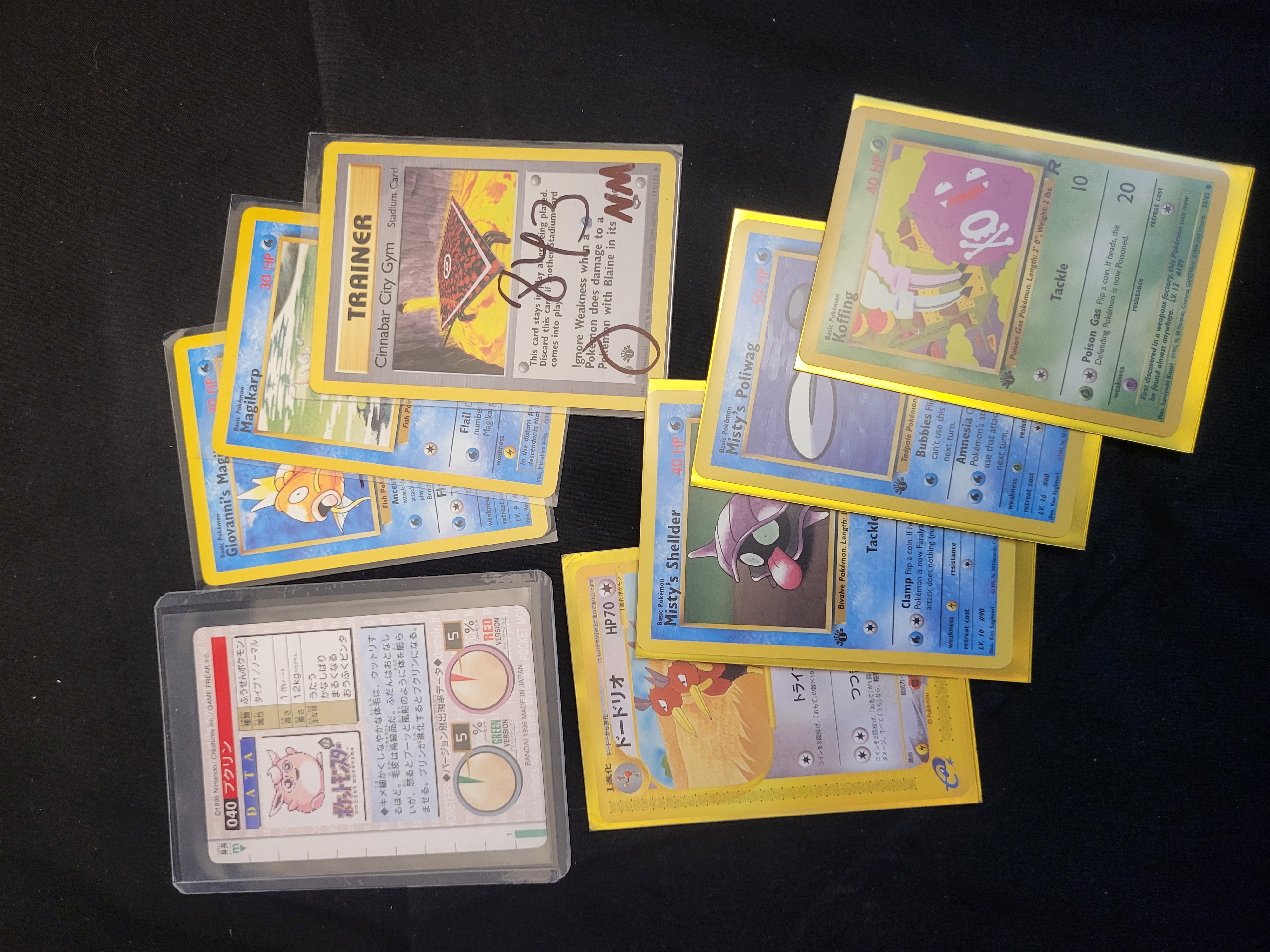 BID PER WHAT YOU SEE IN THE PHOTO, NOT THE AI GENERATED TITLES AND DESCRIPTIONS! A collection of vintage Pokemon trading cards comprising English language releases from the Gym Challenge and Team Rocket expansions, as well as Japanese Pocket Monster Card Game editions. The group includes the Trainer card Cinnabar City Gym from the Gym Challenge set, alongside Giovanni’s Magikarp, Misty’s Poliwag, Misty’s Shellder, and Koffing. The Japanese cards include a 1996 Bandai Pocket Monster Carddass style card featuring Wigglytuff and a Dodrio card. The cards are constructed of printed cardstock. One Trainer card features an unidentified signature and the notation NM inscribed in black ink on the front surface. The items are housed in a variety of yellow and clear plastic protective sleeves and a clear rigid top-loader.