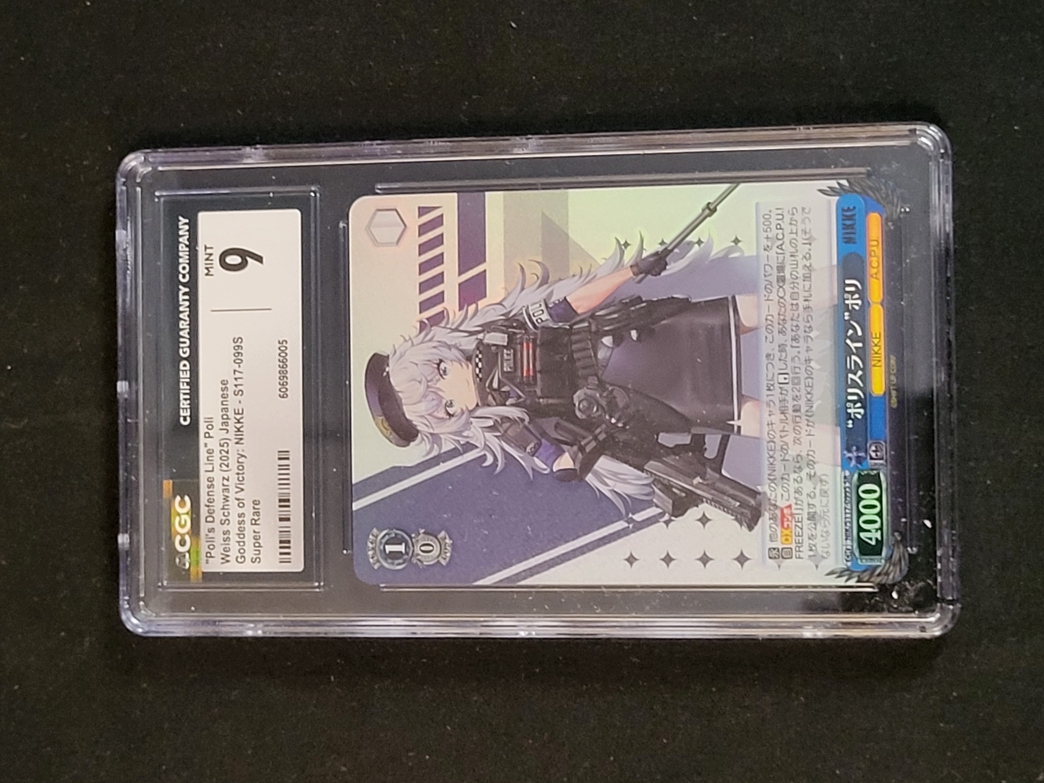 BID PER WHAT YOU SEE IN THE PHOTO, NOT THE AI GENERATED TITLES AND DESCRIPTIONS! This Japanese Weiss Schwarz trading card is from the Goddess of Victory: Nikke series, titled Poli’s Defense Line. The card is identified by the set number NIK/S117-099S and is a Super Rare (SR) variant from the 2025 release. The front displays character artwork of Poli with Japanese text and game statistics. The reverse shows the standard Weiss Schwarz logo and copyright information for Bushiroad and Shift Up Corp. The card is professionally encapsulated in a clear plastic holder by the Certified Guaranty Company (CGC). The CGC label includes the card title, set information, rarity, and a unique serial number of 6069866005. The reverse of the encapsulation features a holographic security sticker and a QR code for authentication.