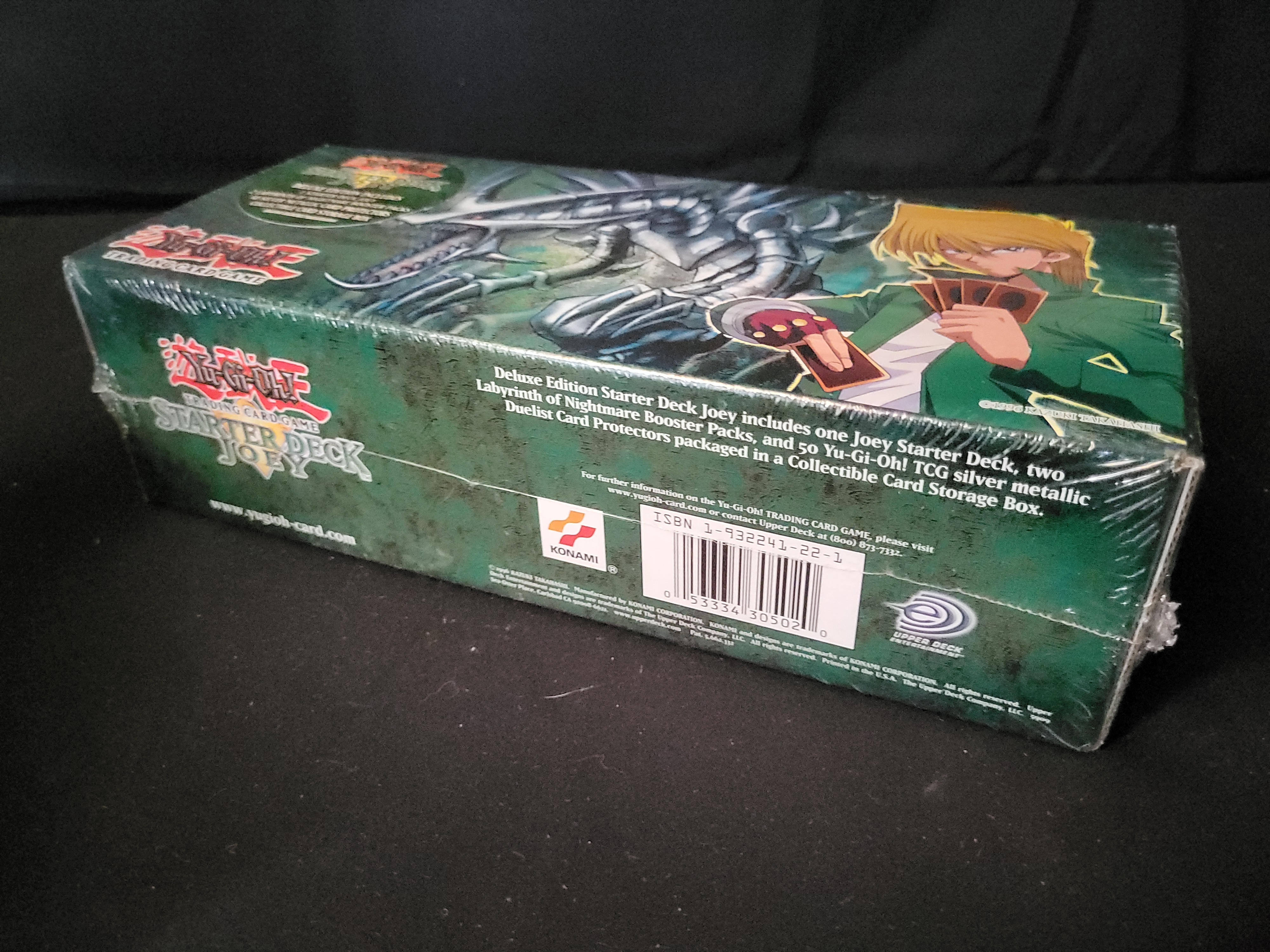 The Starter Deck Joey Deluxe Edition is factory sealed in its original shrink wrap. The Starter Deck Pegasus Deluxe Edition is opened; the internal Pegasus Starter Deck box and booster packs appear to remain sealed. Both outer storage boxes show light shelf wear and minor edge rubbing.