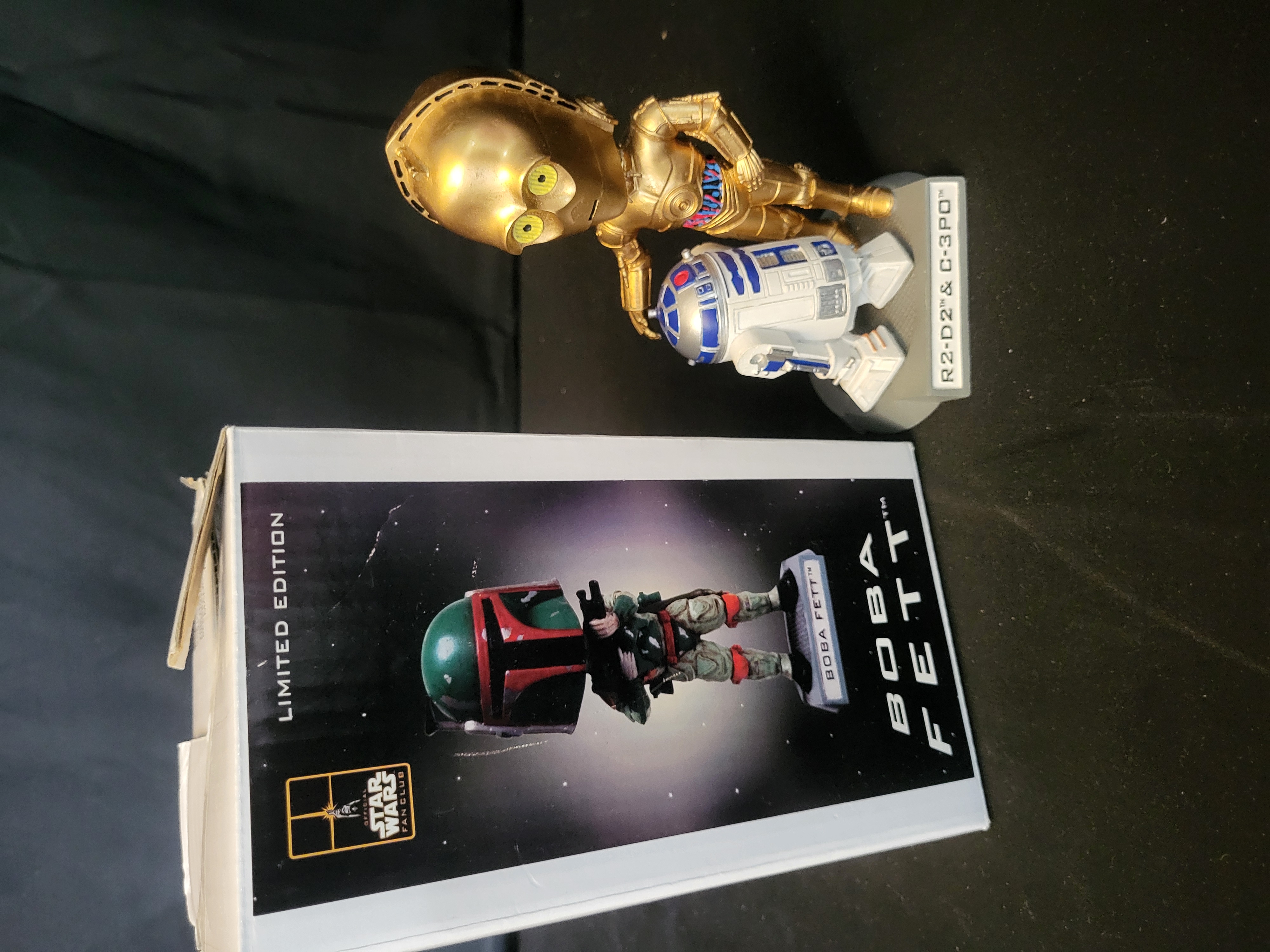 BID PER WHAT YOU SEE IN THE PHOTO, NOT THE AI GENERATED TITLES AND DESCRIPTIONS! A pair of Star Wars collectible bobblehead figures produced as Official Star Wars Fan Club exclusives. The lot includes one figure depicting Boba Fett and one paired figure featuring R2-D2 and C-3PO. Each figure is constructed from molded material and is mounted on a gray textured pedestal base with a raised nameplate identifying the characters. The Boba Fett figure is depicted in his traditional Mandalorian armor holding a blaster. The droid figure features a gold-toned C-3PO with painted midsection wiring standing alongside R2-D2. Included is the original Limited Edition retail box for the Boba Fett figure, which bears the Official Star Wars Fan Club logo.