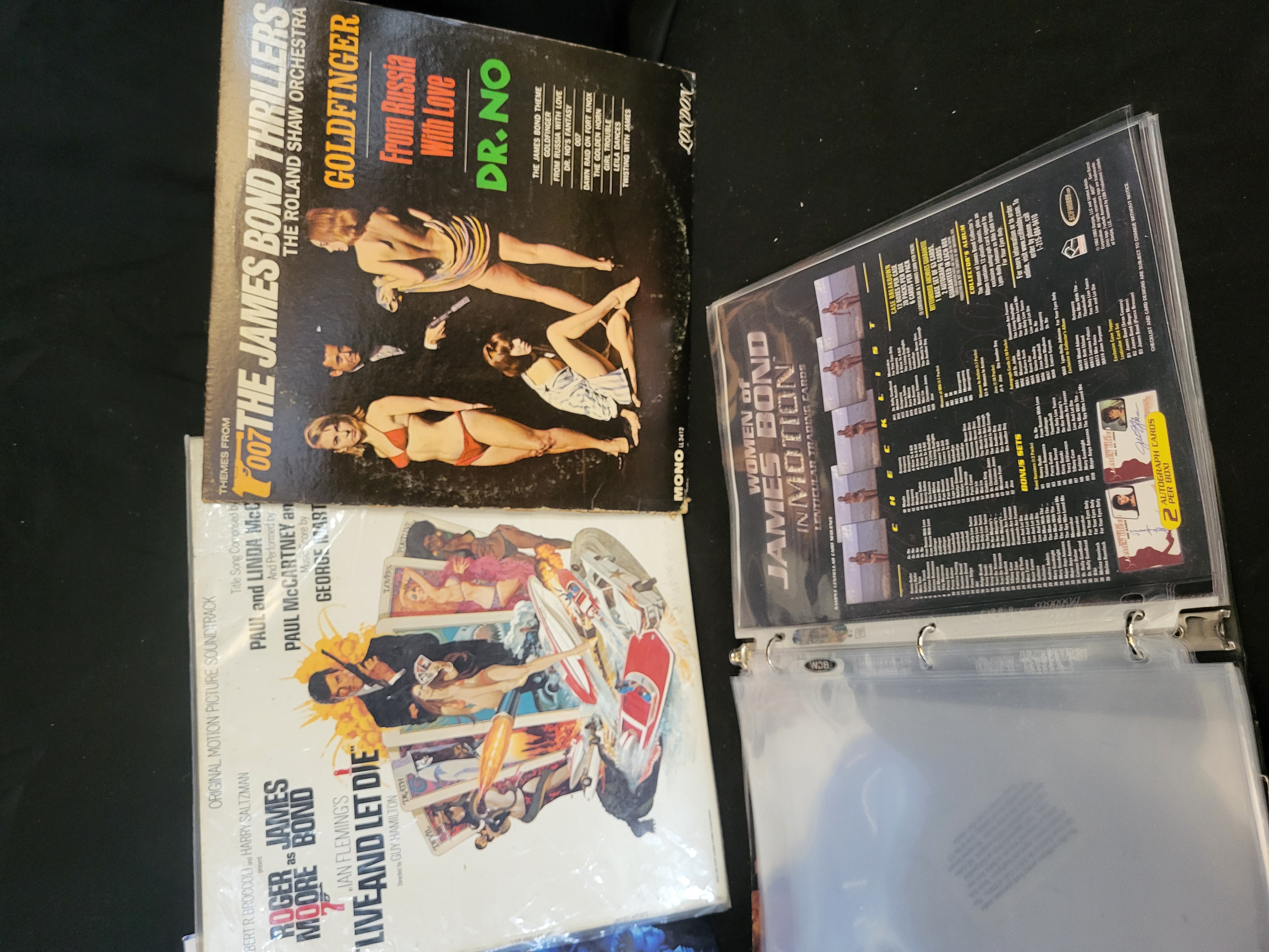 BID PER WHAT YOU SEE IN THE PHOTO, NOT THE AI GENERATED TITLES AND DESCRIPTIONS! A collection of film and music memorabilia primarily focused on the James Bond franchise. The lot includes a Live and Let Die Original Motion Picture Soundtrack vinyl LP (1973) on the United Artists label, featuring music by Paul and Linda McCartney and George Martin. Also present is a Themes From 007 The James Bond Thrillers vinyl LP by The Roland Shaw Orchestra, released by London Records in mono (LL 3412). The cinematic media includes a widescreen edition LaserDisc of the 1997 film The Saint starring Val Kilmer. Accompanying these items is a black three-ring binder containing an assortment of promotional film photographs in both black-and-white and color, alongside a Women of James Bond In Motion lenticular trading card checklist. The photographic materials are stored within clear plastic protective sleeves.