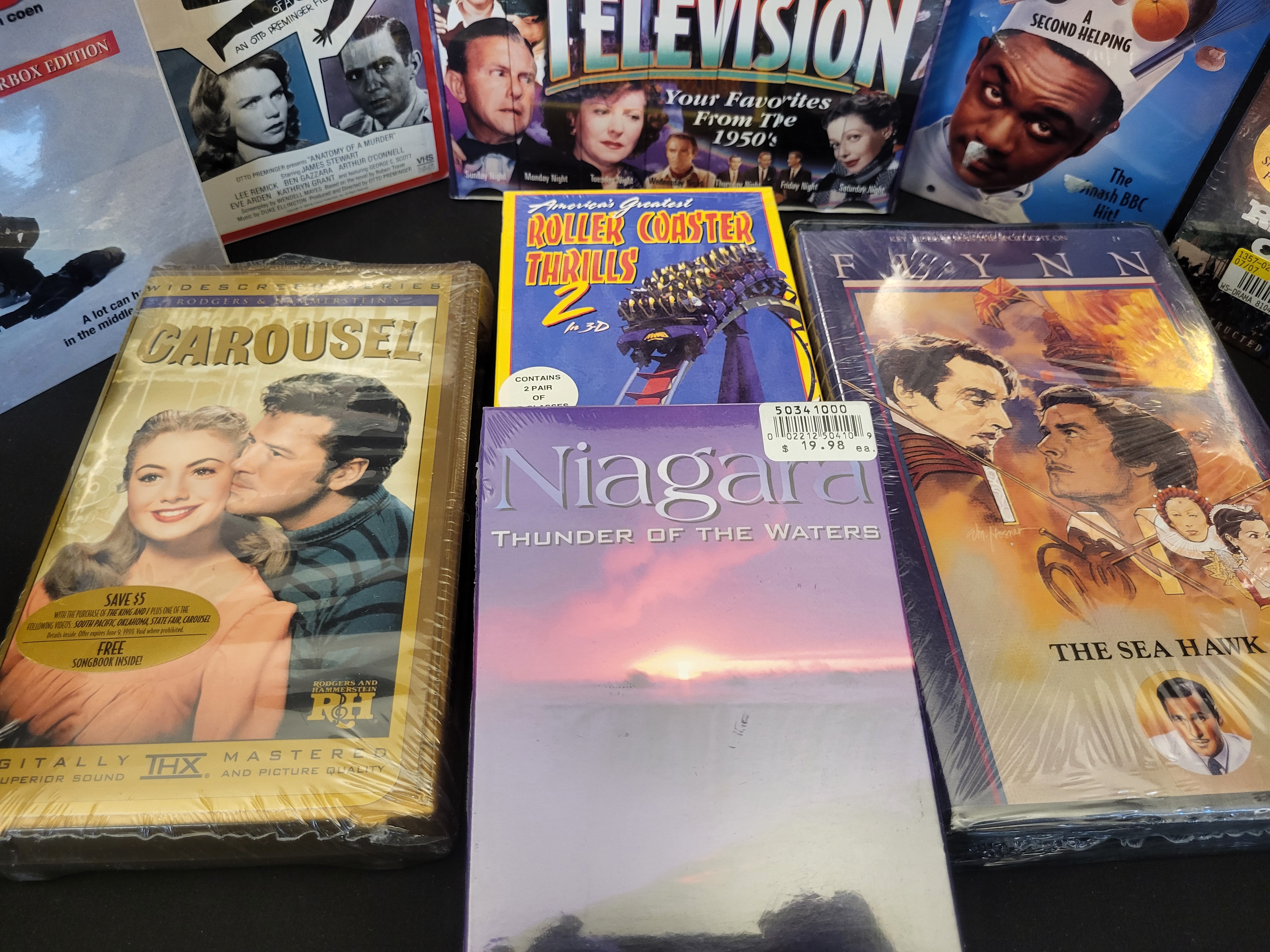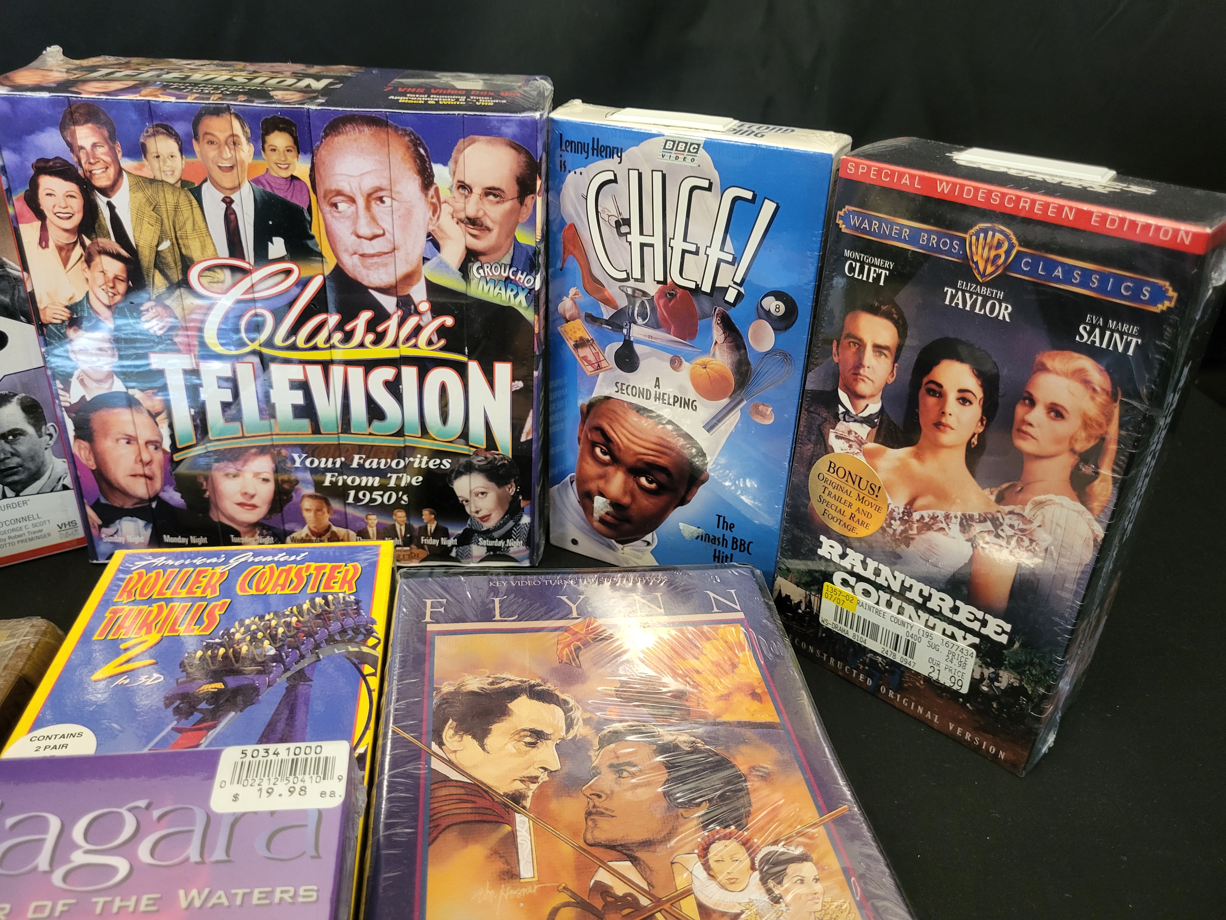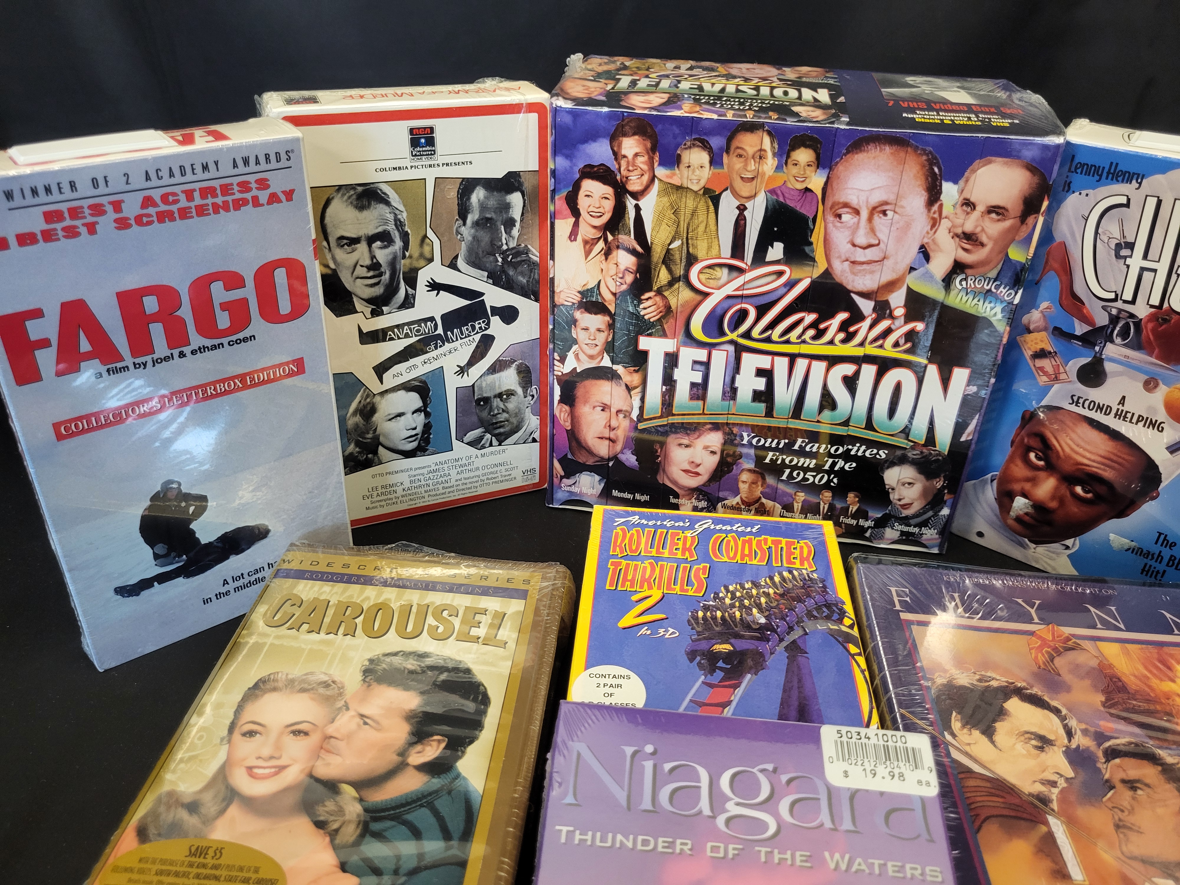 BID PER WHAT YOU SEE IN THE PHOTO, NOT THE AI GENERATED TITLES AND DESCRIPTIONS! This collection features an assortment of factory-sealed VHS tapes comprising feature films, television series, and special interest documentaries. A primary component is the Classic Television: Your Favorites From the 1950s seven-tape box set. Feature film titles include the 1996 film Fargo in a collector’s letterbox edition, Anatomy of a Murder, the BBC series Chef!, and a special widescreen edition of Raintree County. Also included are Carousel, The Sea Hawk, Niagara: Thunder of the Waters, and America’s Greatest Roller Coaster Thrills 2 in 3D. The tapes are housed in their original cardboard slipcases or clamshell cases and remain in their original shrink-wrapped packaging. Several items retain original retail price stickers. Technical specifications noted on packaging include THX mastering, NTSC format, and widescreen or letterbox presentations.