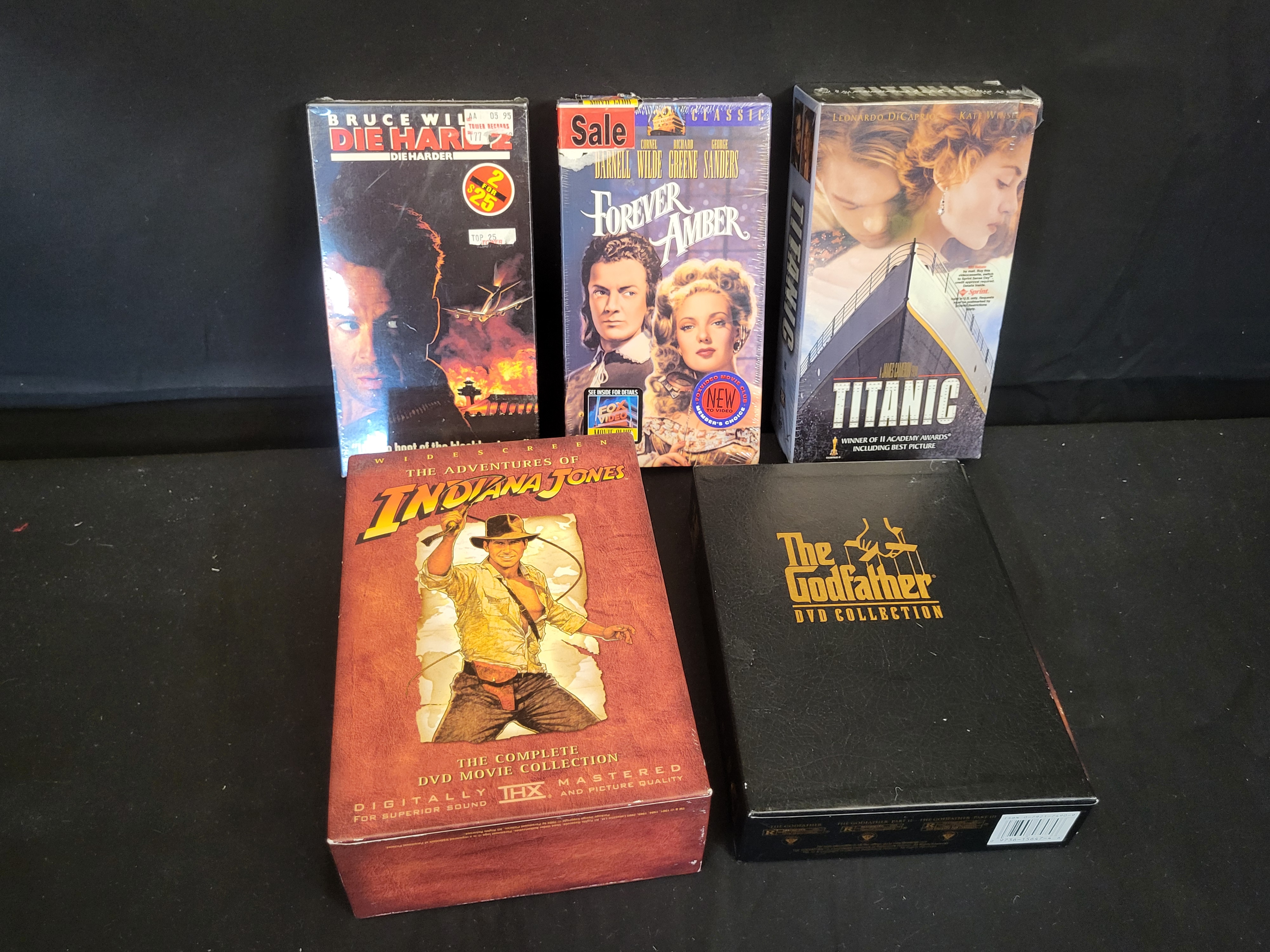 BID PER WHAT YOU SEE IN THE PHOTO, NOT THE AI GENERATED TITLES AND DESCRIPTIONS! A collection of cinematic titles in VHS and DVD formats. The group features The Adventures of Indiana Jones: The Complete DVD Movie Collection, a four-disc widescreen set from Paramount and Lucasfilm including Raiders of the Lost Ark, The Temple of Doom, The Last Crusade, and a bonus material disc. Also included is The Godfather DVD Collection, presented in a black multi-disc cardboard slipcase. The VHS portion of the collection comprises Die Hard 2, Forever Amber, and Titanic. The items are housed in their respective original retail packaging, with the DVD sets utilizing cardboard slipcase designs and the VHS tapes in standard sleeves. Visible branding includes logos for THX, Fox Video, and Lightstorm Entertainment. Several items retain original retail price and promotional stickers.