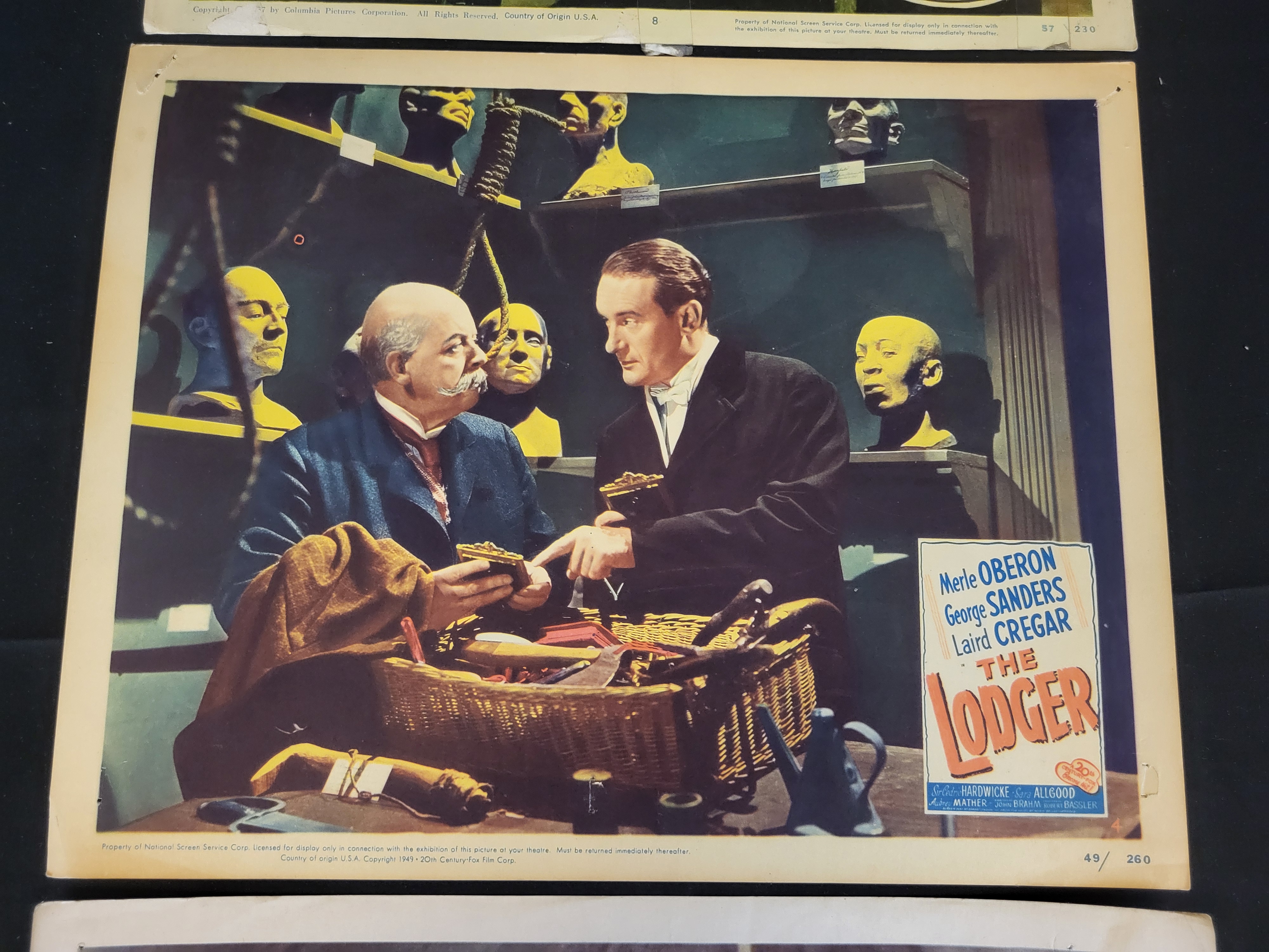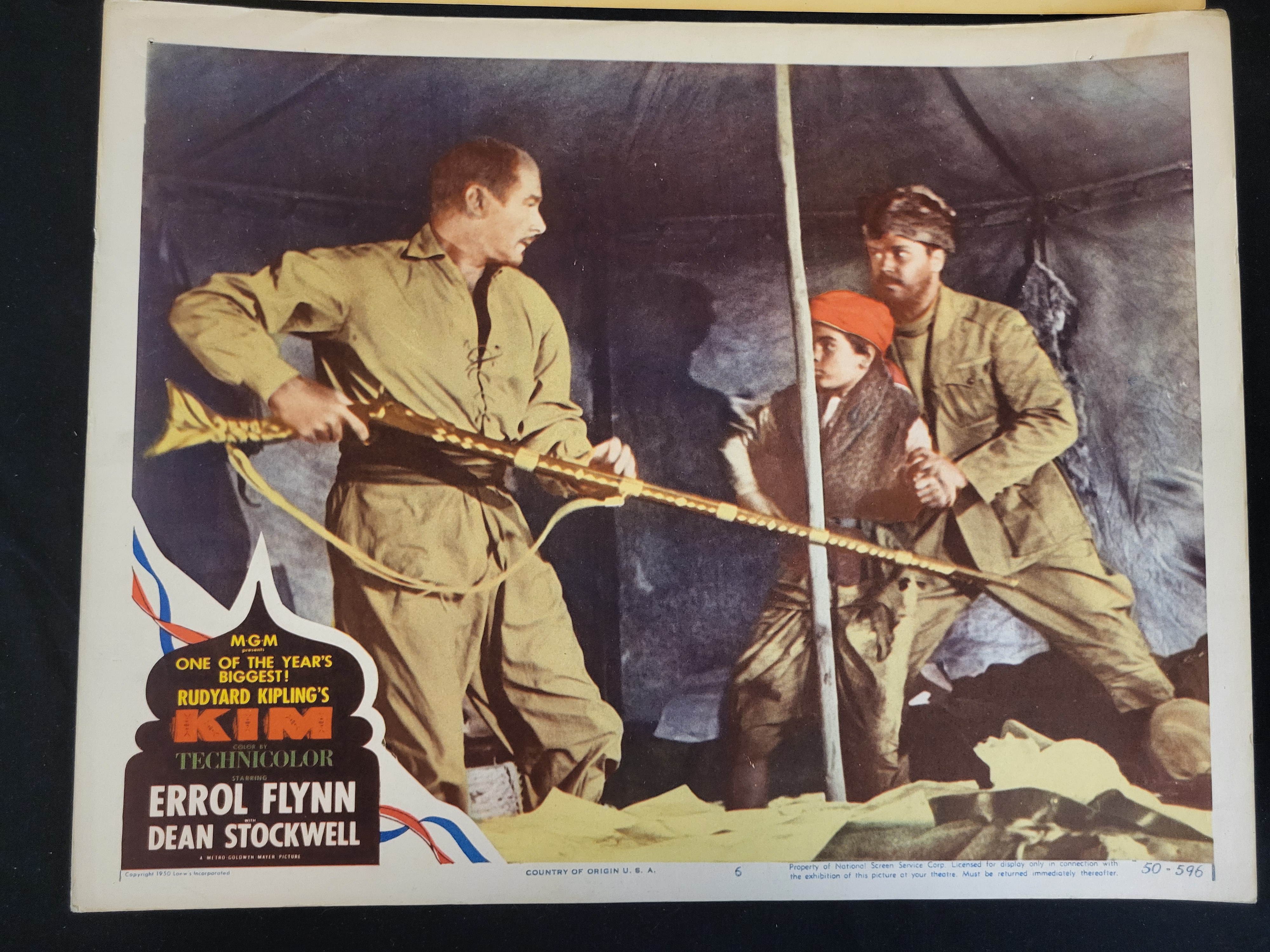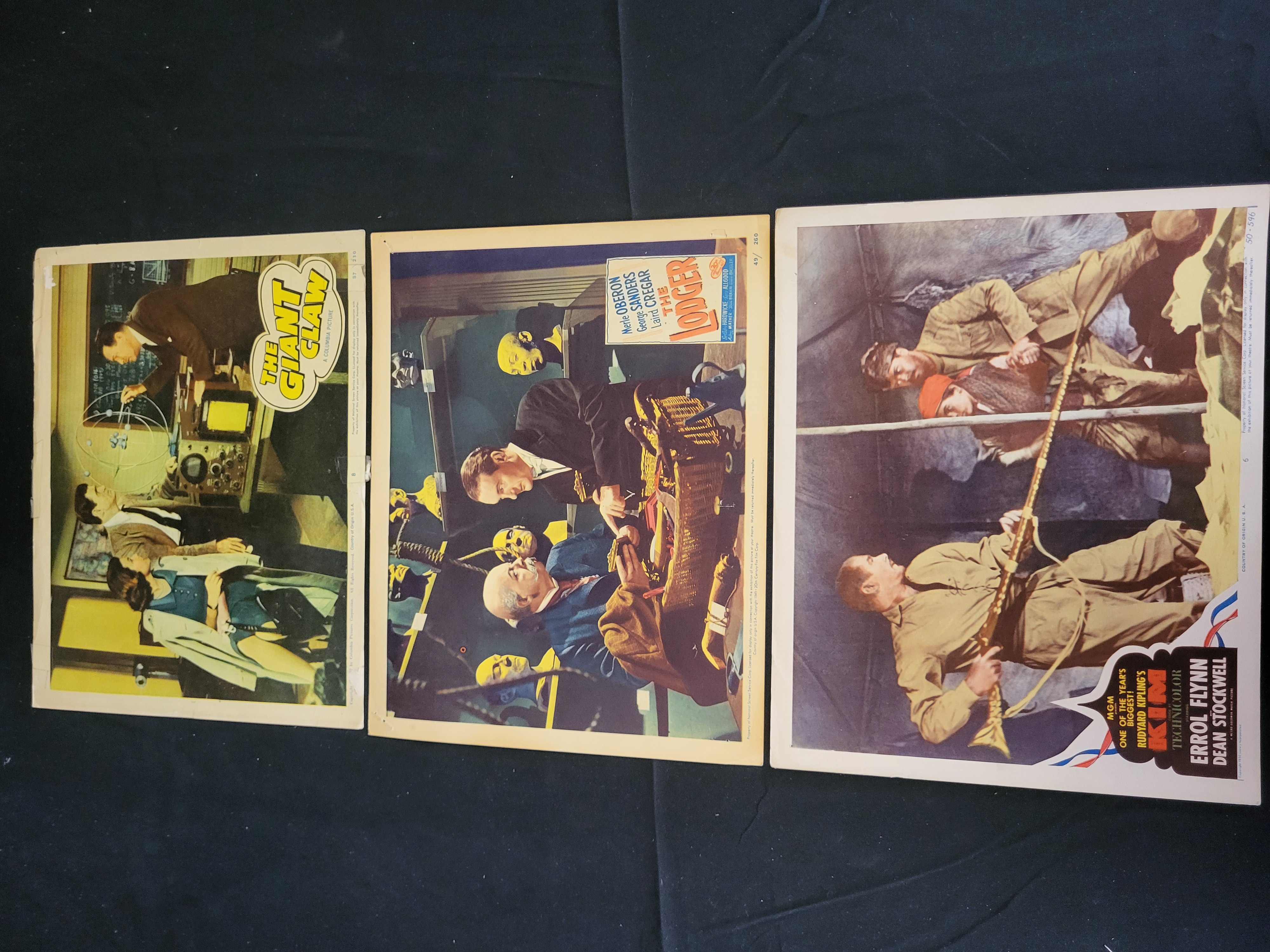 BID PER WHAT YOU SEE IN THE PHOTO, NOT THE AI GENERATED TITLES AND DESCRIPTIONS! A collection of three original theatrical lobby cards featuring scenes from mid-century motion pictures. The group includes a card for The Giant Claw (1957, Columbia Pictures), The Lodger (1944 copyright, 1949 National Screen Service release, 20th Century-Fox), and Kim (1950, Loew’s Incorporated/MGM). Each item is printed on heavy cardstock and features color-tinted photographic imagery. The cards include integrated production credits, studio logos, and National Screen Service Corporation (NSS) distribution markings and numbers. Specific markings include NSS 57/230 for The Giant Claw, NSS 49/260 for The Lodger, and NSS 50/596 for Kim. The cards are designated as scene numbers 8, 4, and 6 respectively.