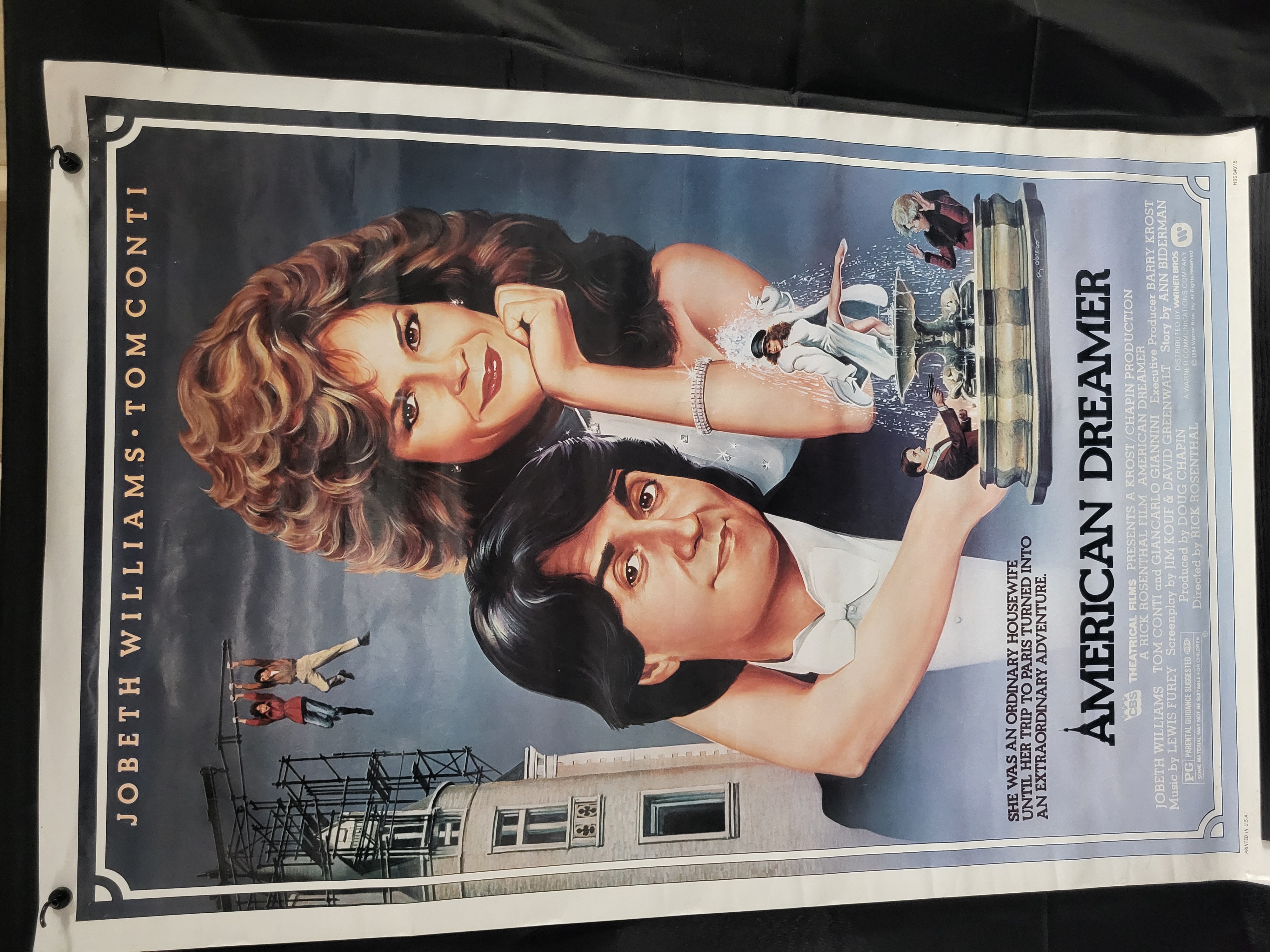 BID PER WHAT YOU SEE IN THE PHOTO, NOT THE AI GENERATED TITLES AND DESCRIPTIONS! An original one-sheet movie poster for the 1984 motion picture American Dreamer, starring JoBeth Williams and Tom Conti. The poster features a color illustrated montage depicting the lead actors in the foreground with various scenes from the film, including a Parisian architectural background and a fountain sequence. The printed text includes the film title, tagline, and full production credits for CBS Theatrical Films and Warner Bros. The lower-right corner displays the National Screen Service number 840115 and a 1984 copyright attribution to Warner Bros. Inc.