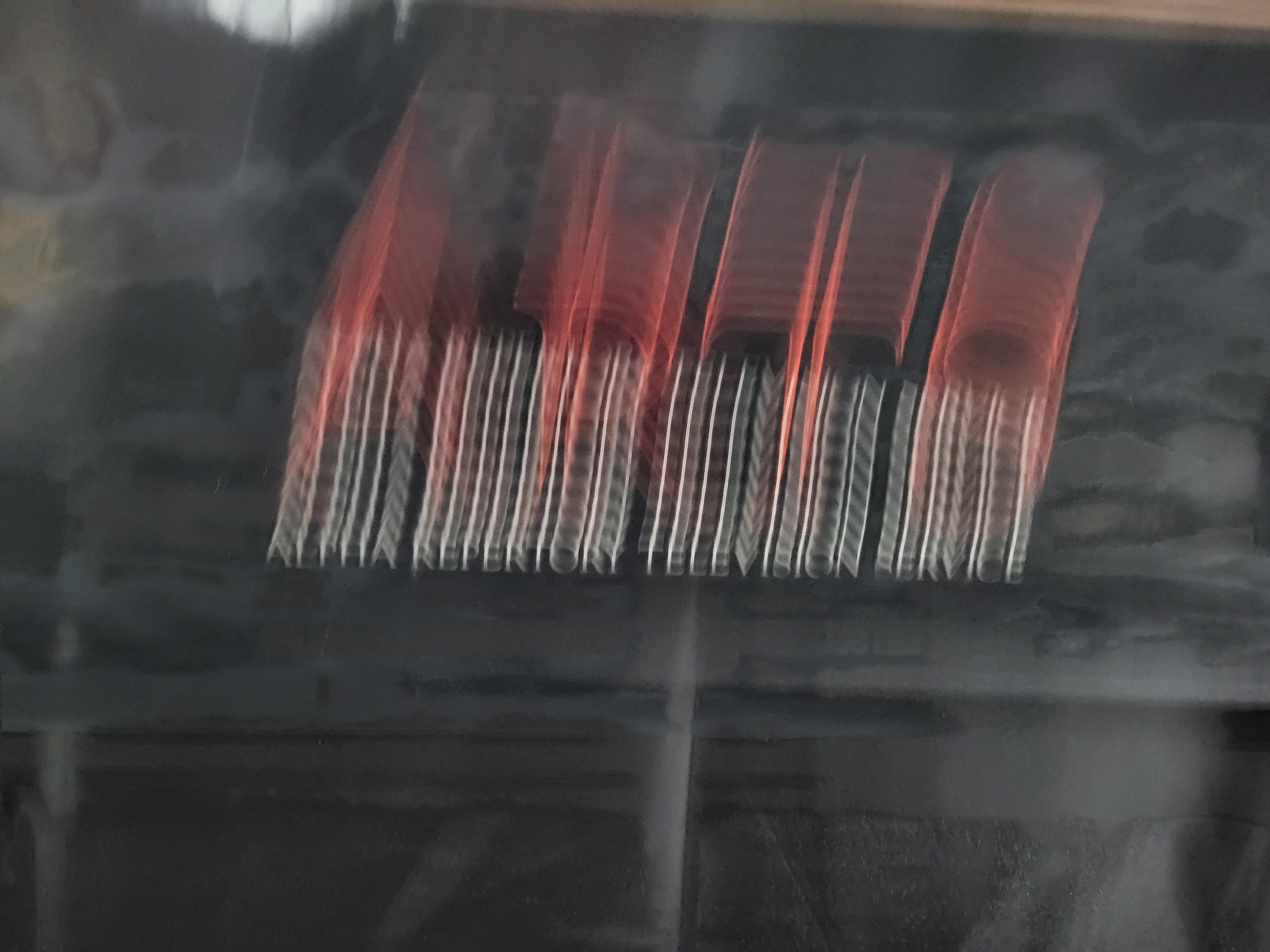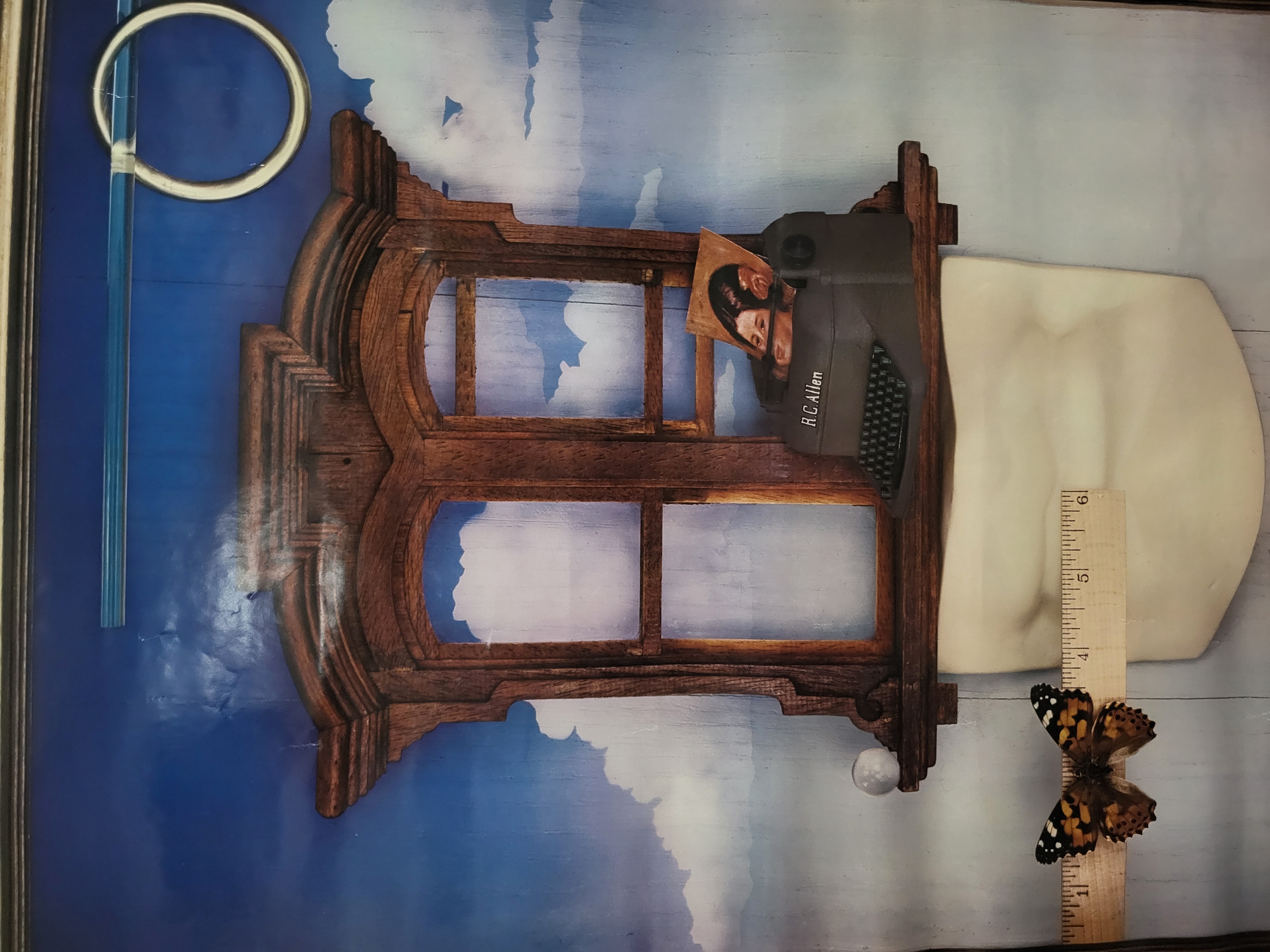 BID PER WHAT YOU SEE IN THE PHOTO, NOT THE AI GENERATED TITLES AND DESCRIPTIONS! This vintage promotional poster was produced for the Alpha Repertory Television Service (ARTS), a cable television network active in the early 1980s. The poster features a central surrealist composition set within a printed ornate gold-colored frame against a black field. The artwork depicts a carved wooden window frame suspended against a blue sky with white clouds. Accompanying the frame are several disparate objects, including a vintage R.C. Allen typewriter containing a photograph of a couple, a white tufted cushion, a wooden ruler with a butterfly resting upon it, a blue glass tube, and a metallic ring. The right margin features the ARTS logo in large red lettering above the text ALPHA REPERTORY TELEVISION SERVICE in white.