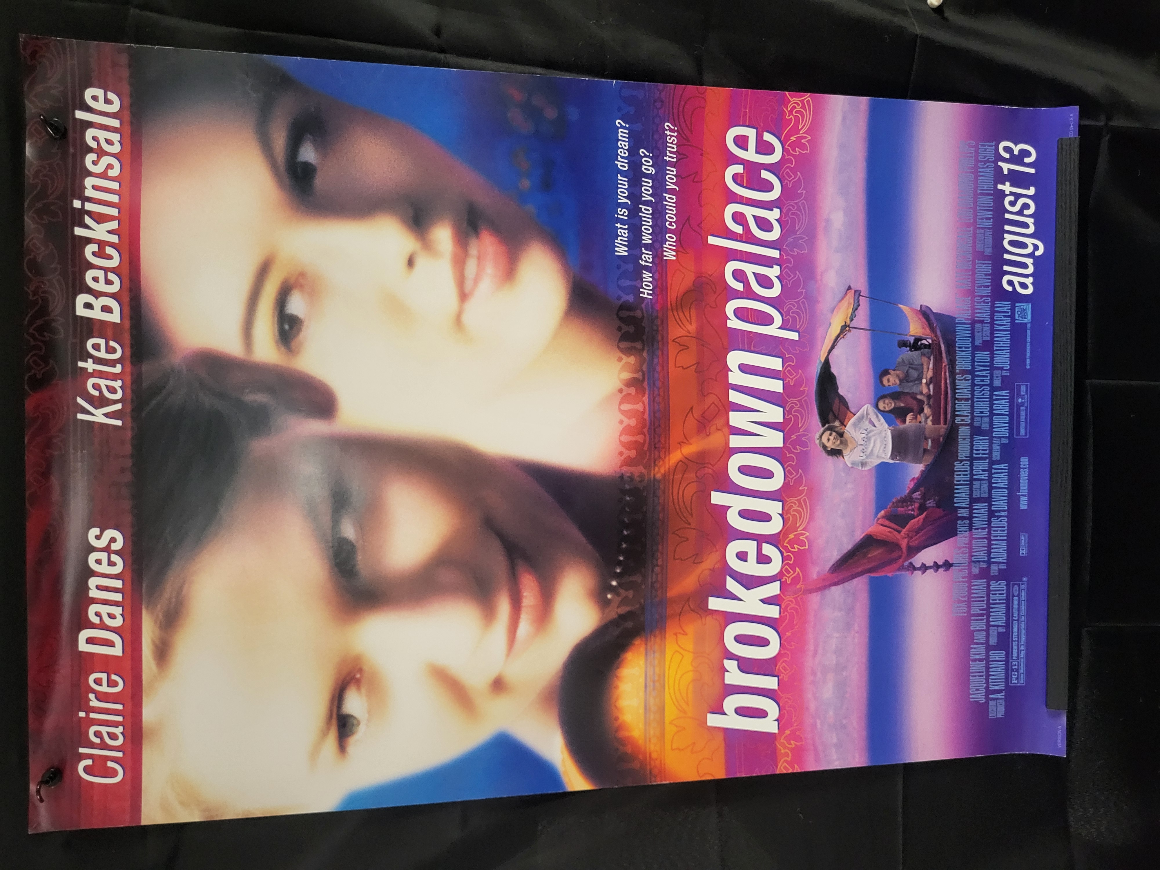 BID PER WHAT YOU SEE IN THE PHOTO, NOT THE AI GENERATED TITLES AND DESCRIPTIONS! An original theatrical movie poster for the 1999 Fox 2000 Pictures drama Brokedown Palace. The poster features photographic imagery of lead actresses Claire Danes and Kate Beckinsale. The graphic design incorporates a color palette of orange, purple, and blue tones with ornamental scrollwork patterns. Text on the poster includes the film title, the tagline What is your dream? How far would you go? Who could you trust?, the release date of August 13, and a production credit block. The poster is printed on standard paper stock.