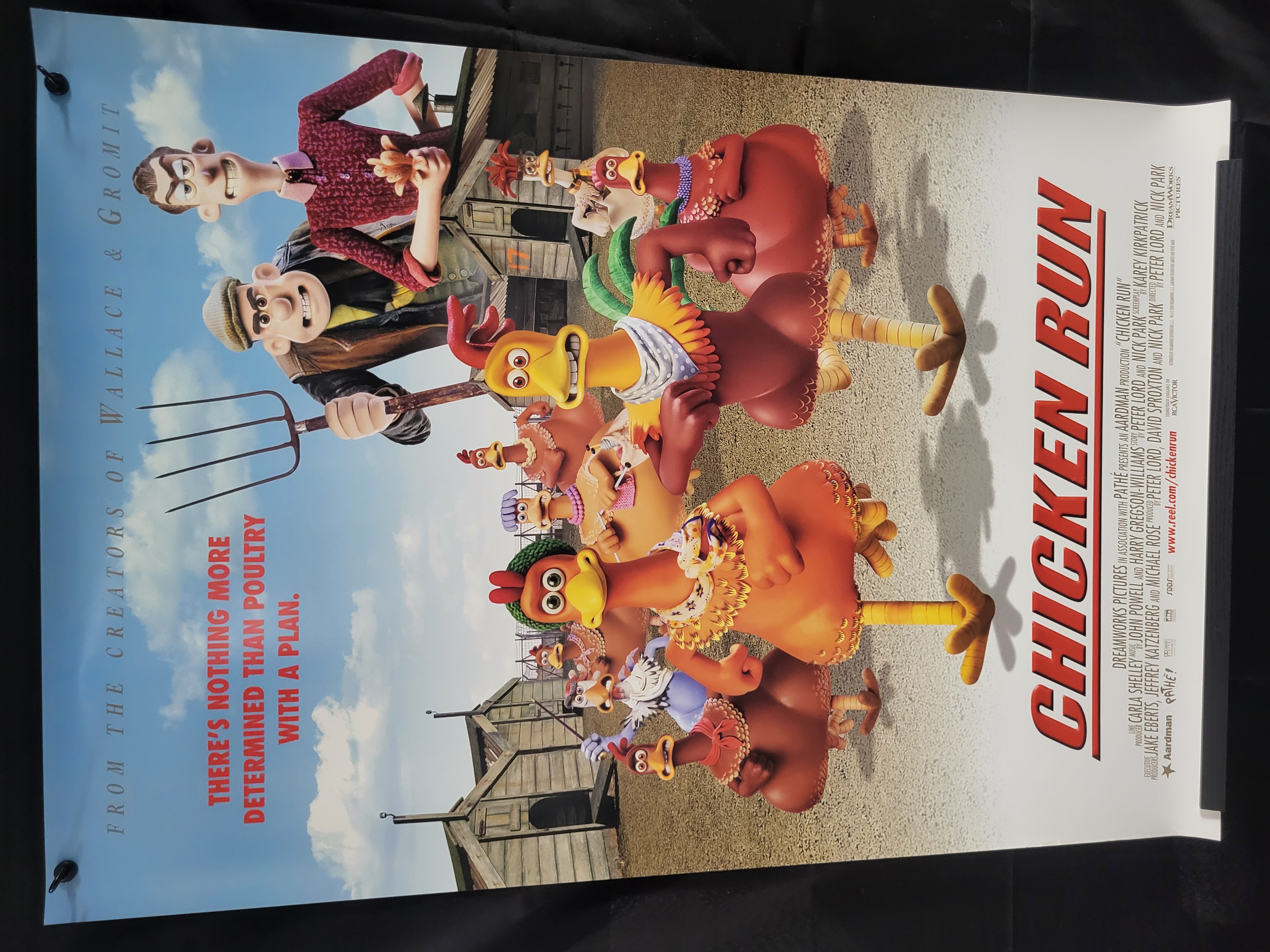 BID PER WHAT YOU SEE IN THE PHOTO, NOT THE AI GENERATED TITLES AND DESCRIPTIONS! An original theatrical movie poster for the 2000 stop-motion animated film Chicken Run, produced by Aardman Animations in association with Dreamworks Pictures and Pathe. The graphic depicts the film’s central claymation characters, including a group of chickens and human antagonists, set against a farm backdrop. The poster features the film title in large red block letters, the tagline There is nothing more determined than poultry with a plan, and the credit From the creators of Wallace and Gromit. A detailed production credits block is visible in the bottom right corner, citing producers such as Peter Lord, David Sproxton, and Nick Park.