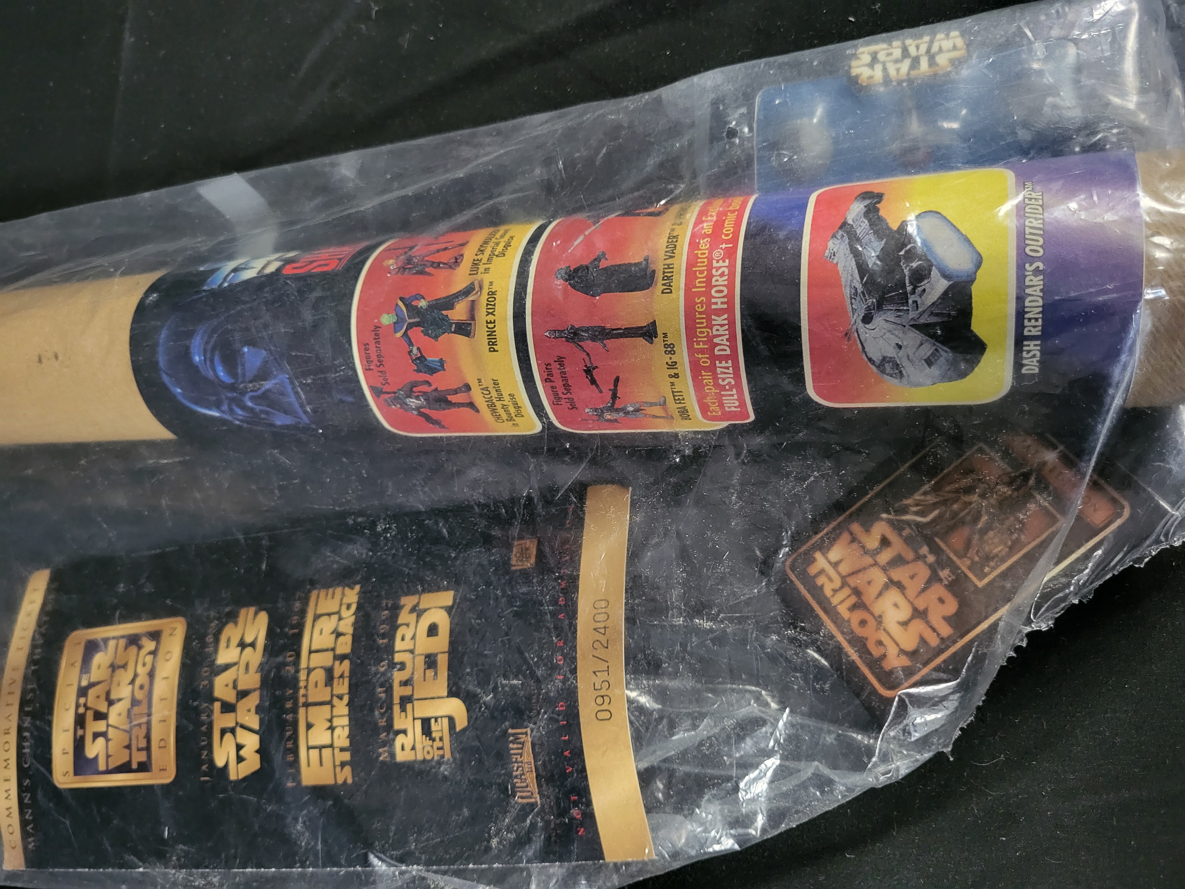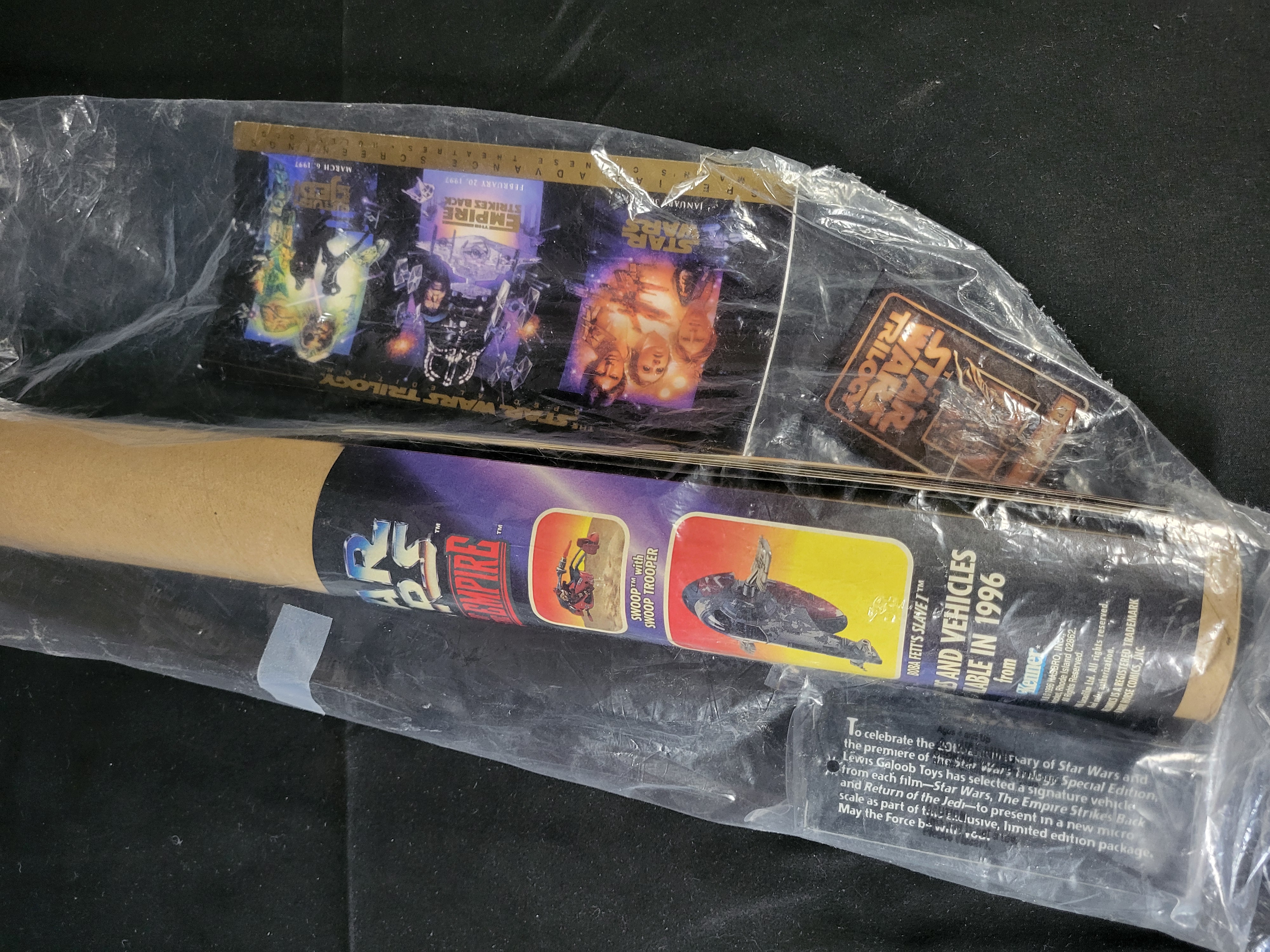BID PER WHAT YOU SEE IN THE PHOTO, NOT THE AI GENERATED TITLES AND DESCRIPTIONS! A group of Star Wars promotional memorabilia produced for the 1997 Special Edition theatrical releases. The lot includes a cardboard mailing tube with a Shadows of the Empire graphic wrap featuring character and vehicle illustrations including Luke Skywalker, Prince Xizor, and Dash Rendar’s Outrider. Included is a commemorative ticket for Mann’s Chinese Theatre, numbered 0951/2400, which displays the 1997 release dates for the Star Wars Trilogy. The collection also contains a sealed Micro Machines vehicle by Galoob in a Limited Edition promotional package and a Star Wars Trilogy commemorative card. Branding for Lucasfilm Ltd., Kenner, and Dark Horse Comics is present across the items.