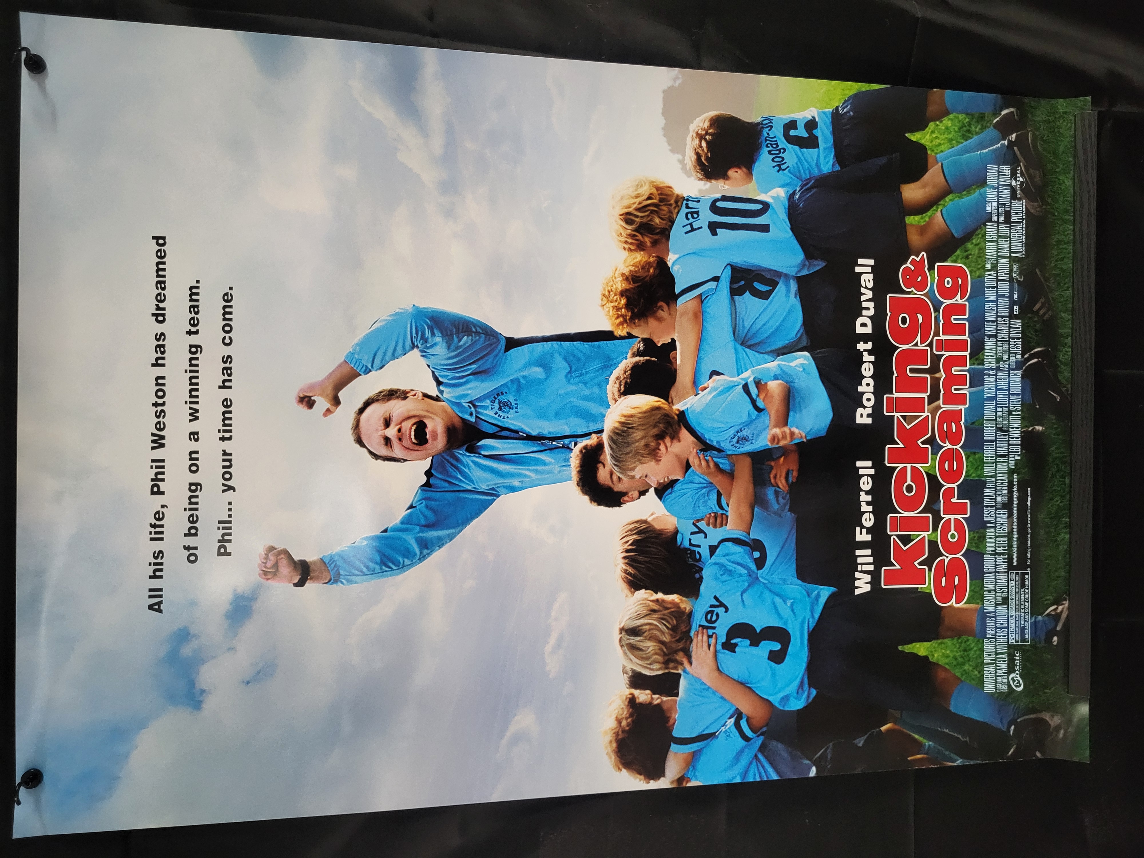 BID PER WHAT YOU SEE IN THE PHOTO, NOT THE AI GENERATED TITLES AND DESCRIPTIONS! An original promotional movie poster for the 2005 film Kicking & Screaming starring Will Ferrell and Robert Duvall. The poster features a central image of Ferrell in a blue athletic jacket cheering alongside a group of children in matching light blue soccer uniforms. Textual elements include the lead actors names, the film title in stylized red and white lettering, and a tagline reading: All his life, Phil Weston has dreamed of being on a winning team. Phil… your time has come. The bottom margin contains production and studio credits for Universal Pictures and Mosaic Media Group. The item is printed on paper and presented in a portrait orientation.