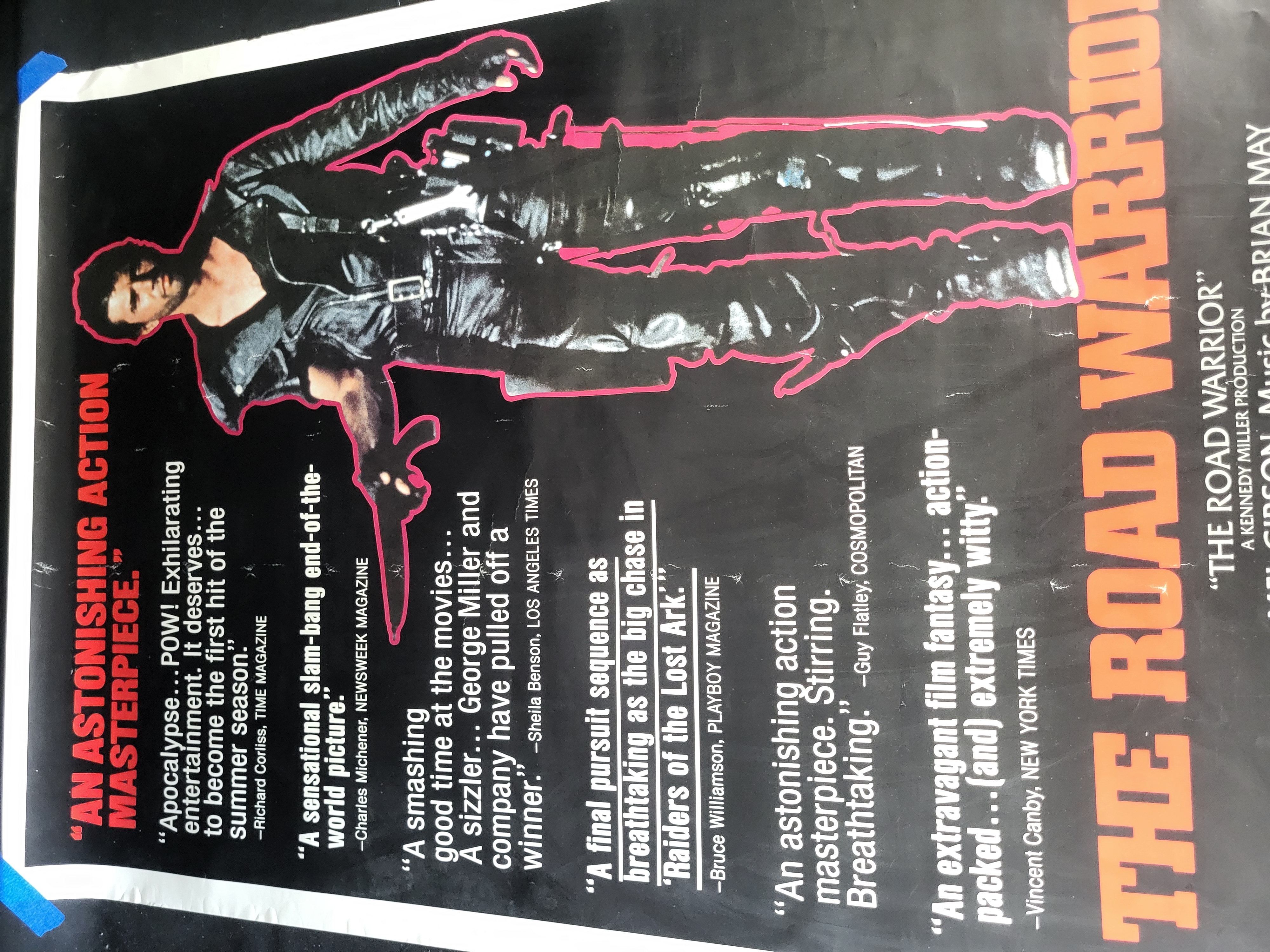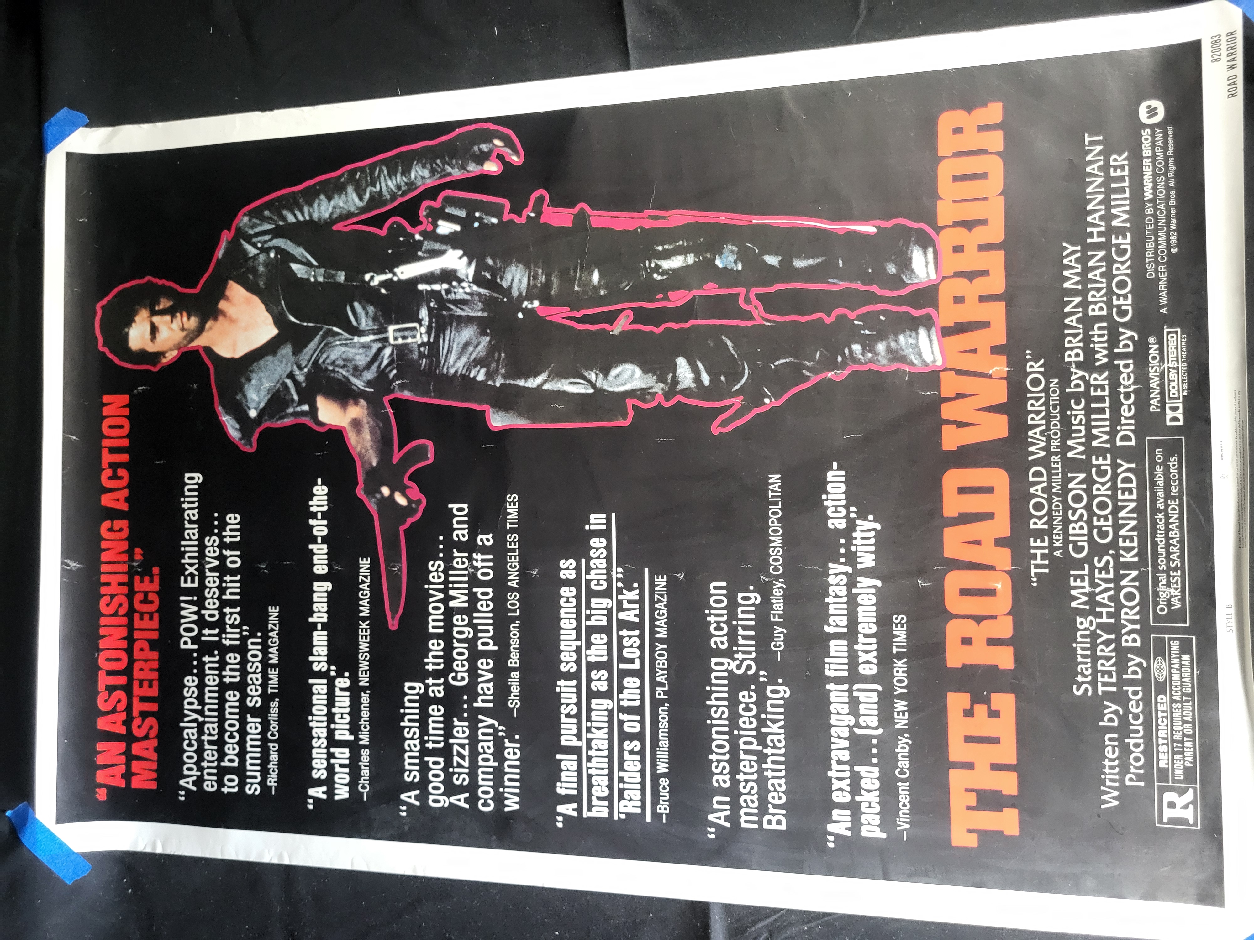 BID PER WHAT YOU SEE IN THE PHOTO, NOT THE AI GENERATED TITLES AND DESCRIPTIONS! Original Style B one-sheet movie poster for the 1982 film The Road Warrior, also known as Mad Max 2. The poster is printed on paper and features a black background with a centered photographic image of Mel Gibson as Max Rockatansky outlined in pink. The film title is displayed in large orange font along the right side. The layout includes several critical praise quotes from publications such as Time Magazine and Newsweek. The lower section contains a standard billing block listing director George Miller and production company Kennedy Miller. Visible markings include the Warner Bros. logo, a 1982 copyright, an R rating, and STYLE B notation. The lower margin contains the code 820083 ROAD WARRIOR.