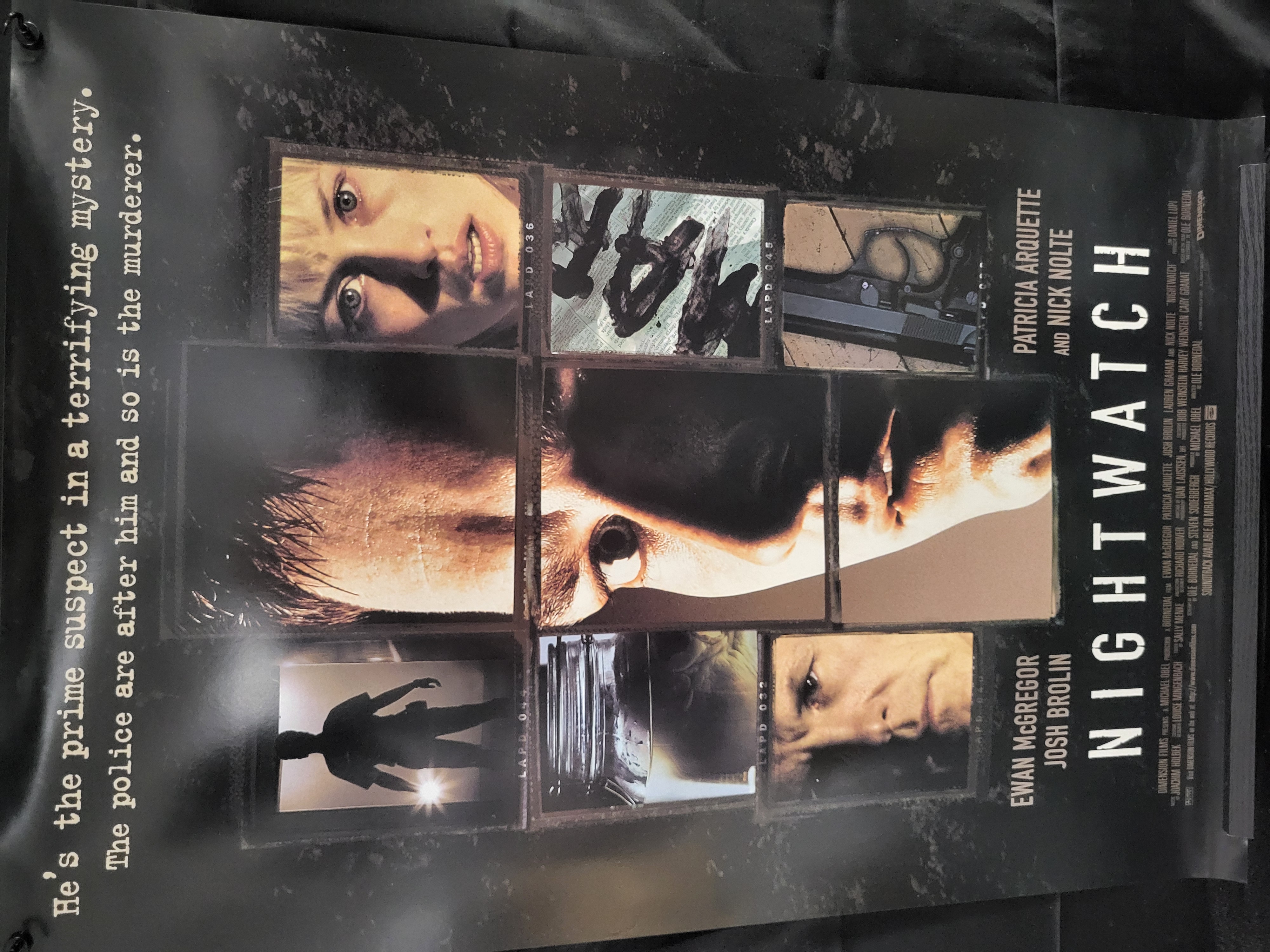 BID PER WHAT YOU SEE IN THE PHOTO, NOT THE AI GENERATED TITLES AND DESCRIPTIONS! Original theatrical movie poster for the 1997 thriller Nightwatch, directed by Ole Bornedal. The poster is printed on semi-glossy paper and features a collage design of simulated police evidence photographs. The imagery includes portraits of lead actors Ewan McGregor, Patricia Arquette, and Nick Nolte, alongside depictions of a handgun, a silhouette, and a glass jar. Several of the photos are labeled with LAPD case numbers, including LAPD 036, LAPD 045, LAPD 032, and LAPD 044. Vertical text on the left side provides the tagline: He’s the prime suspect in a terrifying mystery. The police are after him and so is the murderer. The right side lists the lead cast including Ewan McGregor, Josh Brolin, Patricia Arquette, and Nick Nolte. Production credits for Dimension Films and Miramax are printed in the lower right corner.