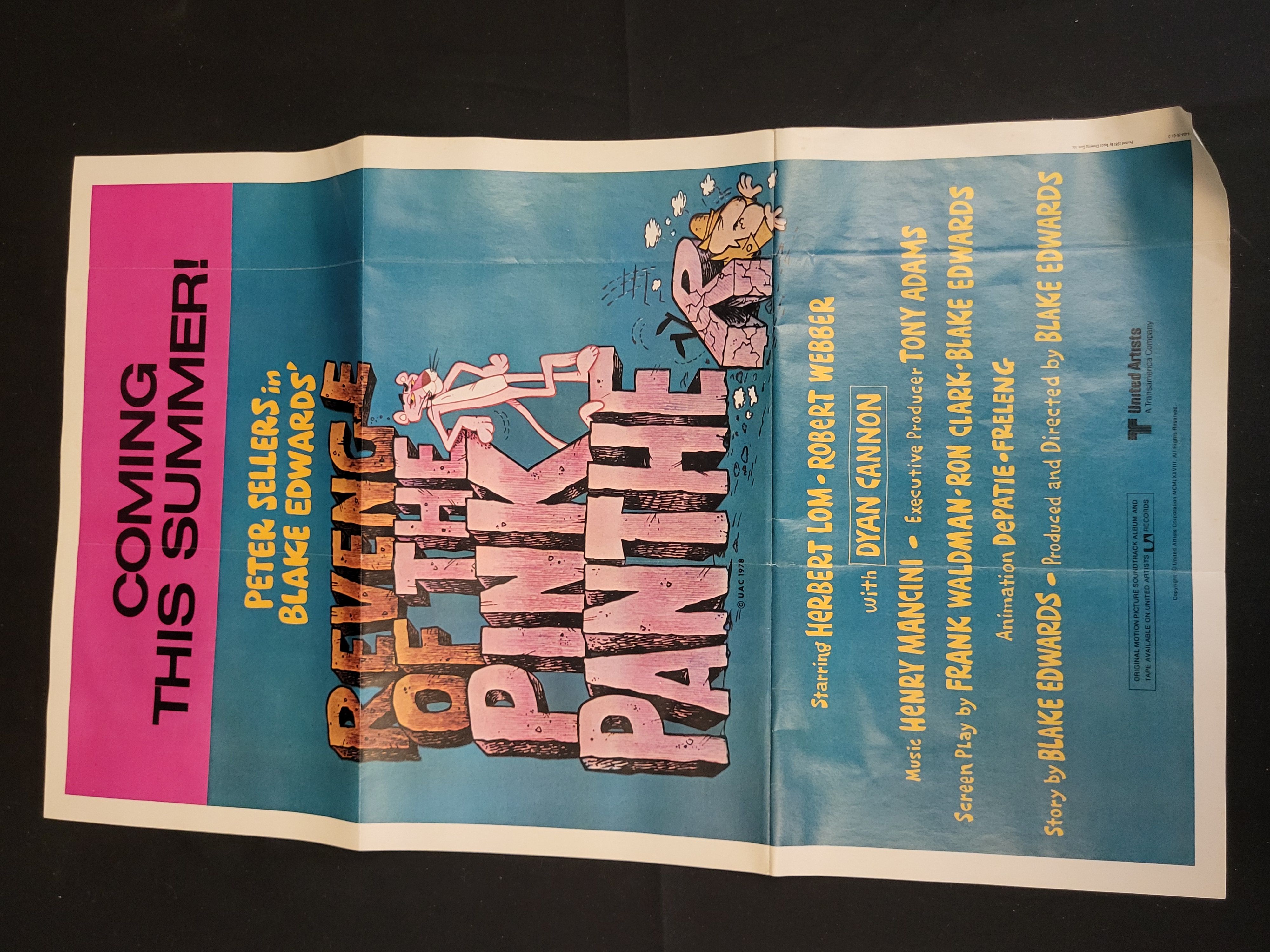 BID PER WHAT YOU SEE IN THE PHOTO, NOT THE AI GENERATED TITLES AND DESCRIPTIONS! A promotional paper movie poster for the 1978 film Revenge of the Pink Panther, produced as a pin-up insert by Topps Chewing Gum, Inc. in 1981. The landscape-oriented poster features the animated Pink Panther character atop stylized block lettering. A vertical magenta banner on the left side displays the text COMING THIS SUMMER! in black block lettering. The poster includes credits for actor Peter Sellers and director Blake Edwards, along with Herbert Lom, Dyan Cannon, Robert Webber, and composer Henry Mancini. The bottom margin contains a 1978 copyright for United Artists Corporation and the specific printing credit Printed 1981 by Topps Chewing Gum, Inc.