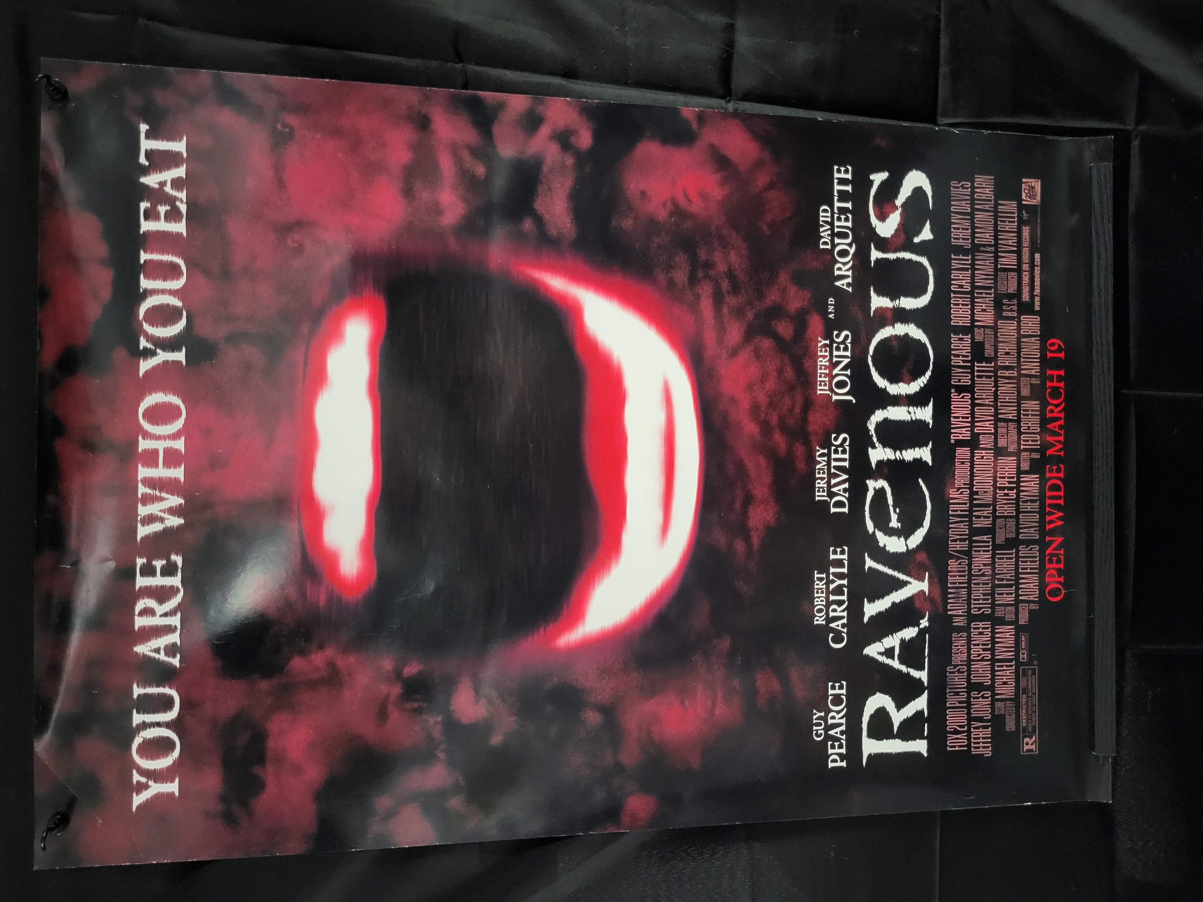 BID PER WHAT YOU SEE IN THE PHOTO, NOT THE AI GENERATED TITLES AND DESCRIPTIONS! This promotional movie poster for the 1999 film Ravenous features a central stylized graphic in white and red set against a dark background of red and black clouds. The poster includes the tagline YOU ARE WHO YOU EAT printed vertically in a white serif font on the left edge. The film title RAVENOUS is displayed in large bold white lettering on the right side. Above the title, the lead cast members Guy Pearce, Robert Carlyle, Jeremy Davies, Jeffrey Jones, and David Arquette are listed. The lower right corner contains a full production billing block, the Fox 2000 Pictures logo, an R rating, and the release text OPEN WIDE MARCH 19 in red. The item is a printed paper poster intended for theatrical promotion.