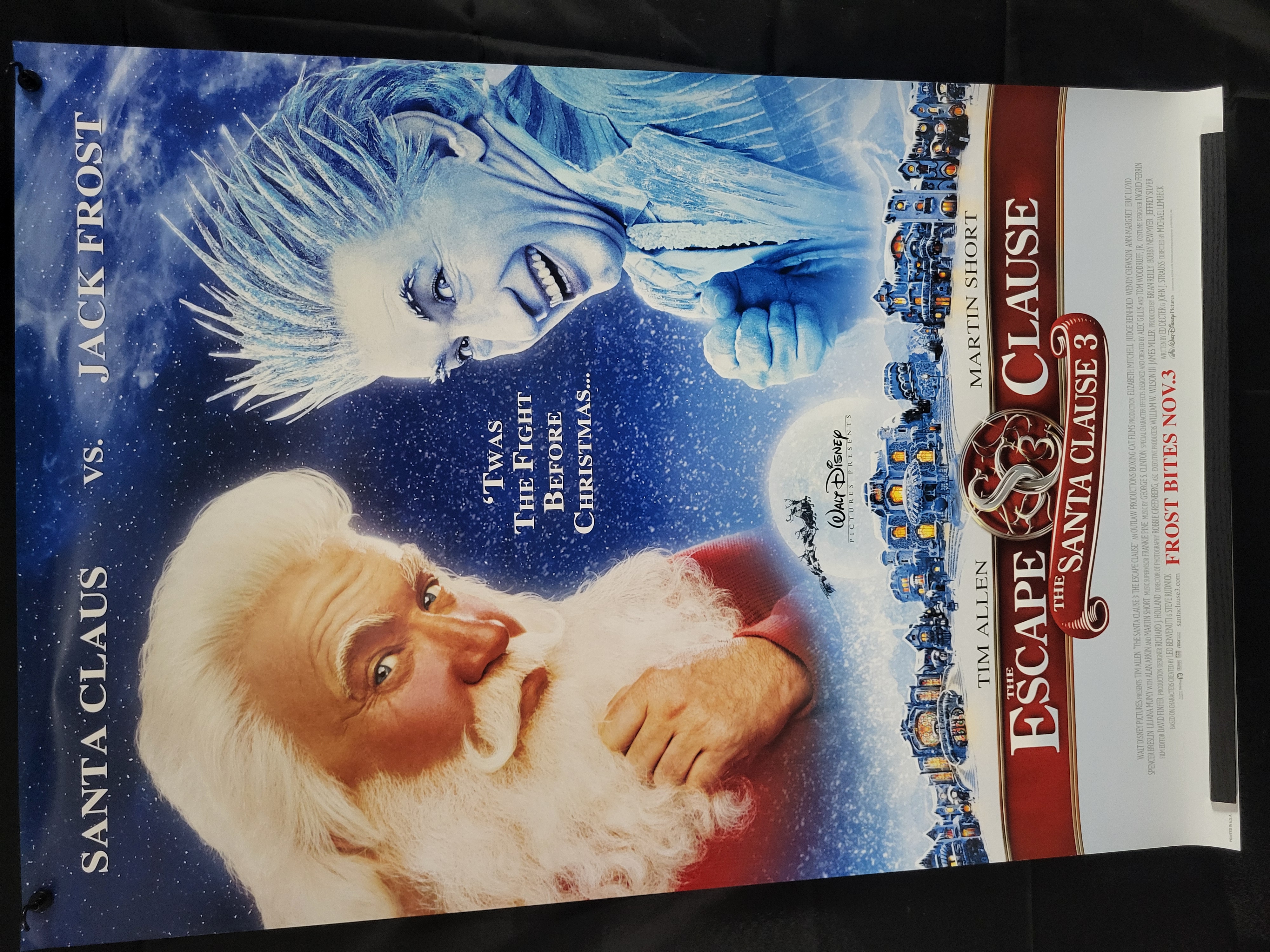 BID PER WHAT YOU SEE IN THE PHOTO, NOT THE AI GENERATED TITLES AND DESCRIPTIONS! An original promotional movie poster for the 2006 Walt Disney Pictures film The Santa Clause 3: The Escape Clause. The poster is printed on glossy paper and features a design depicting lead actors Tim Allen as Santa Claus and Martin Short as Jack Frost against a blue, snow-dusted background. Text includes the film title, cast names, the tagline ‘TWAS THE FIGHT BEFORE CHRISTMAS…, and the promotional release date FROST BITES NOV. 3. A detailed production credits block is printed along the right margin.
