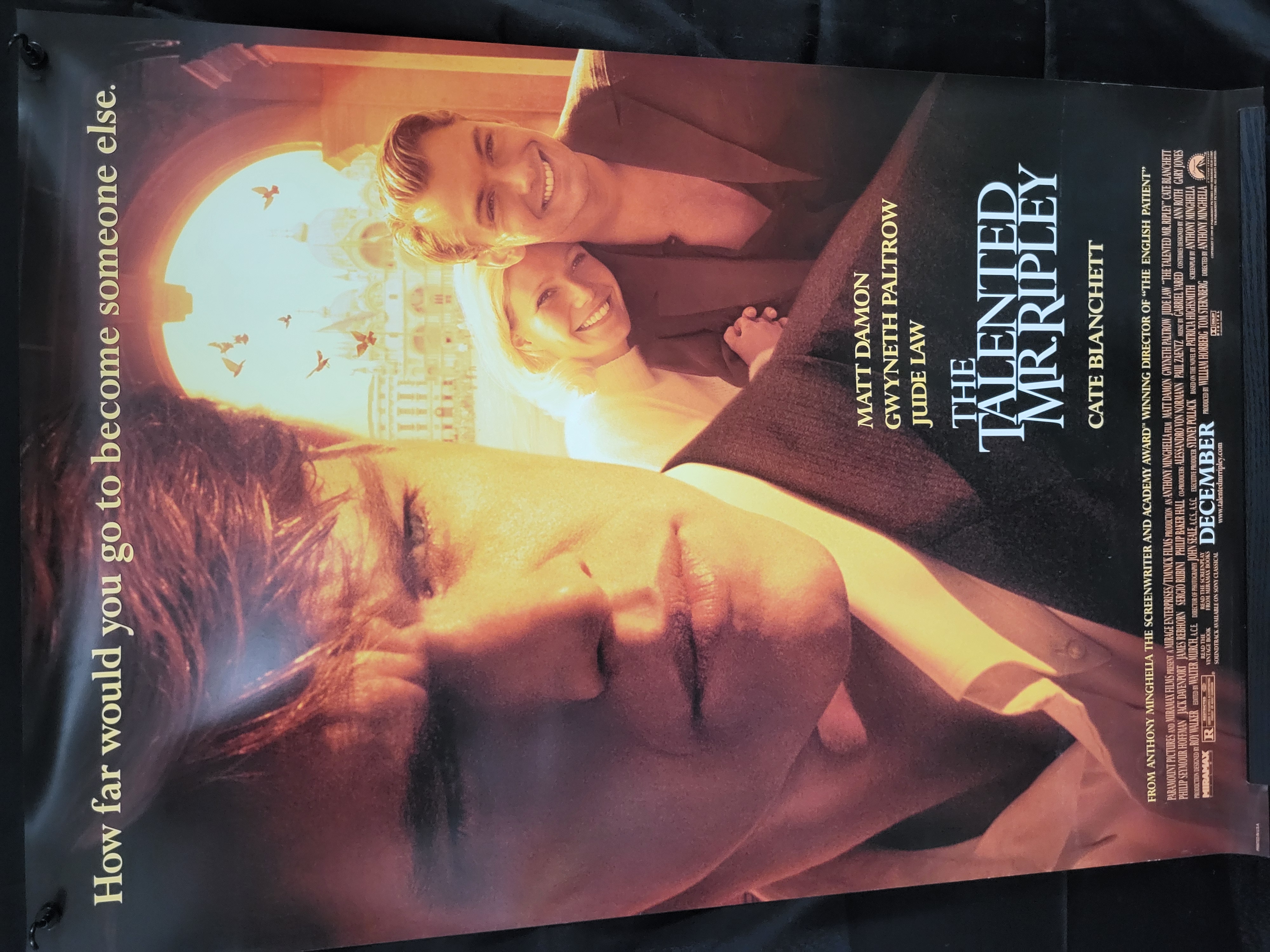BID PER WHAT YOU SEE IN THE PHOTO, NOT THE AI GENERATED TITLES AND DESCRIPTIONS! An original theatrical movie poster for the 1999 film The Talented Mr. Ripley, directed by Anthony Minghella. The poster features a sepia-toned composite photographic design. The foreground displays a large-scale close-up of Matt Damon, with smaller figures of Gwyneth Paltrow and Jude Law positioned against an Italian architectural background. The left margin contains the tagline How far would you go to become someone else. The right side lists the film title and lead cast members, including Matt Damon, Gwyneth Paltrow, Jude Law, and Cate Blanchett. A detailed credit billing block is located at the bottom right corner, featuring logos for Miramax and Paramount Pictures and indicating a December release. The poster is printed on glossy paper stock.