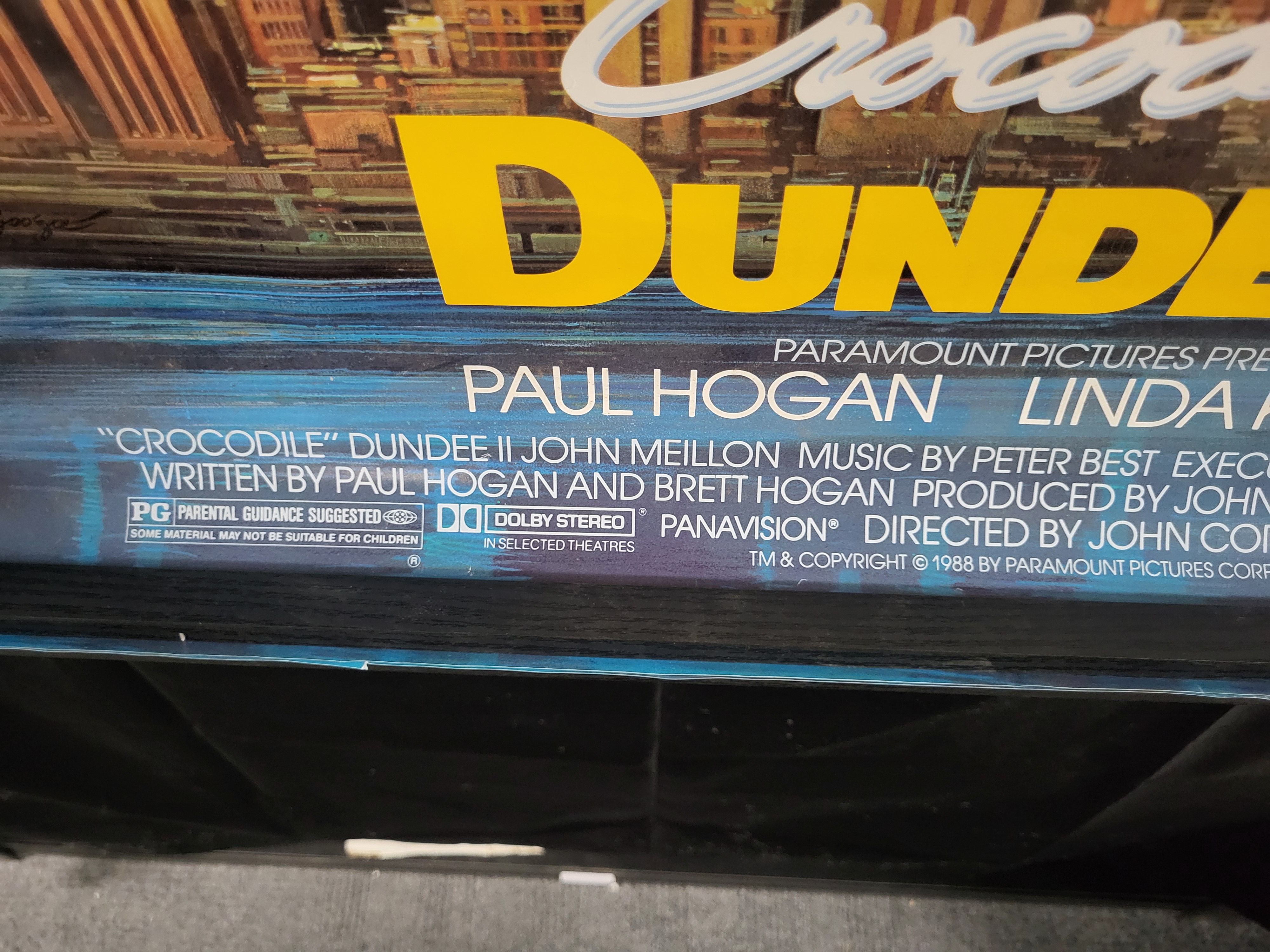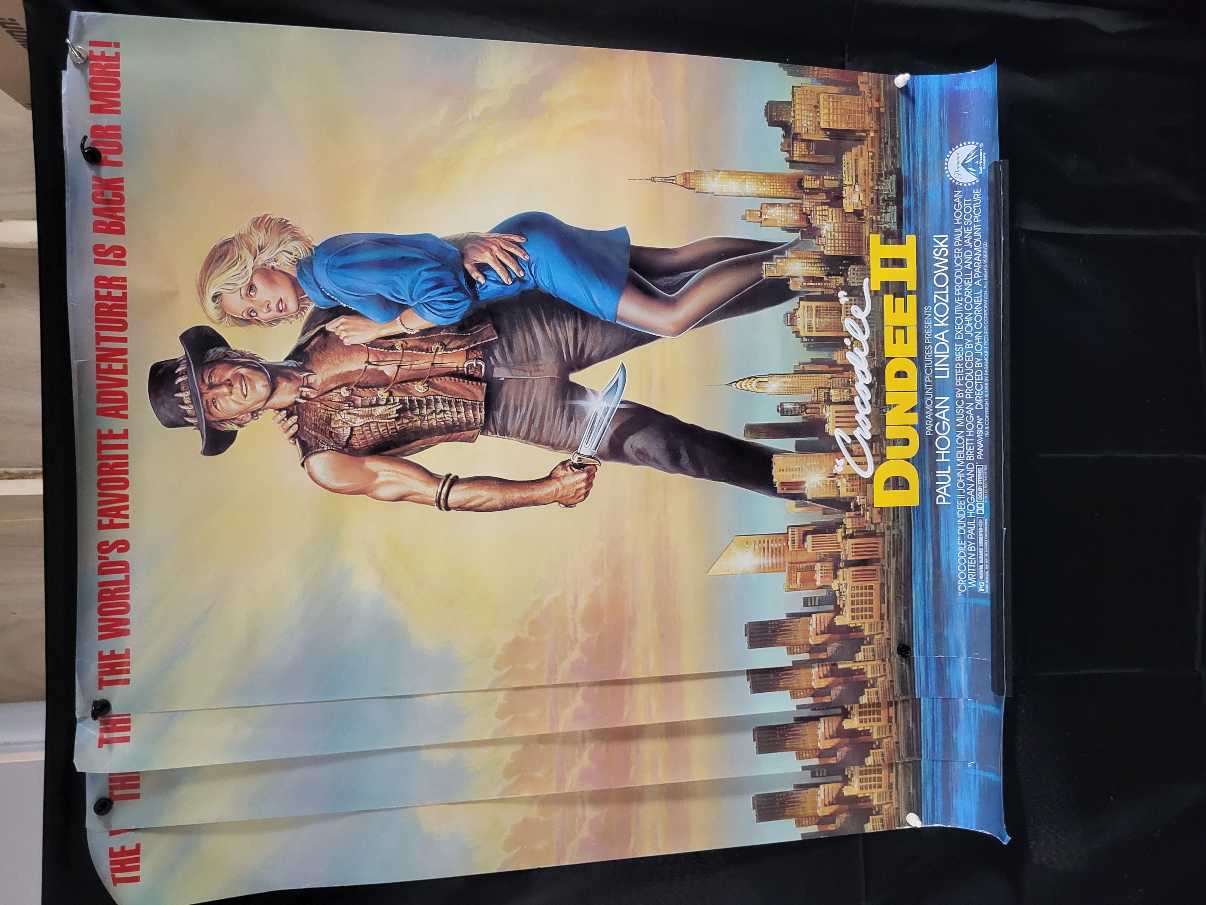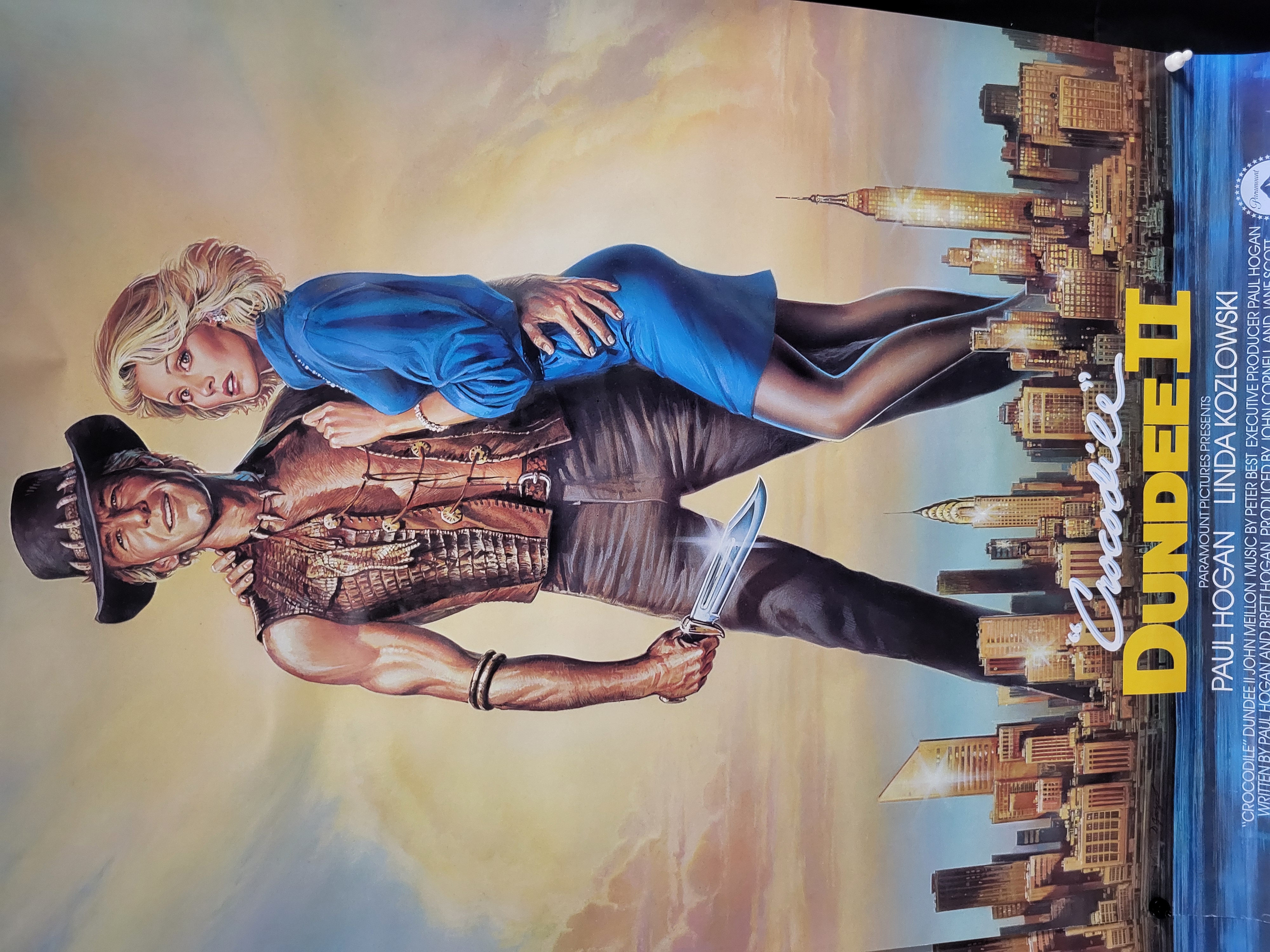 BID PER WHAT YOU SEE IN THE PHOTO, NOT THE AI GENERATED TITLES AND DESCRIPTIONS! A group of original paper movie posters for the 1988 Paramount Pictures film Crocodile Dundee II. The illustrated artwork depicts the central characters, portrayed by Paul Hogan and Linda Kozlowski, set against a New York City skyline at sunset. The character of Michael J. Crocodile Dundee is shown brandishing a large knife. Promotional text along the side reads, THE WORLD’S FAVORITE ADVENTURER IS BACK FOR MORE! The lower credit block includes the names of the cast and crew, including Paul Hogan, Linda Kozlowski, and director John Cornell, with a printed copyright date of 1988 by Paramount Pictures Corp.