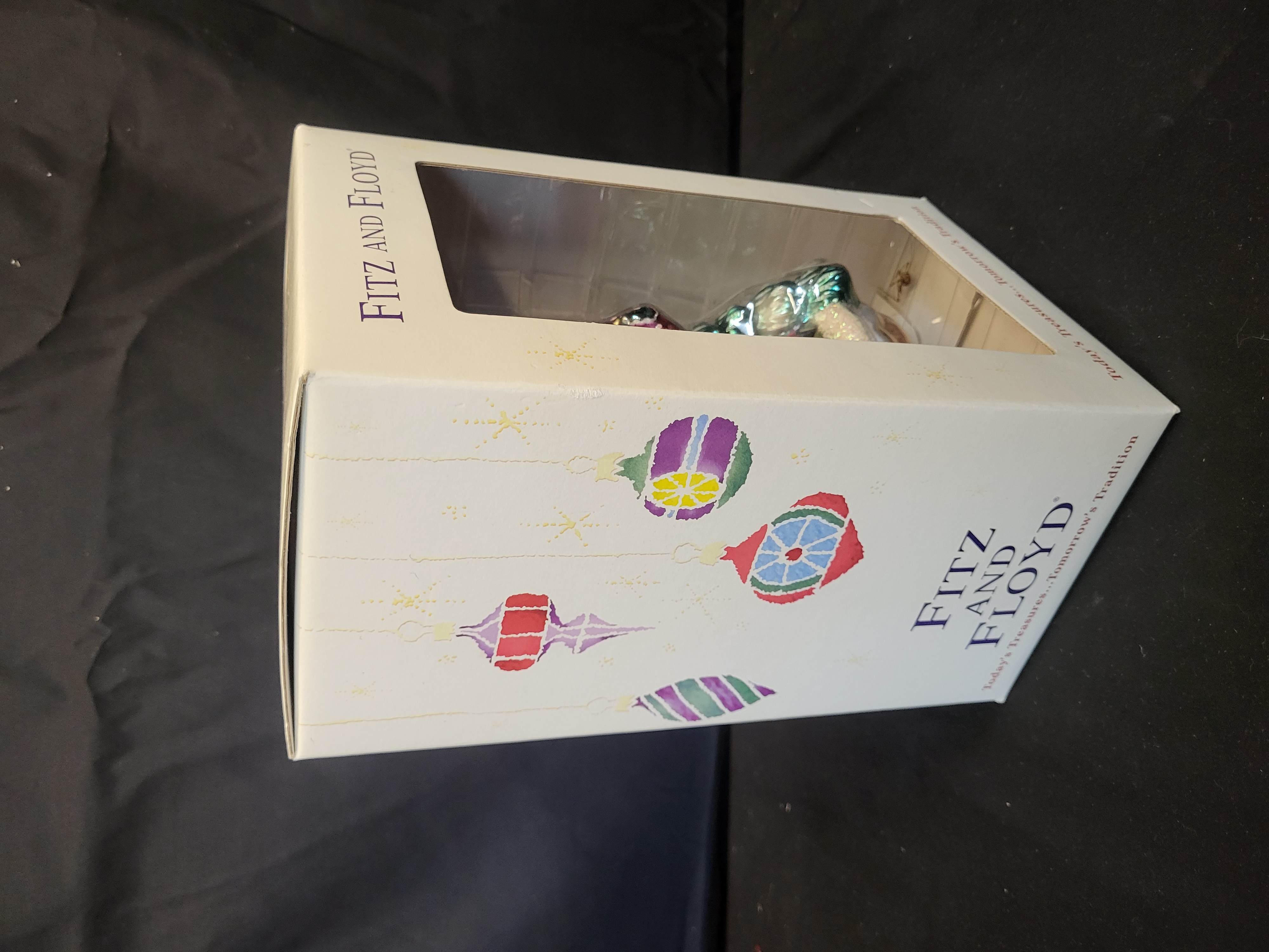 BID PER WHAT YOU SEE IN THE PHOTO, NOT THE AI GENERATED TITLES AND DESCRIPTIONS! A Fitz and Floyd hand-painted blown glass Christmas ornament featuring a Santa Claus figure carrying a green tree. The ornament is detailed with metallic finishes and glitter accents throughout the design. The item is presented in its original white retail packaging, which includes a clear display window and decorative illustrations. The packaging prominently features the Fitz and Floyd brand name and the slogan Today’s Treasures… Tomorrow’s Tradition. This hand-crafted glass piece follows the traditional European style of holiday ornaments.