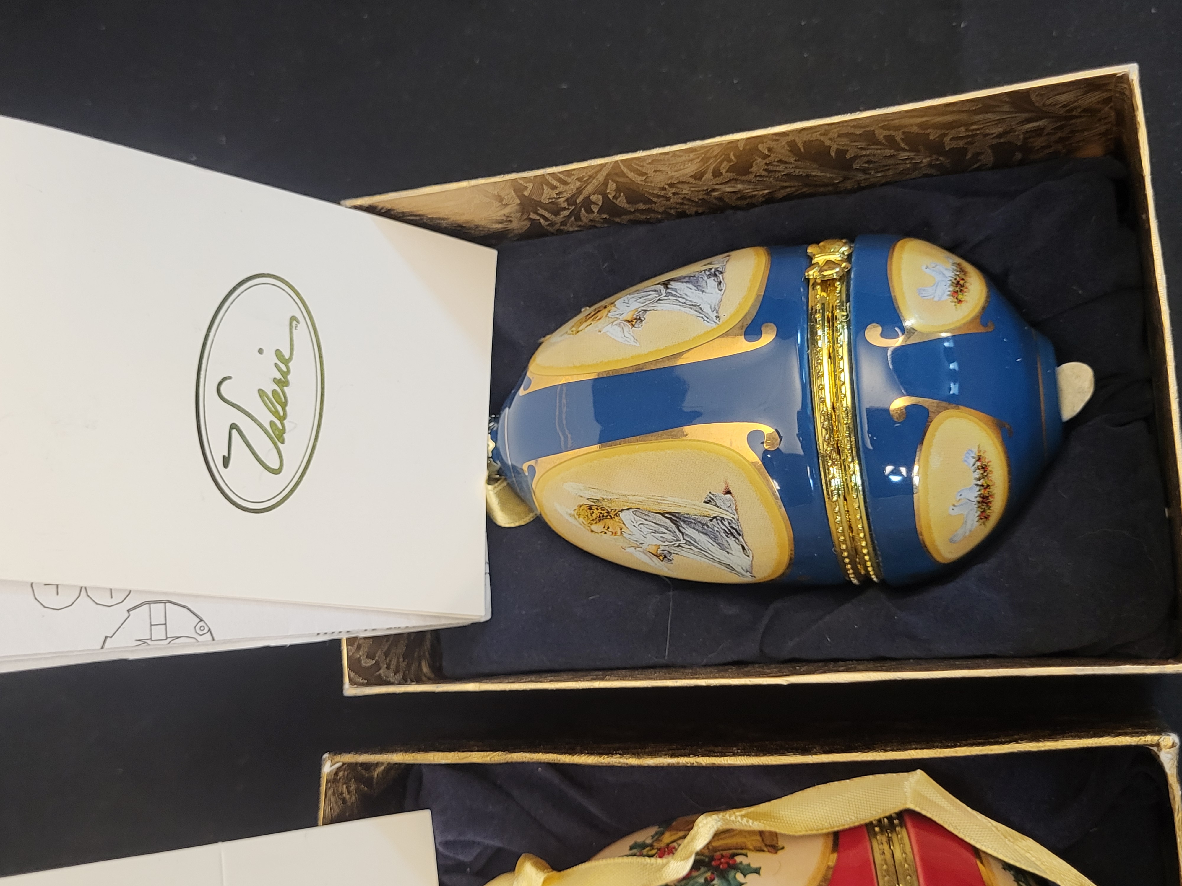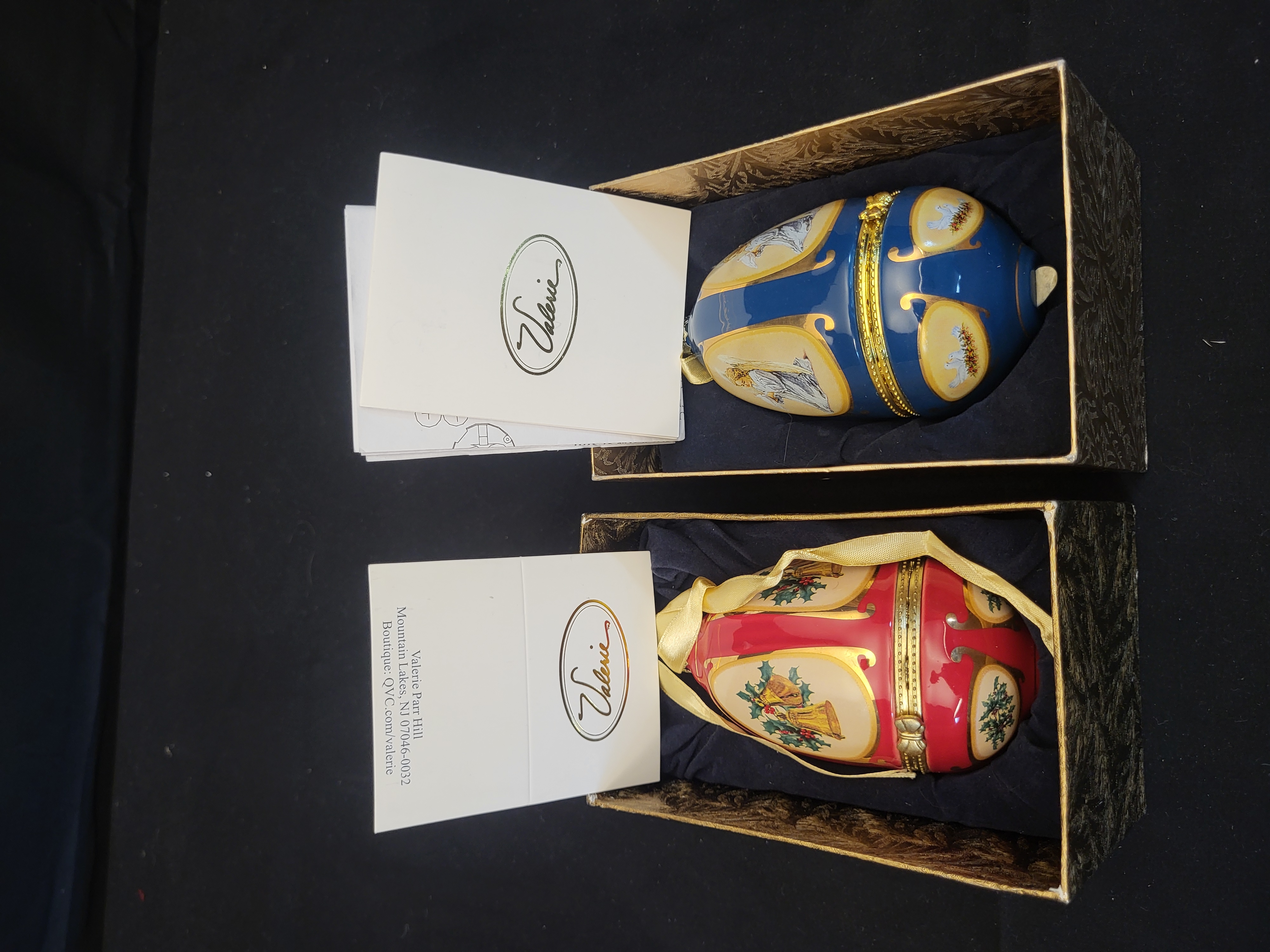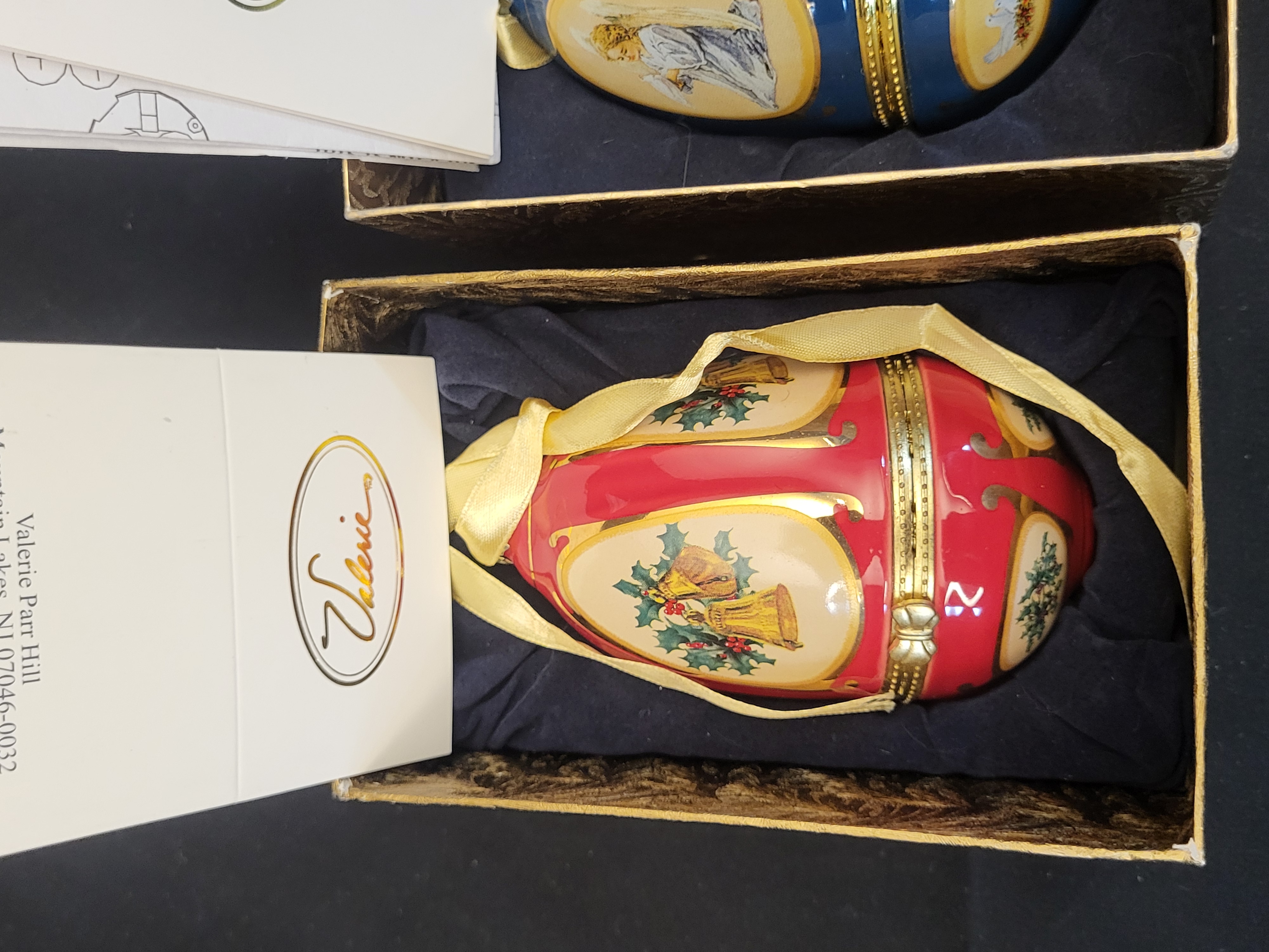BID PER WHAT YOU SEE IN THE PHOTO, NOT THE AI GENERATED TITLES AND DESCRIPTIONS! A pair of decorative porcelain egg-shaped ornaments from the Valerie Parr Hill collection. Each egg is constructed with a hinged gold-tone metal band that allows it to function as a small trinket box. One ornament is finished in a cobalt blue glaze with white angel motifs, while the other is finished in a red glaze with holiday bell and holly illustrations. Both designs are set within gold-bordered panels. The ornaments are accompanied by their original hanging ribbons and are housed in gold-patterned presentation boxes with dark interior linings. Included informational cards feature the Valerie logo and contact information for the Valerie Parr Hill boutique via QVC.