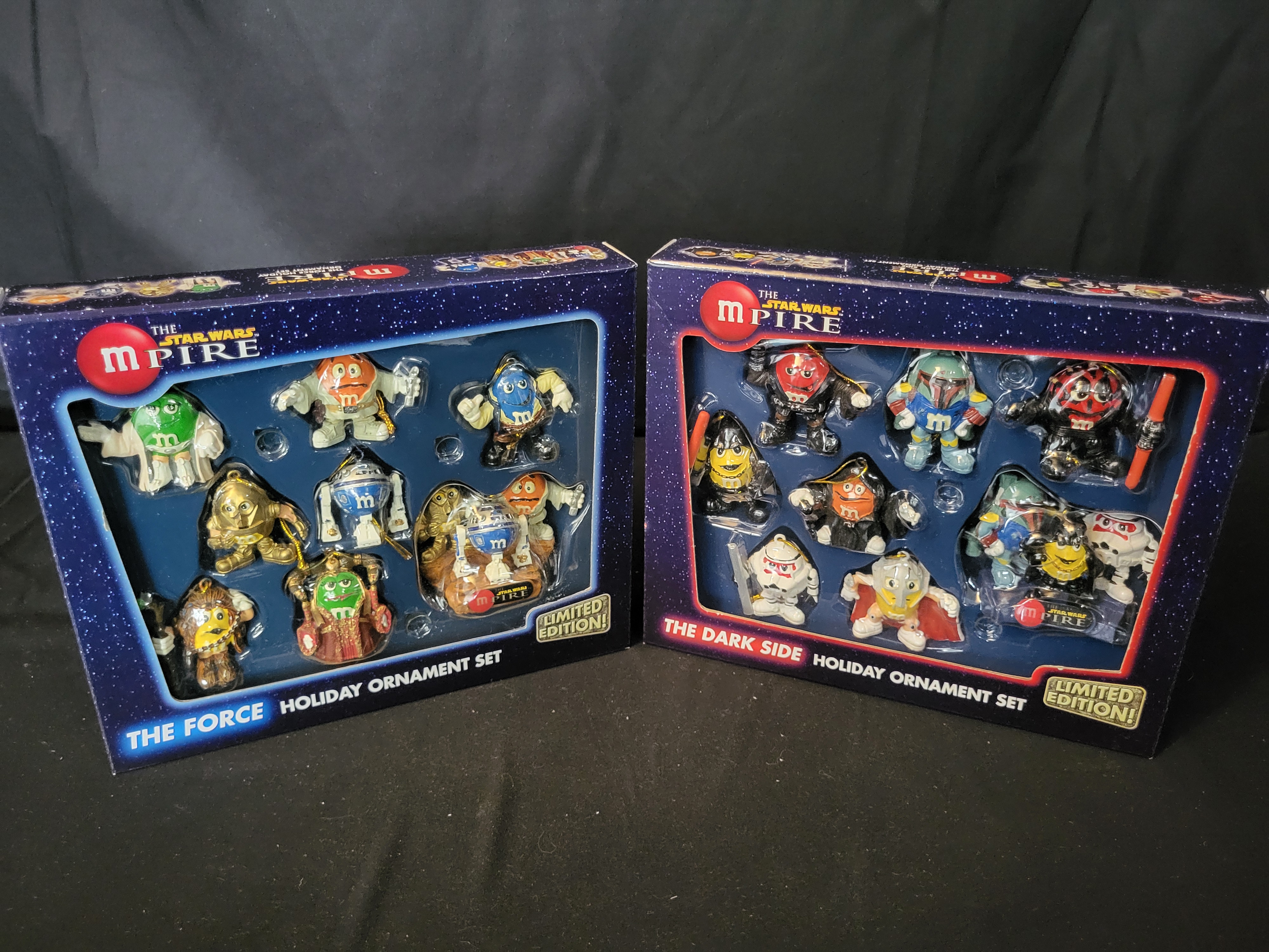 BID PER WHAT YOU SEE IN THE PHOTO, NOT THE AI GENERATED TITLES AND DESCRIPTIONS! A pair of M&M’S Star Wars mPIRE holiday ornament sets, featuring The Force and The Dark Side themed editions. These sets contain various M&M’S characters depicted as iconic Star Wars figures, including representations of Yoda, Darth Vader, Chewbacca, R2-D2, C-3PO, Boba Fett, Stormtroopers, and Queen Amidala. The molded, multi-colored ornaments are equipped with gold-tone hanging cords. Both sets are housed in their original Limited Edition cardboard and plastic window packaging.