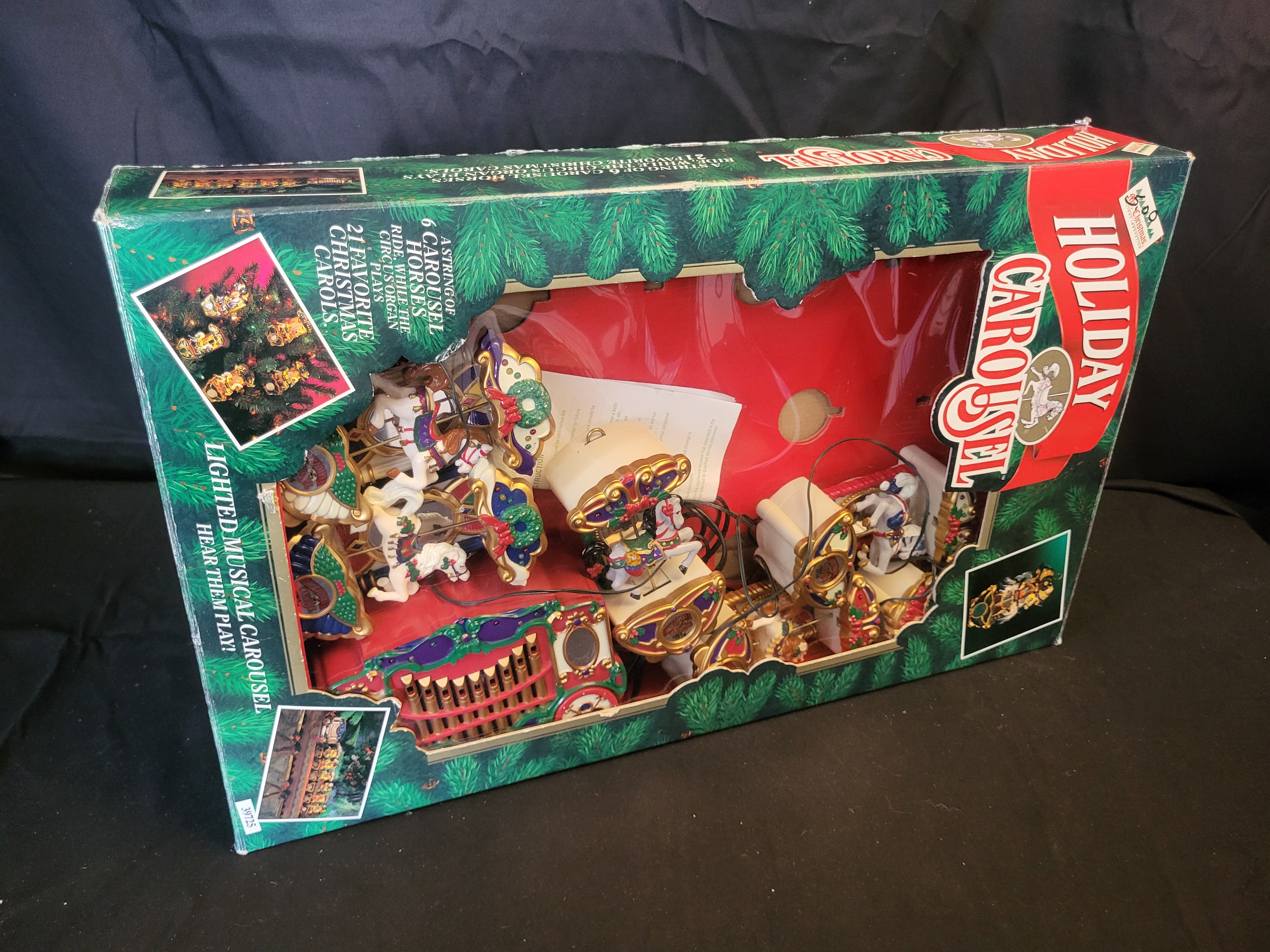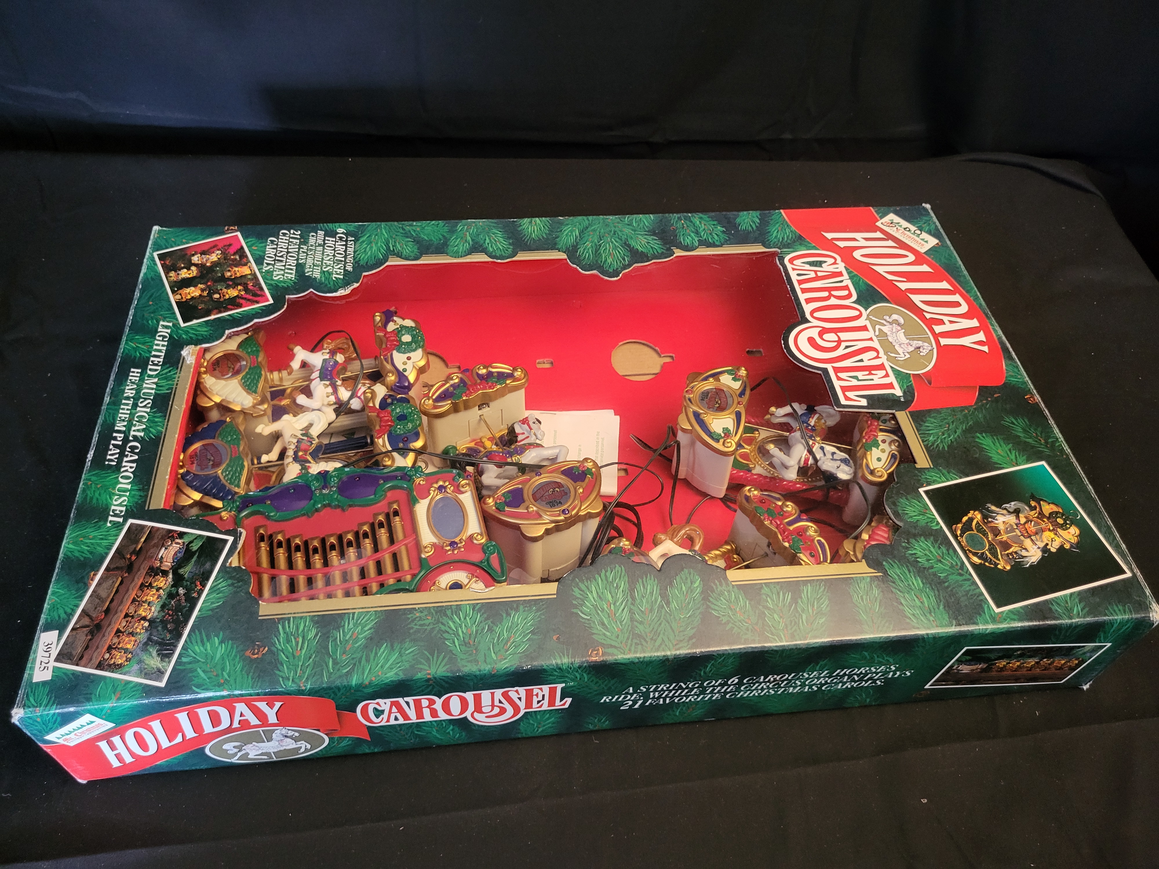 BID PER WHAT YOU SEE IN THE PHOTO, NOT THE AI GENERATED TITLES AND DESCRIPTIONS! A Mr. Christmas Holiday Carousel musical decoration set, circa 1992. The collection includes a set of carousel horses and a central circus organ unit, all constructed from molded plastic with painted details. The components are connected by a wiring harness. According to the packaging, the unit is designed to play 21 Christmas carols while illuminated. The set is housed in its original illustrated window box.