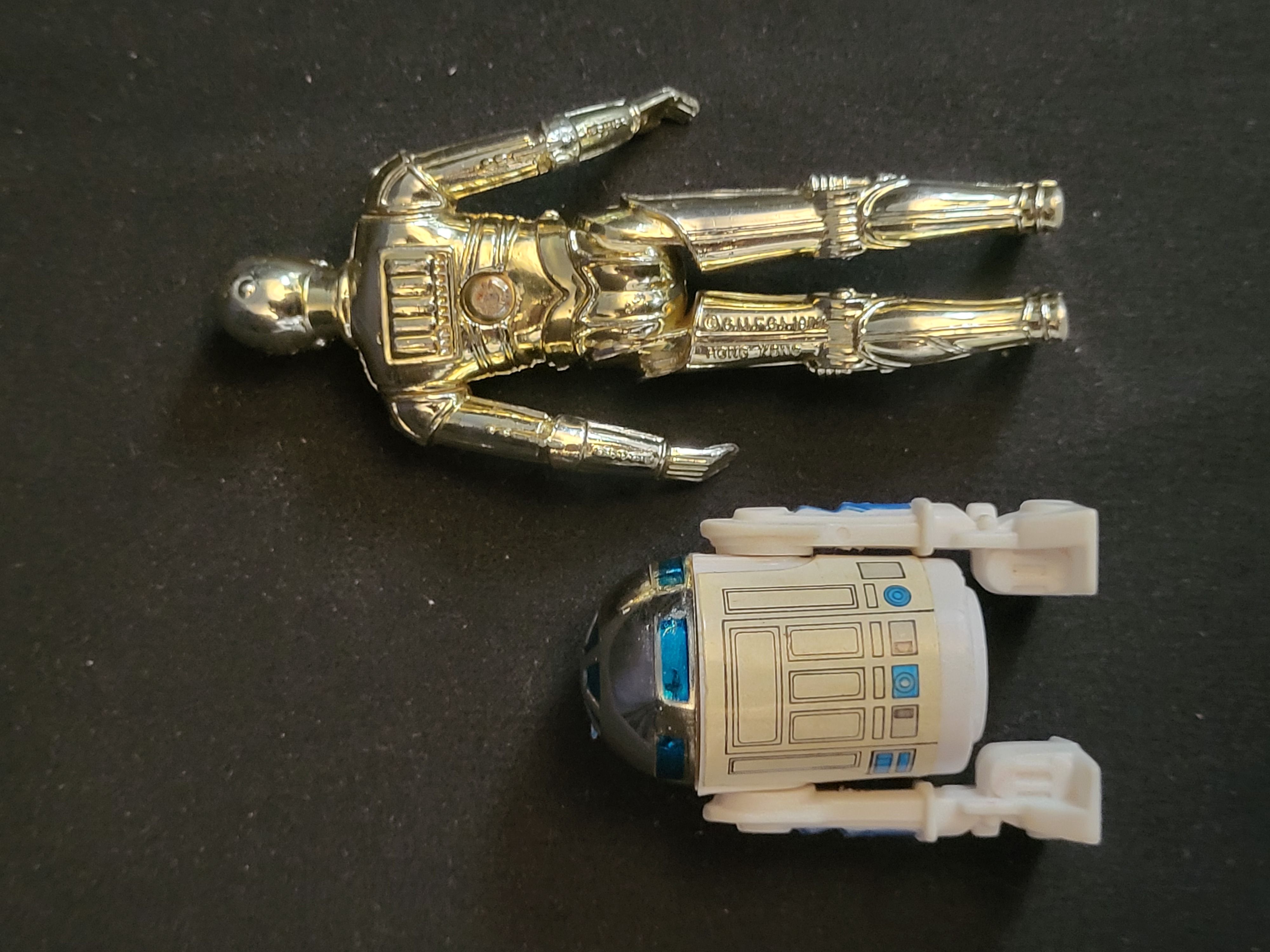 BID PER WHAT YOU SEE IN THE PHOTO, NOT THE AI GENERATED TITLES AND DESCRIPTIONS! A pair of vintage Kenner Star Wars action figures representing the characters C-3PO and R2-D2. The C-3PO figure is constructed from molded plastic with a metallic gold-toned finish and features articulation at the shoulders and hips. It is marked on the reverse of the right leg with © G.M.F.G.I. 1977 and HONG KONG. The R2-D2 figure consists of a white plastic body with a silver-toned dome and blue-printed detailing.