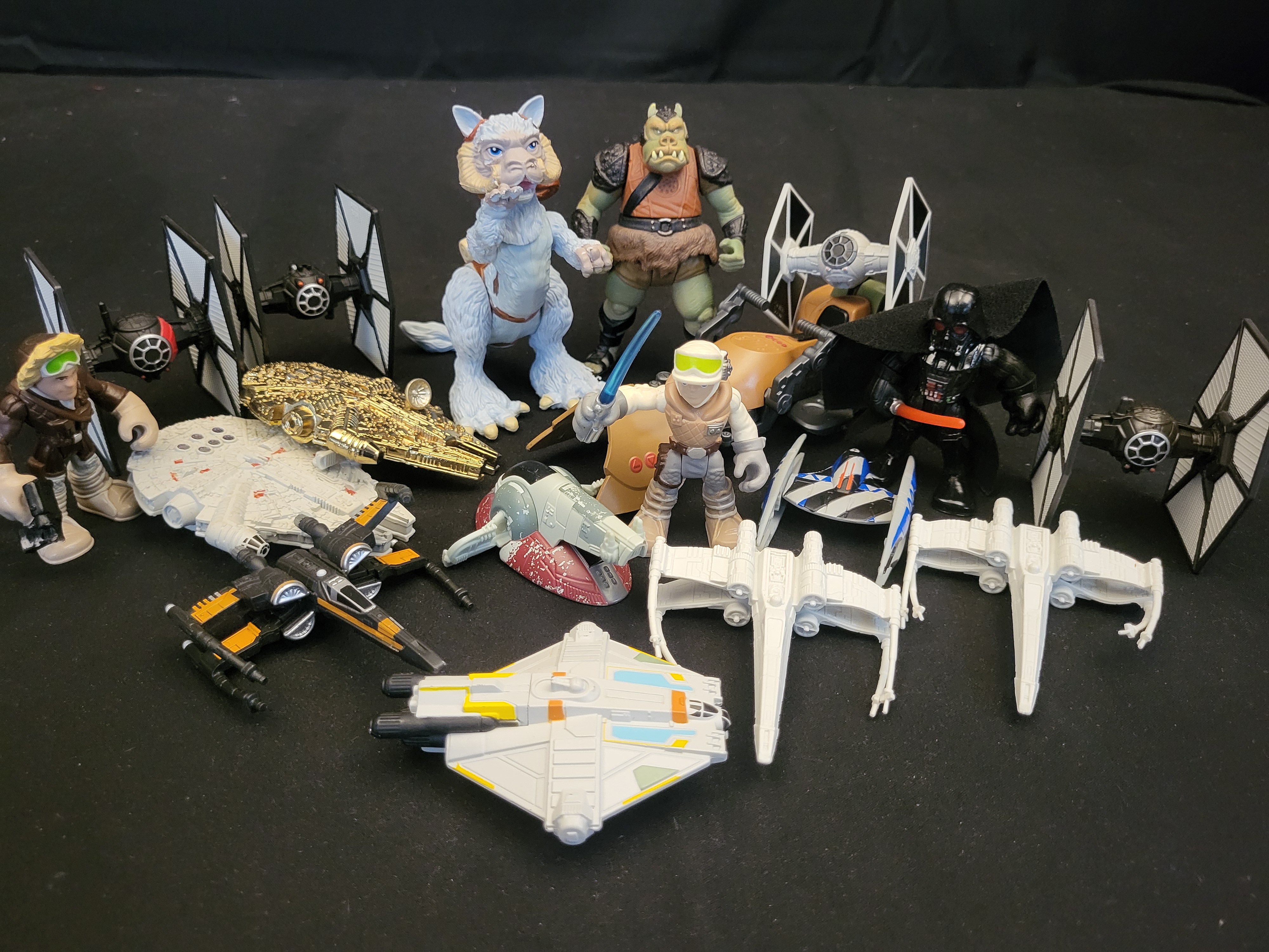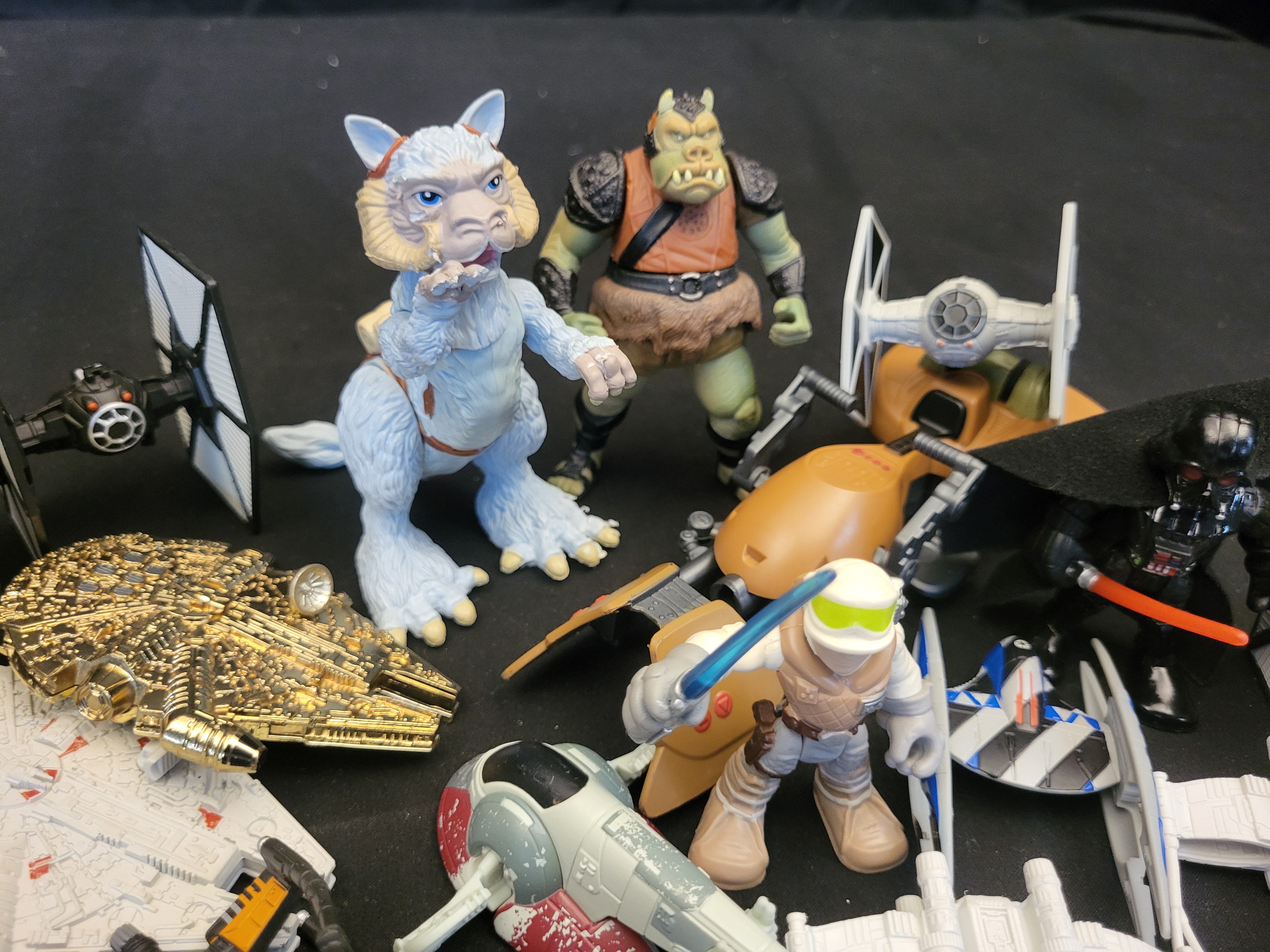BID PER WHAT YOU SEE IN THE PHOTO, NOT THE AI GENERATED TITLES AND DESCRIPTIONS! A collection of Star Wars themed toys comprising various action figures and vehicle models. The lot includes stylized figures from the Galactic Heroes line, featuring characters such as Darth Vader with a fabric cape, Luke Skywalker and Han Solo in cold-weather gear, a Gamorrean Guard, and a Wampa creature. The assortment also features multiple starships and vehicles from the Micro Machines line of varying scales and styles. Included are TIE Fighters, X-wing starfighters, a Speeder Bike, Slave I, the Ghost, and two iterations of the Millennium Falcon, one of which features a distinctive gold-toned finish. The items are constructed primarily of molded plastic.