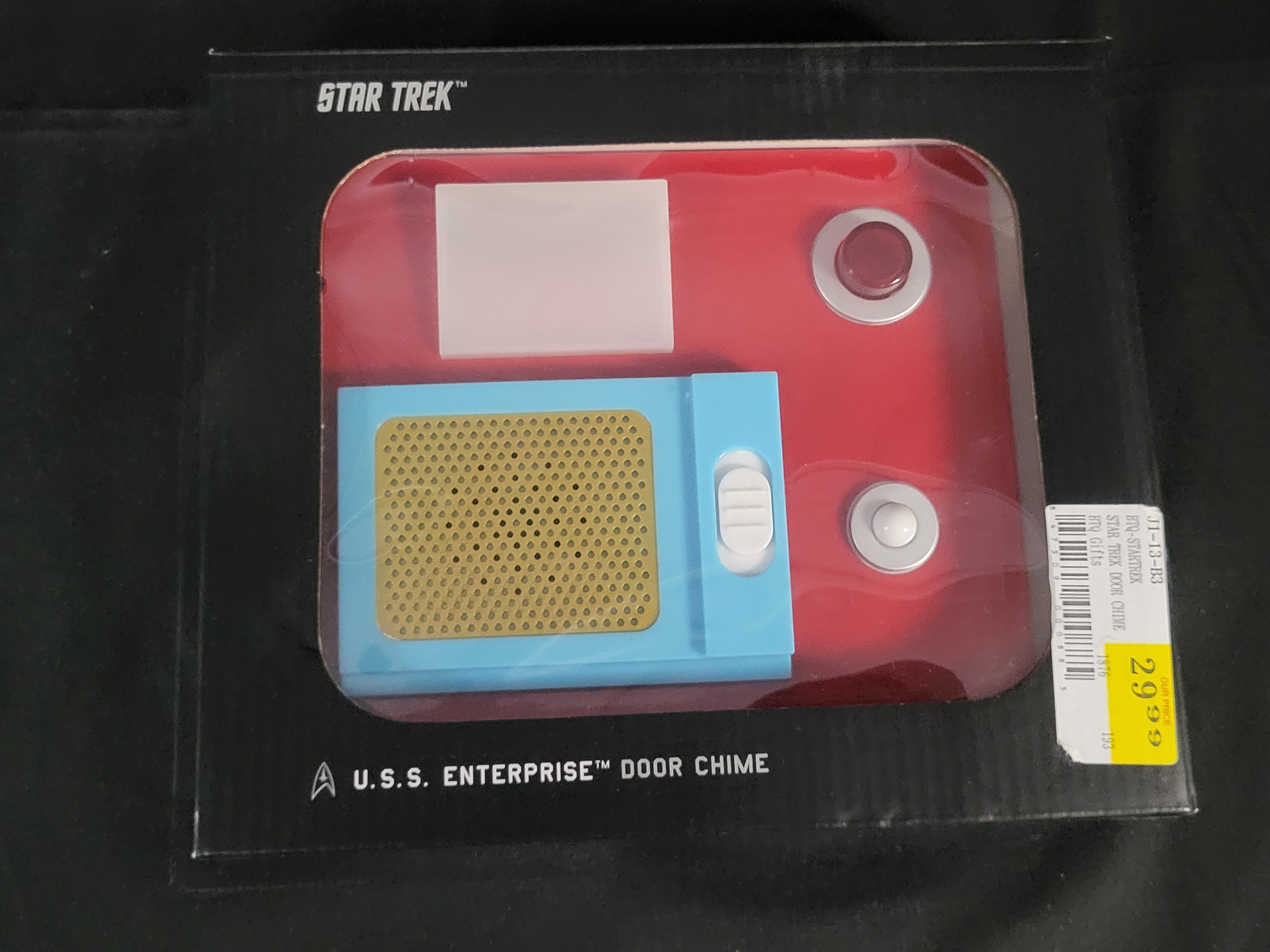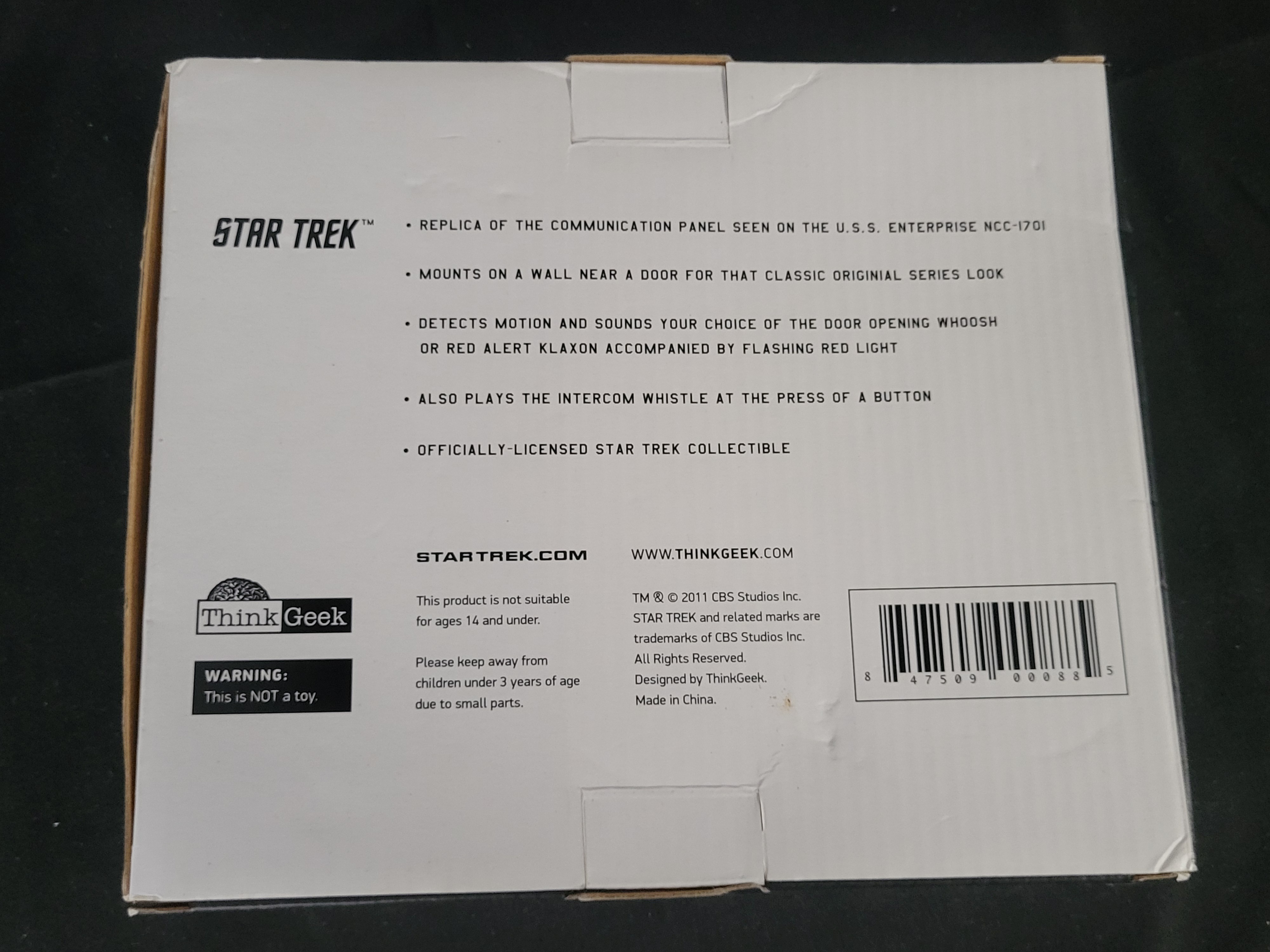 BID PER WHAT YOU SEE IN THE PHOTO, NOT THE AI GENERATED TITLES AND DESCRIPTIONS! A ThinkGeek Star Trek: The Original Series Electronic Door Chime, manufactured circa 2011. This officially-licensed collectible is designed as a replica of the communication panel from the U.S.S. Enterprise NCC-1701. The device is constructed with a plastic casing featuring a light blue body, a gold-tone perforated speaker grille, and integrated electronic components for light and sound functions. The unit is motion-sensitive and programmed with three distinct sound effects: the door opening whoosh, a red alert klaxon accompanied by a flashing red light, and an intercom whistle. Sounds can also be activated via a manual push button. The reverse of the packaging bears the ThinkGeek logo and copyright information for CBS Studios Inc. dated 2011. The item is housed in its original black window-box retail packaging.