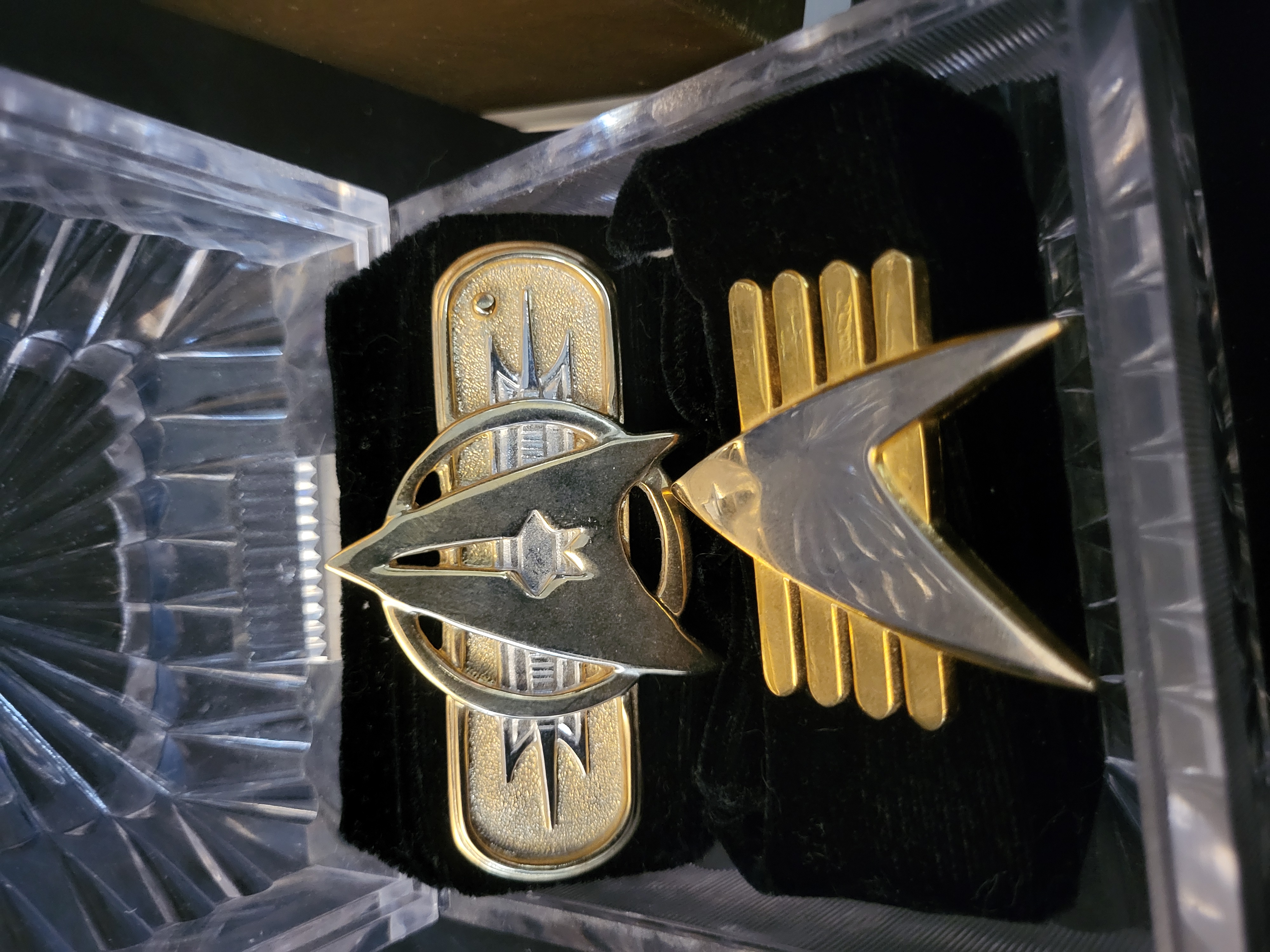 BID PER WHAT YOU SEE IN THE PHOTO, NOT THE AI GENERATED TITLES AND DESCRIPTIONS! A collection of Star Trek: The Next Generation themed memorabilia. The grouping features a 1994 Hallmark Magic Keepsake Ornament of a Klingon Bird-of-Prey, which is noted on the packaging to include flickering light features. Accompanying the ornament are several metal insignia pins, including Starfleet command and communicator styles, finished in two-tone silver and gold-toned metal. The pins are presented in a faceted clear plastic display case with a black velvet insert. The ornament is housed in its original retail box.
