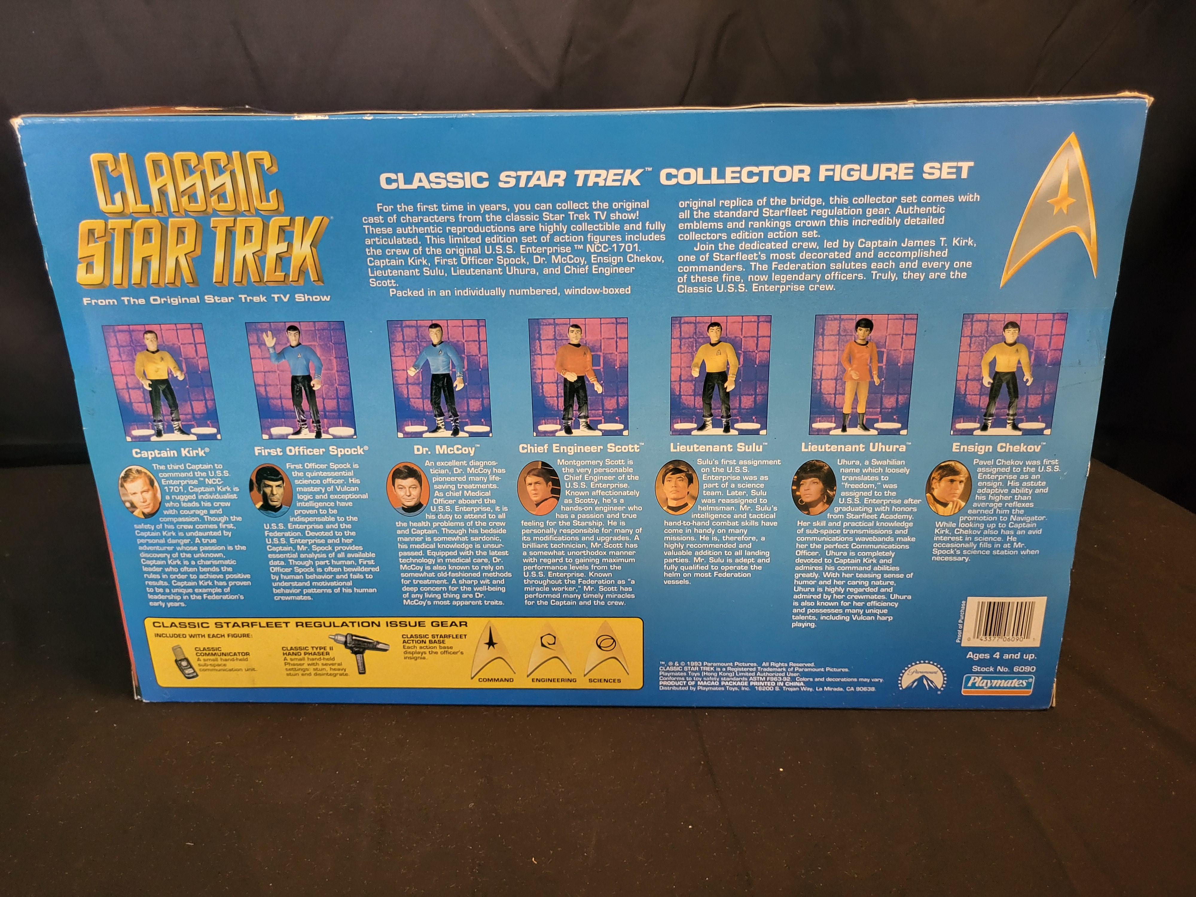 BID PER WHAT YOU SEE IN THE PHOTO, NOT THE AI GENERATED TITLES AND DESCRIPTIONS! A set of articulated plastic action figures from the Playmates Classic Star Trek collection, released in 1993. This limited edition set is individually numbered 142687 of 150,000. The collection depicts the primary cast from the original television series, including Captain James T. Kirk, Mr. Spock, Dr. Leonard McCoy, Chief Engineer Montgomery Scott, Lieutenant Sulu, Lieutenant Uhura, and Ensign Chekov. Included accessories consist of Classic Starfleet Gear such as phasers, communicators, and display bases, along with a captain’s chair. The items are contained within the original illustrated window-box packaging, which features character biographies and technical information on the back panel.