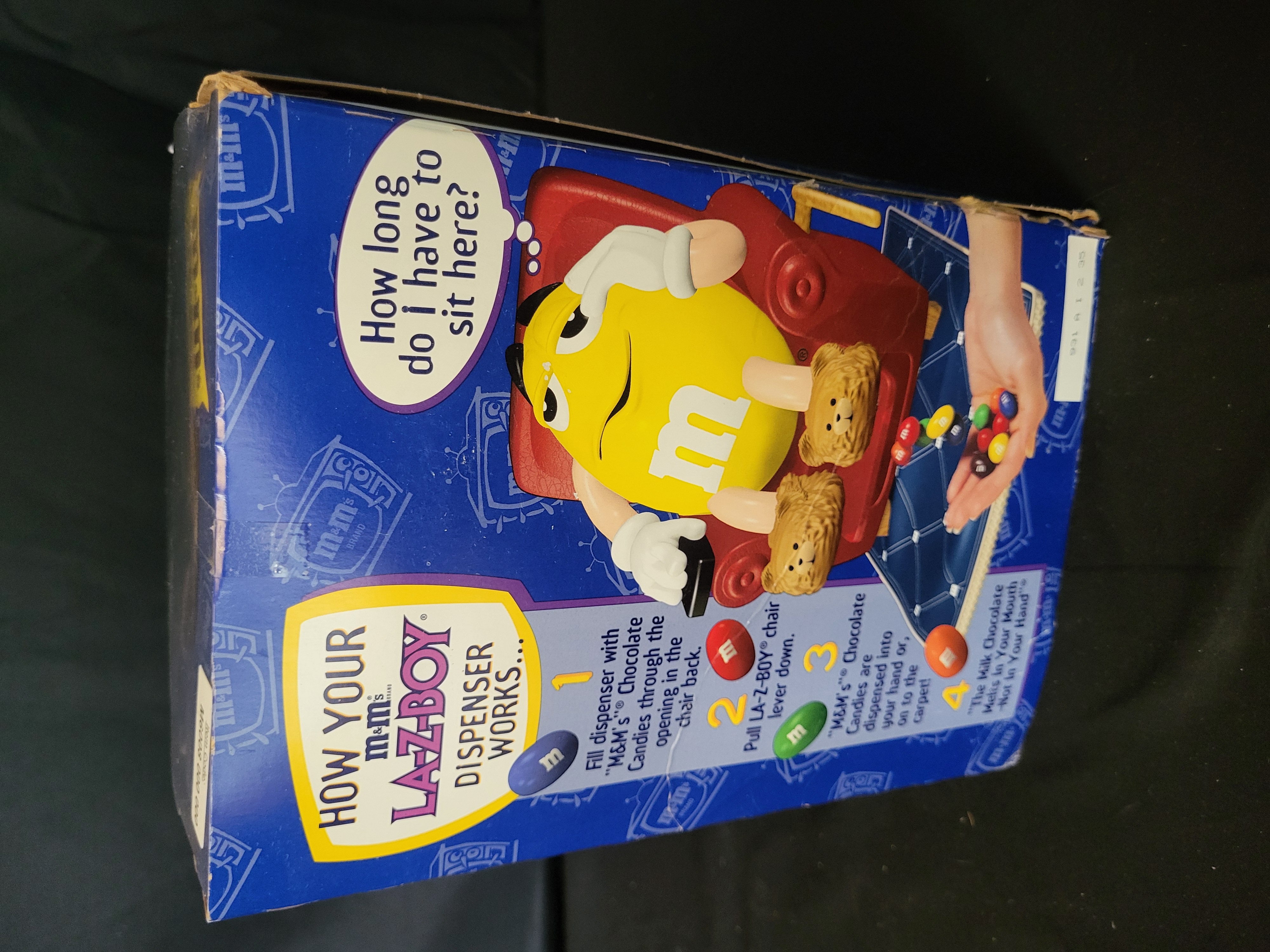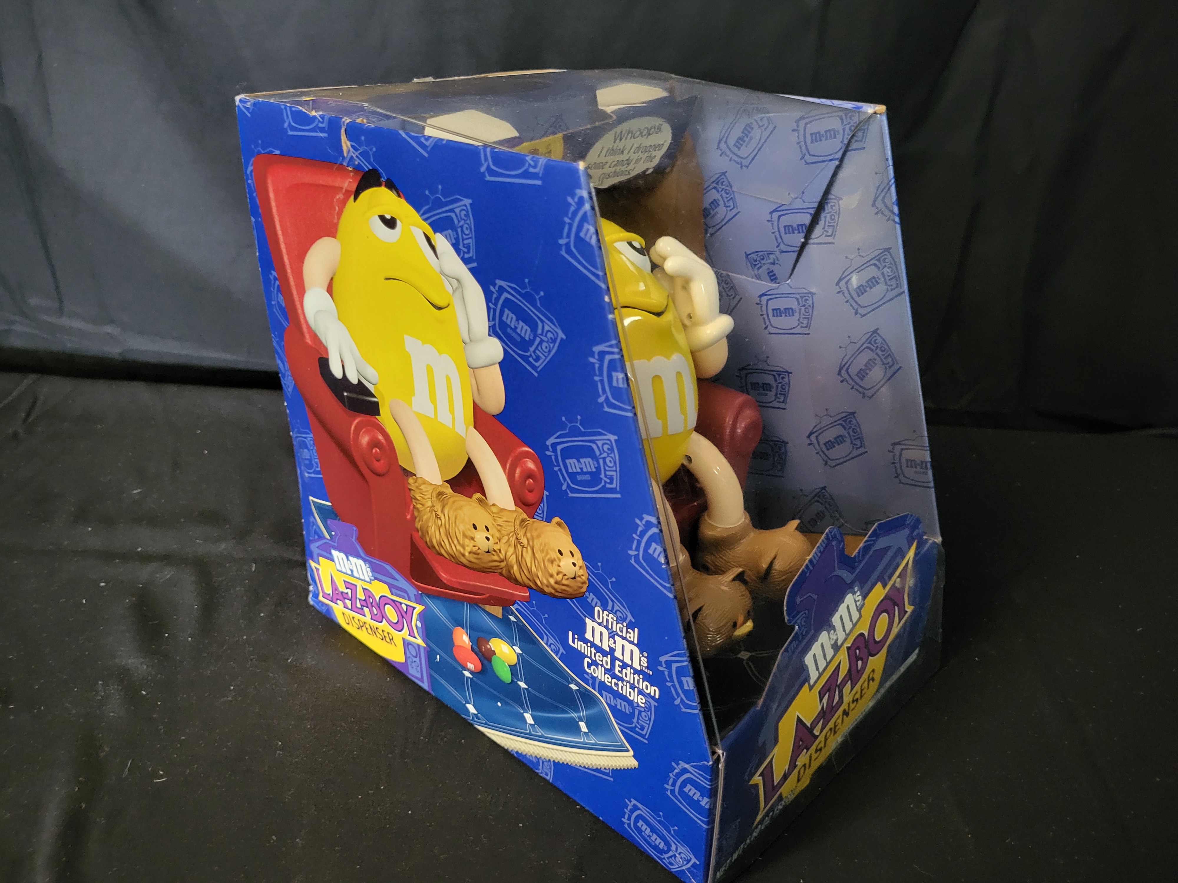 BID PER WHAT YOU SEE IN THE PHOTO, NOT THE AI GENERATED TITLES AND DESCRIPTIONS! An official M&M’s limited edition collectible La-Z-Boy candy dispenser. The plastic figure depicts the yellow character seated in a red recliner, wearing brown slippers and holding a television remote. The item is contained within its original blue and purple illustrated cardboard box featuring a clear plastic display window. The reverse of the packaging includes instructions for operation, detailing how to fill the dispenser through the chair back and dispense candy via the side lever.
