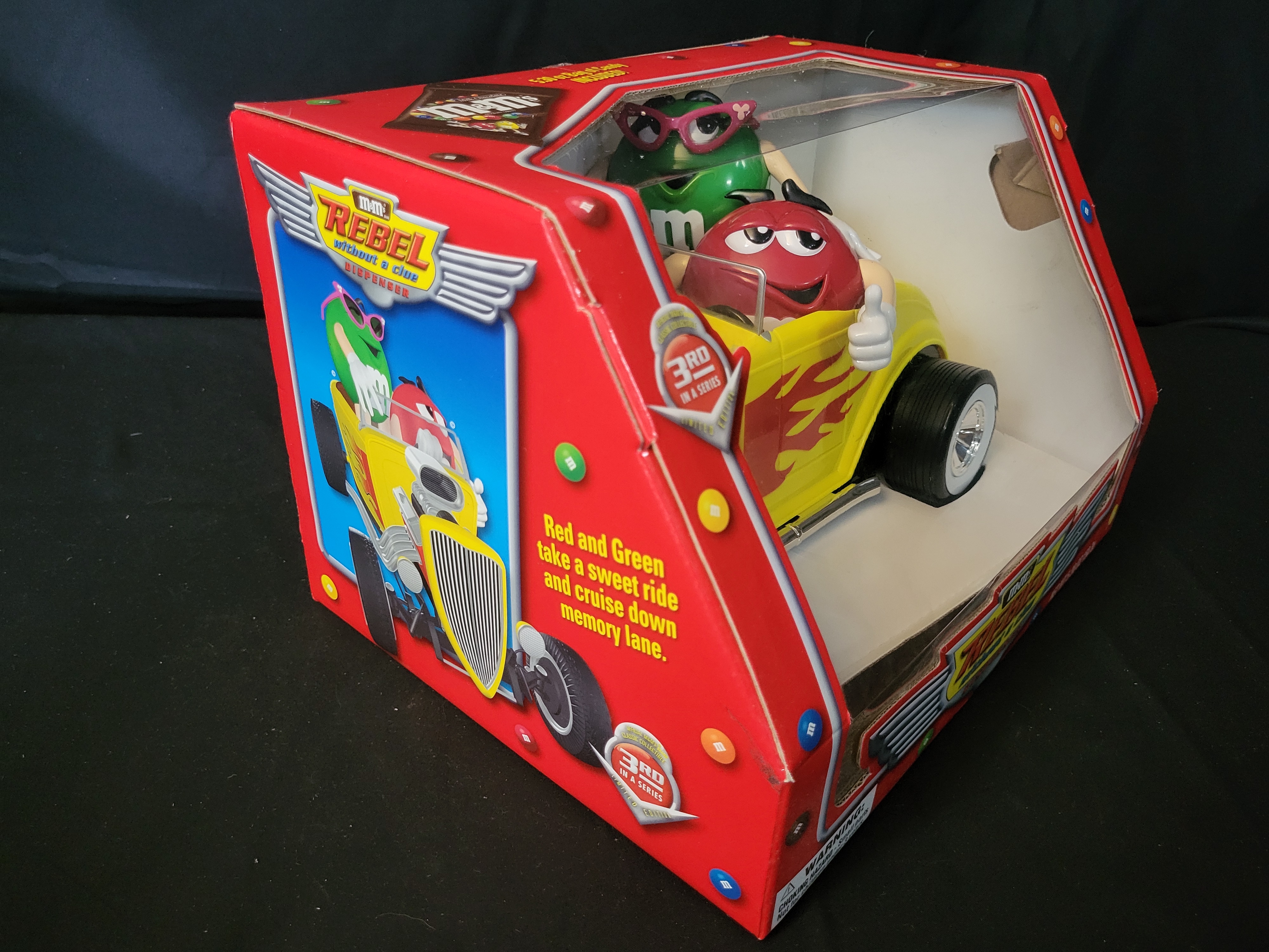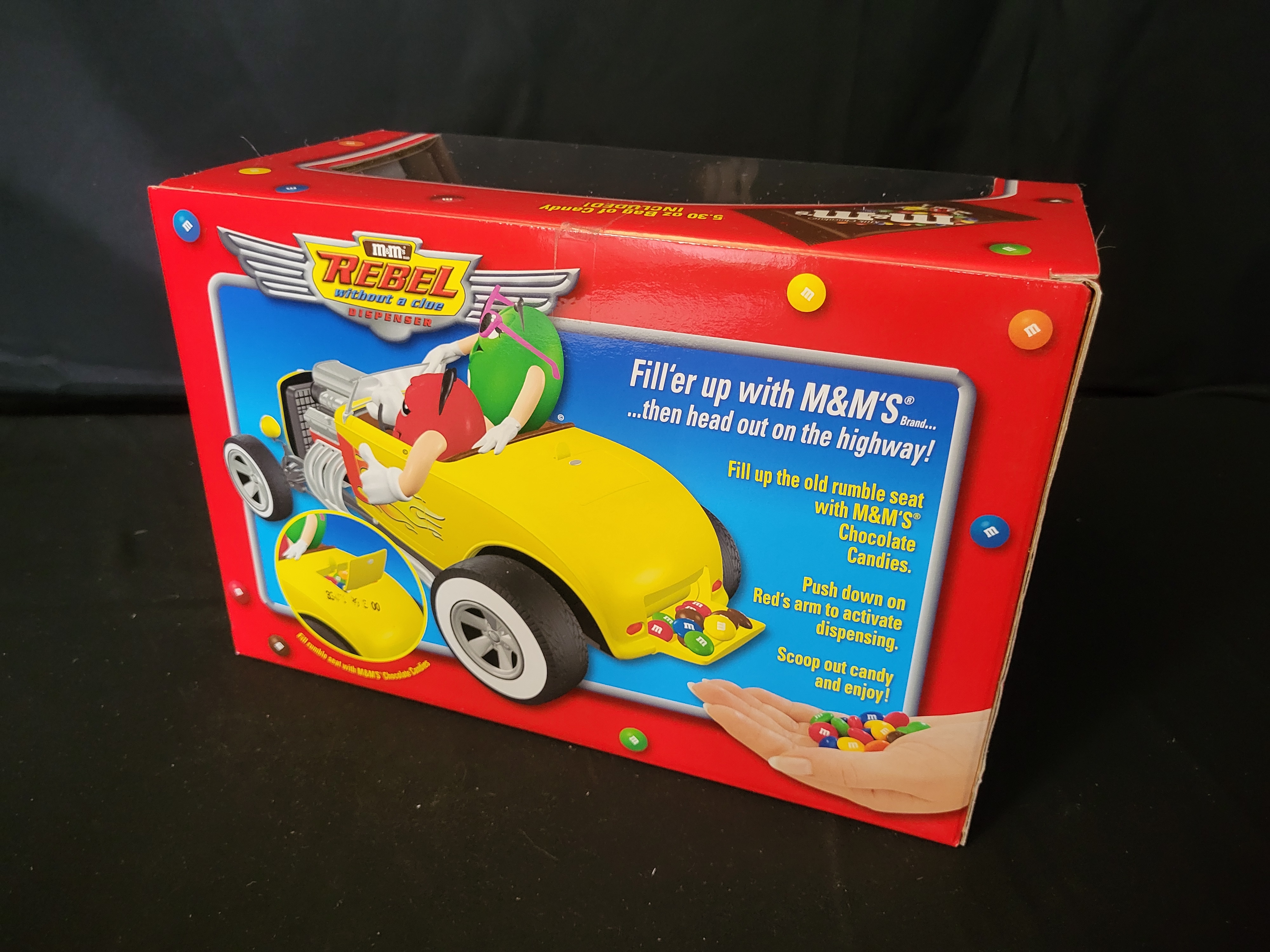 BID PER WHAT YOU SEE IN THE PHOTO, NOT THE AI GENERATED TITLES AND DESCRIPTIONS! M&M’s Rebel Without a Clue candy dispenser, the third release in a series and labeled as a limited edition. The dispenser is constructed from molded plastic and features the brand’s Red and Green characters in a yellow hot rod with red flame decals and chrome-finished plastic components, including a detailed exposed engine. The unit is designed to store candy in the car’s rumble seat and dispense it through the rear bumper when the character’s arm is depressed. The item is housed in its original red cardboard and clear plastic window display packaging, which displays M&M’s Rebel without a clue Dispenser branding and promotional text. The set includes the original 5.30 oz bag of chocolate candies.