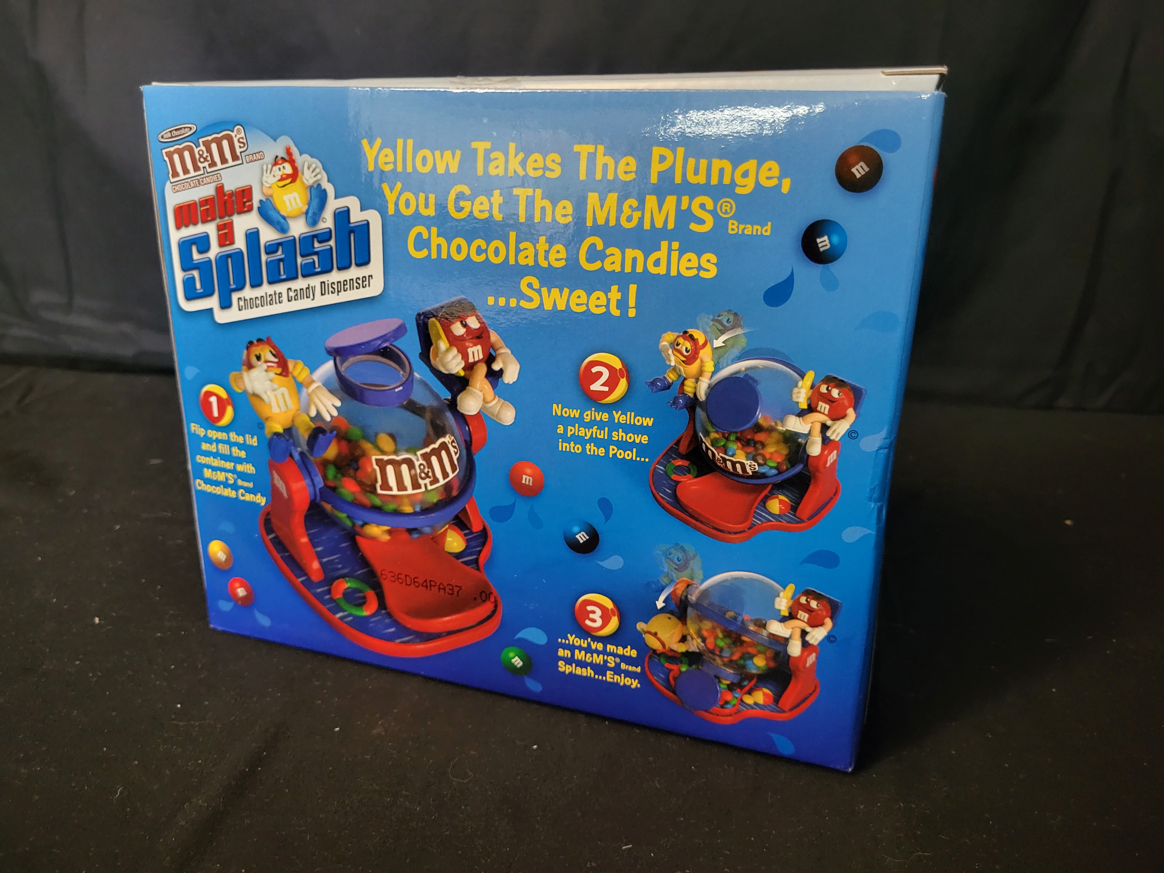 BID PER WHAT YOU SEE IN THE PHOTO, NOT THE AI GENERATED TITLES AND DESCRIPTIONS! An M&M’s brand Make a Splash chocolate candy dispenser, housed in its original illustrated retail packaging. This collectible plastic dispenser features the Red and Yellow M&M’s characters in a pool-themed design. The mechanism functions by tilting the Yellow character to dispense candy from a central clear globe into a red basin. The packaging identifies the item as an Official M&M’s Brand Limited-Edition Collectible Dispenser. The item remains in its original, unopened state.