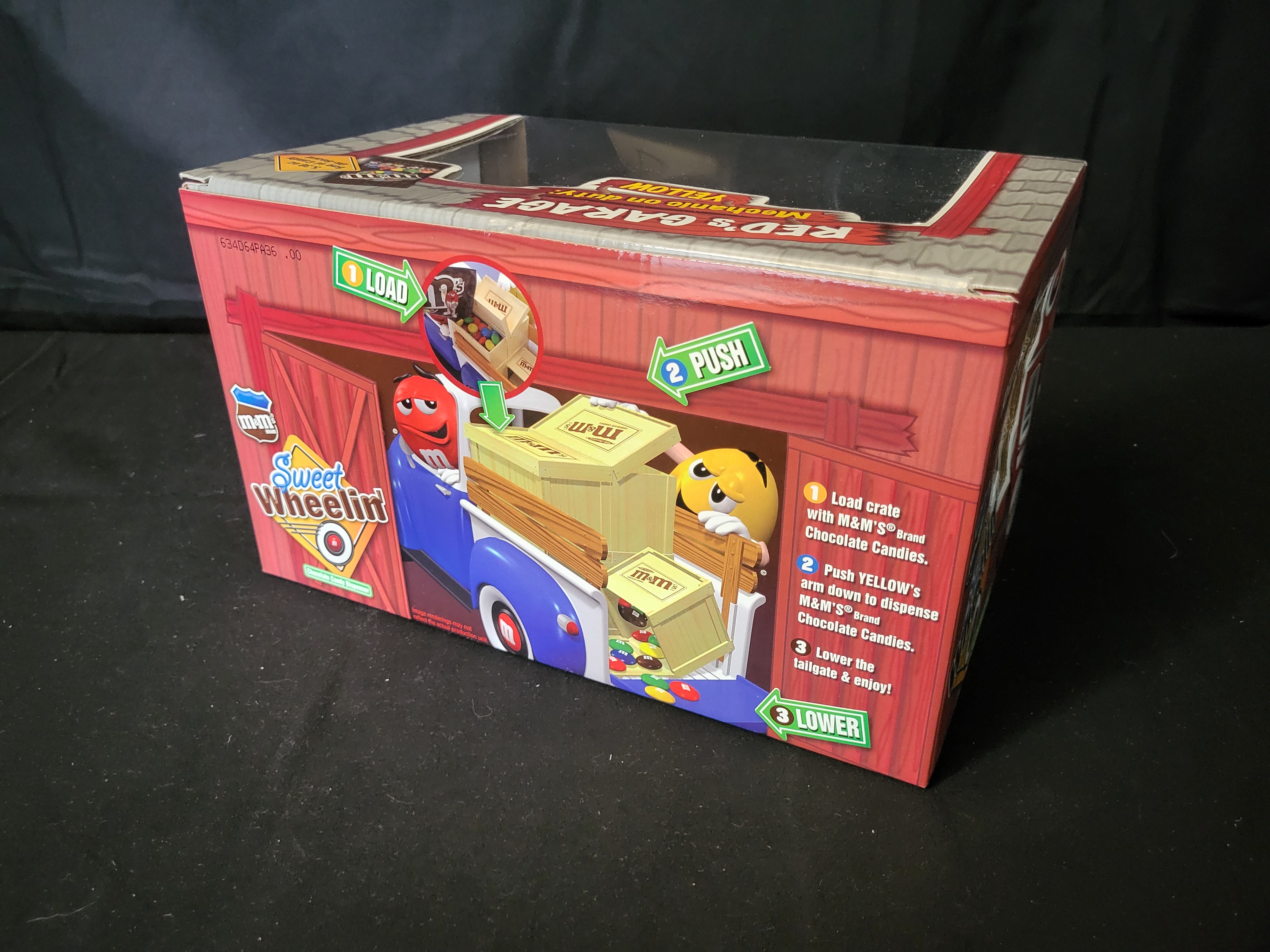 BID PER WHAT YOU SEE IN THE PHOTO, NOT THE AI GENERATED TITLES AND DESCRIPTIONS! This M&M’s Sweet Wheelin’ Red’s Garage collectible chocolate candy dispenser is housed in its original cardboard and plastic window packaging. The plastic dispenser is modeled as a blue and white vintage-style pickup truck. The Red M&M character is depicted in the driver’s seat, while the Yellow M&M character is positioned in the truck bed alongside several crates. The packaging features promotional graphics and instructions for the mechanical dispensing action, which involves loading the crate and pushing the Yellow character’s arm to dispense candy through the tailgate. The item is identified as an official limited-edition collectible by Mars Inc. and includes the original themed graphics for Red’s Garage.