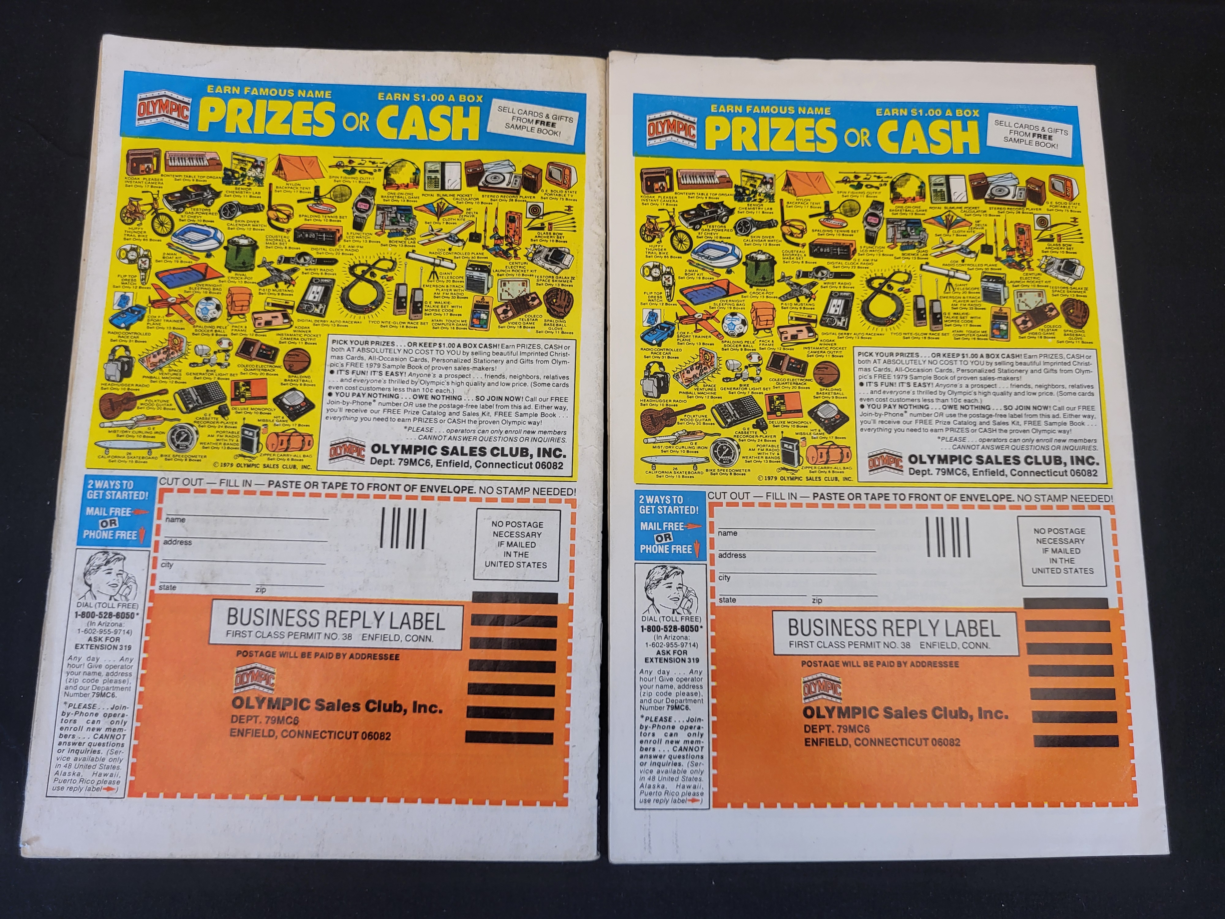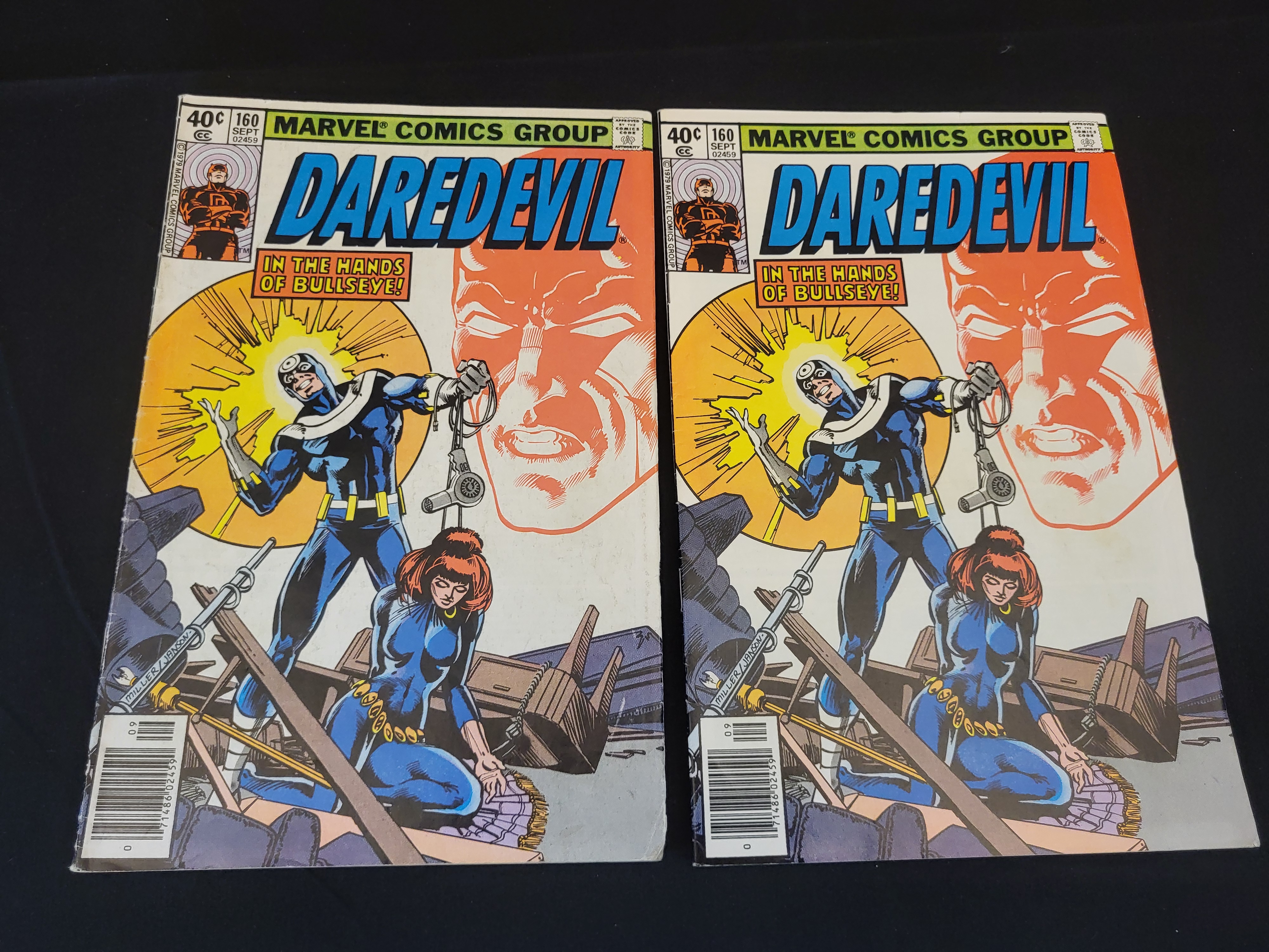 BID PER WHAT YOU SEE IN THE PHOTO, NOT THE AI GENERATED TITLES AND DESCRIPTIONS! A pair of Marvel Comics Group Daredevil issue number 160 comic books, published in September 1979. These Bronze Age issues feature cover art by Frank Miller and Klaus Janson, titled In the Hands of Bullseye! The cover illustration depicts the characters Bullseye and Black Widow. Each copy displays a 40-cent original cover price and a UPC barcode in the lower left corner. The reverse sides of both comics feature a full-page color advertisement for the Olympic Sales Club.