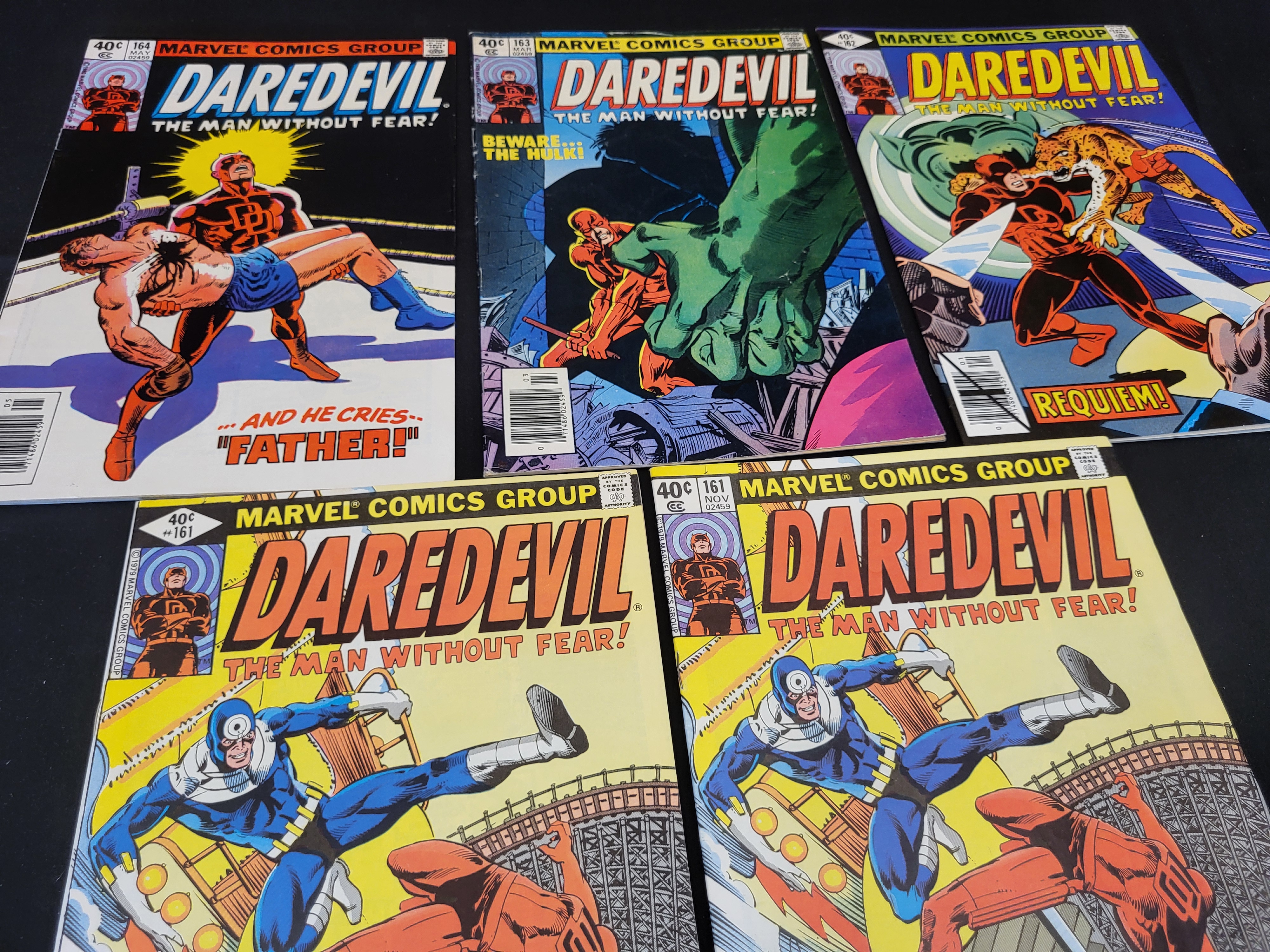BID PER WHAT YOU SEE IN THE PHOTO, NOT THE AI GENERATED TITLES AND DESCRIPTIONS! A group of Daredevil: The Man Without Fear! comic books published by Marvel Comics Group. The collection includes issues #161, #162, #163, and #164. These Bronze Age publications date from 1979 and 1980, featuring an original 40-cent cover price. Issue #162, titled Requiem!, features artwork by Steve Ditko. Cover illustrations depict Daredevil alongside characters such as Bullseye and the Hulk. Each issue includes the Approved by the Comics Code Authority seal, standard publisher markings, and barcodes.