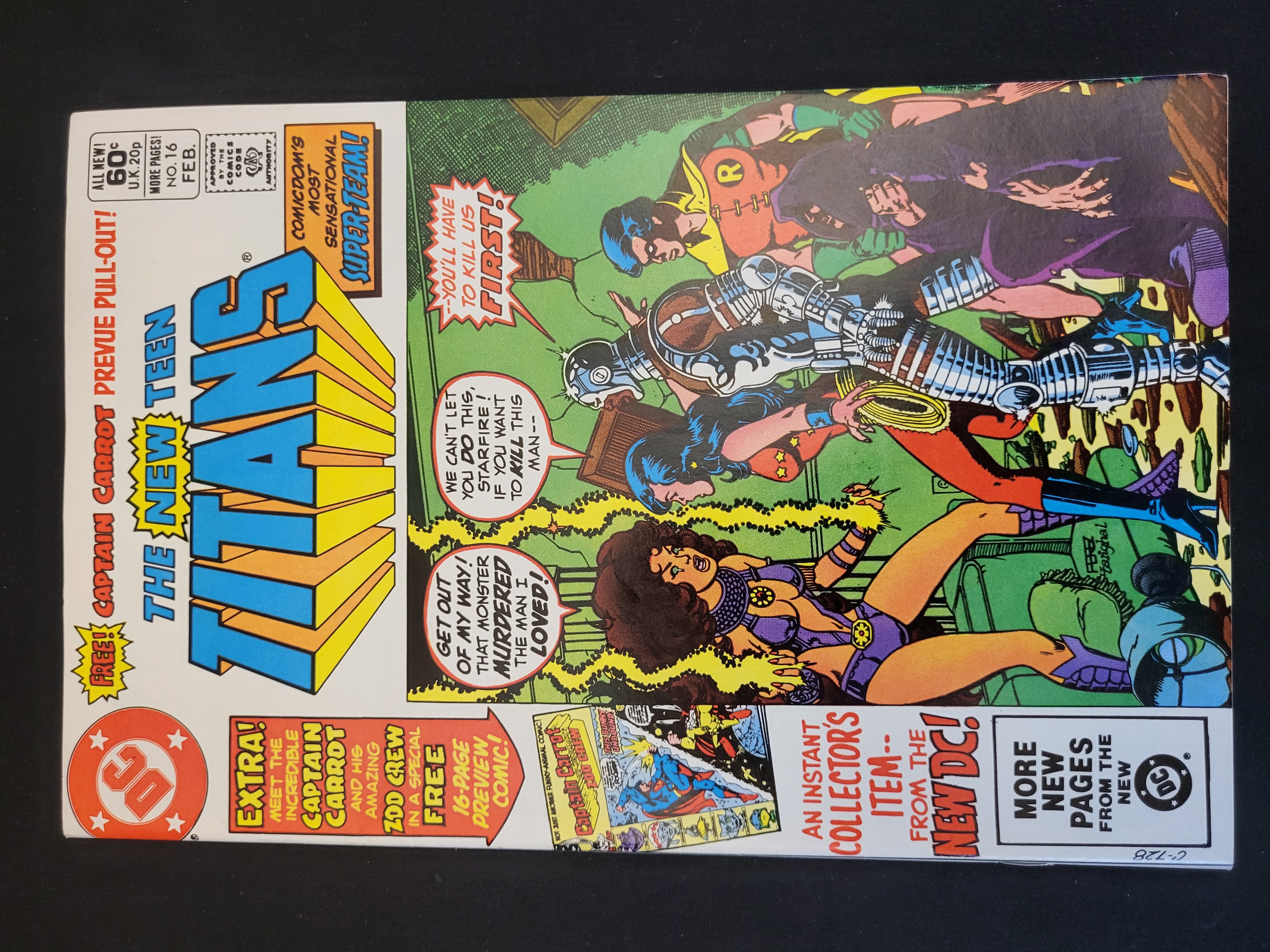 BID PER WHAT YOU SEE IN THE PHOTO, NOT THE AI GENERATED TITLES AND DESCRIPTIONS! This original copy of The New Teen Titans issue number 16 was published by DC Comics in February 1982. The comic book features a story by Marv Wolfman with cover and interior illustrations by George Perez. The front cover depicts a confrontation between members of the superhero team, including Starfire, Cyborg, Raven, and Robin. This issue includes a 16-page preview pull-out marking the first appearance of Captain Carrot and His Amazing Zoo Crew. The front cover also bears the Comics Code Authority seal. The reverse side consists of a full-page color advertisement for the LEGO Expert Builder Series Challenge number 8860.