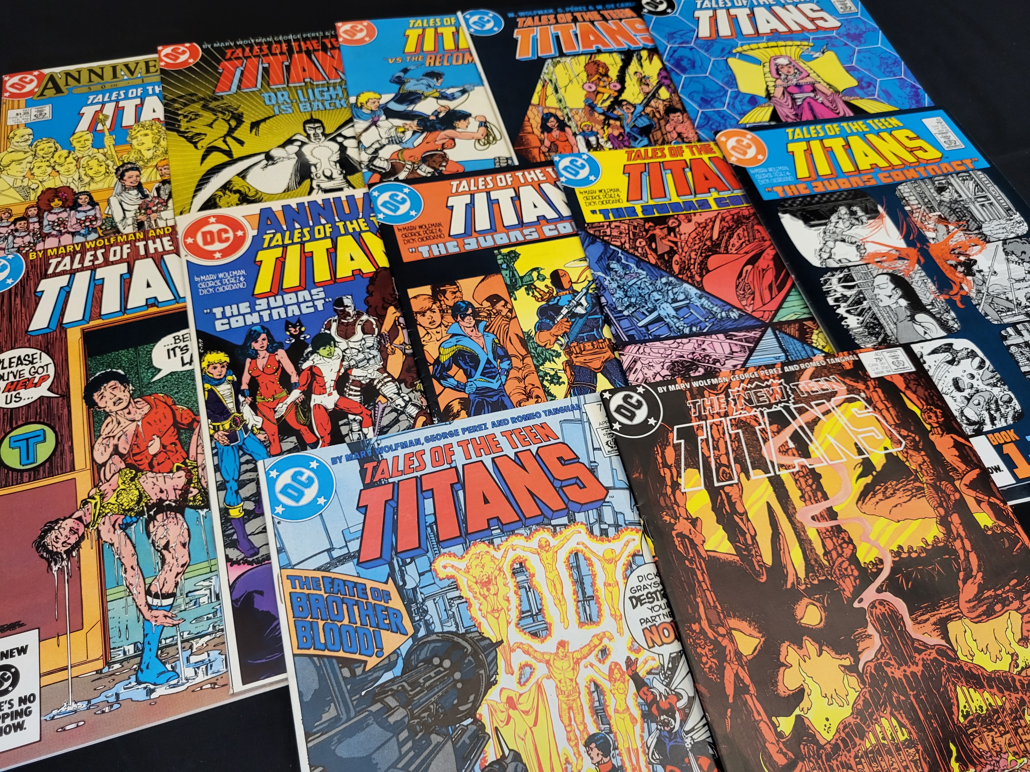 BID PER WHAT YOU SEE IN THE PHOTO, NOT THE AI GENERATED TITLES AND DESCRIPTIONS! A collection of vintage DC comic books from the mid-1980s featuring titles from The New Teen Titans and Tales of the Teen Titans series. This group includes The New Teen Titans issue 40 from March 1984 featuring Brother Blood. The assortment contains multiple installments of The Judas Contract story arc alongside various annuals and individual issues. The creative team for these works includes Marv Wolfman and George Perez. These Copper Age collectibles are printed on paper and are presented in a raw state.