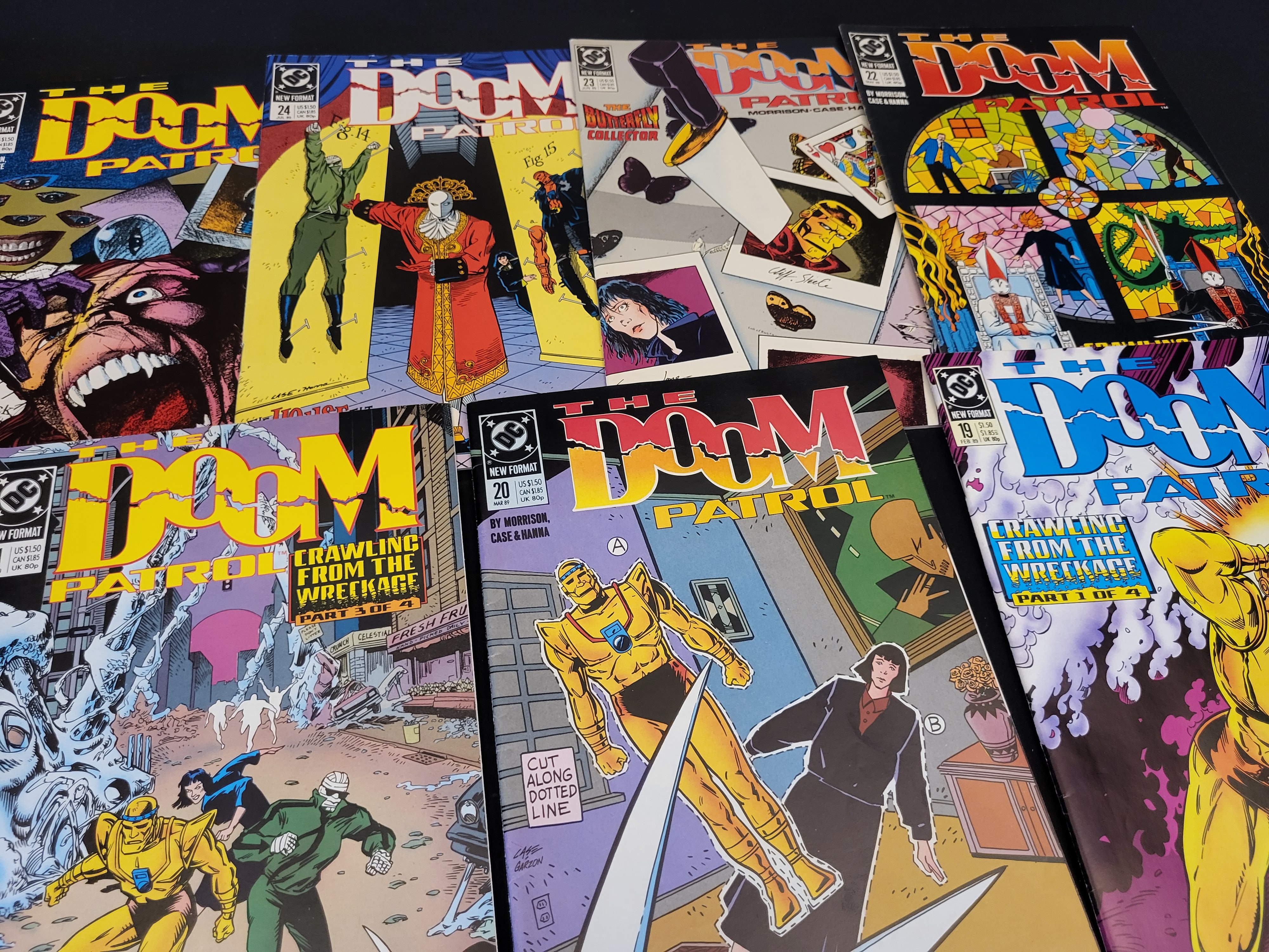 BID PER WHAT YOU SEE IN THE PHOTO, NOT THE AI GENERATED TITLES AND DESCRIPTIONS! A group of comic books from the series The Doom Patrol, published by DC Comics under the New Format imprint. This collection features consecutive issues numbering 19 through 25, dating from 1989. These issues contain the Crawling from the Wreckage story arc, which represents the start of the influential run by writer Grant Morrison. The issues include cover and interior art by creators Richard Case, Carlos Garzon, Doug Braithwaite, and Scott Hanna. Issue 19 is identified as a key issue within the series. Each book displays the original cover price of $1.50 US and $1.85 CAN.